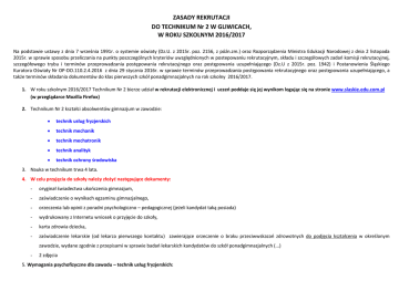 ZASADY REKRUTACJI DO TECHNIKUM Nr 2 W GLIWICACH, W ROKU SZKOLNYM 2016/2017 Na podstawie ustawy z dnia 7 września 1991r. o systemie oświaty (Dz.U. z 2015r. poz. 2156, z późn.zm.) oraz Rozporządzenia Ministra Edukacji Narodowej z dnia 2 listopada 2015r. w sprawie sposobu przeliczania na punkty poszczególnych kryteriów uwzględnionych w postepowaniu rekrutacyjnym, składu i szczegółowych zadań komisji rekrutacyjnej, szczegółowego trybu i terminów przeprowadzania postępowania rekrutacyjnego oraz postępowania uzupełniającego (Dz.U z 2015r. poz. 1942) i Postanowienia Śląskiego Kuratora Oświaty Nr OP-DO.110.2.4.2016 z dnia 29 stycznia 2016r. w sprawie terminów przeprowadzania postępowania rekrutacyjnego oraz postępowania uzupełniającego, a także terminów składania dokumentów do klas pierwszych szkół ponadgimnazjalnych na rok szkolny 2016/2017. 1. W roku szkolnym 2016/2017 Technikum Nr 2 bierze udział w rekrutacji elektronicznej i uczeń poddaje się jej wynikom logując się na stronie www.slaskie.edu.com.pl (w przeglądarce Mozilla Firefox) 2. Technikum Nr 2 kształci absolwentów gimnazjum w zawodzie: technik usług fryzjerskich technik mechanik technik mechatronik technik analityk technik ochrony środowiska 3. Nauka w technikum trwa 4 lata. 4. W celu przyjęcia do szkoły należy złożyć następujące dokumenty: - oryginał świadectwa ukończenia gimnazjum, - zaświadczenie o wynikach egzaminu gimnazjalnego, - orzeczenia lub opinii z poradni psychologiczno – pedagogicznej (jeżeli kandydat taką posiada) - wydrukowany z Internetu wniosek o przyjęcie do szkoły, - karta zdrowia dziecka, - zaświadczenie lekarskie (od lekarza pierwszego kontaktu) zawierające orzeczenie o braku przeciwwskazań zdrowotnych do podjęcia kształcenia w określonym zawodzie, wydane zgodnie z przepisami w sprawie badań lekarskich kandydatów do szkół ponadgimnazjalnych (...) - 2 zdjęcia 5. Wymagania psychofizyczne dla zawodu – technik usług fryzjerskich: brak chorób skórnych, brak skłonności do alergii, wrażliwość estetyczna, precyzyjność, poczucie odpowiedzialności przy realizacji zadań zawodowych, kultura osobista, gotowość do samokształcenia (podnoszenie kwalifikacji zawodowych), wzrost powyżej 150cm, sprawność ruchowa dłoni i palców, spostrzegawczość i podzielność uwagi, prawidłowe widzenie barw i prawidłowa wymowa. 6. Wymagania psychofizyczne dla zawodu – technik mechanik: zainteresowania techniczne, uzdolnienia manualne, koordynacja wzrokowo – ruchowa, wyobraźnia przestrzenna, percepcja kształtów, wytrwałość, refleks, koncentracja i podzielność uwagi, spostrzegawczość, dokładność, poczucie odpowiedzialności za powierzone mienie i podwładnych, gotowość do pracy w trudnych warunkach. 7. Wymagania psychofizyczne dla zawodu – technik mechatronik: uzdolnienia planimetryczne, zainteresowania techniczne i informatyczne, koordynacja wzrokowo – ruchowa, percepcja kształtów, koncentracja uwagi, dokładność, spostrzegawczość, zdolności manipulacyjne, brak chorób skóry rąk, brak wzmożonej potliwości rąk, brak skłonności do alergii. 8. Wymagania psychofizyczne dla zawodu – technik analityk: zainteresowania chemiczne i matematyczne, uzdolnienia manualne, koordynacja wzrokowo – ruchowa, koncentracja i podzielność uwagi, dokładność, systematyczność, cierpliwość, spostrzegawczość, gotowość do pracy w warunkach monotonnych, brak skłonności do chorób układu oddechowego, brak chorób skóry rąk, brak skłonności do alergii. 9. Wymagania psychofizyczne dla zawodu - technik ochrony środowiska: zainteresowania przyrodnicze, ekologiczne, uzdolnienia matematyczne, koordynacja wzrokowo – ruchowa, koncentracja uwagi, brak lęku przestrzeni, klaustrofobii, spostrzegawczość, dokładność, brak skłonności do alergii. 10. Terminy dotyczące naboru uczniów na rok szkolny 2016/2017 . Od dnia 06 maja 2016r. – do dnia 21 czerwca 2016r.- do godz. 1500 – wprowadzanie podań przez Internet oraz składanie dokumentów do szkoły pierwszego wyboru, Od dnia 24 czerwca 2016r. – do dnia 28 czerwca 2016r. do godz.1500 – dostarczenie wymaganych dokumentów: tj. świadectwa ukończenia gimnazjum i zaświadczenia o szczegółowych wynikach egzaminu gimnazjalnego, - zaświadczenie lekarskie (od lekarza pierwszego kontaktu) zawierające orzeczenie o braku przeciwwskazań zdrowotnych do podjęcia kształcenia w określonym zawodzie, wydane zgodnie z przepisami w sprawie badań lekarskich kandydatów do szkół ponadgimnazjalnych (...) - orzeczenie lub opinię z poradni psychologiczno – pedagogicznej (jeżeli kandydat taką posiada) do wybranych szkół ponadgimnazjalnych. Dnia 15 lipca 2016r. godz.1000 – ogłoszenie list kandydatów zakwalifikowanych i kandydatów niezakwalifikowanych do klas I. Od dnia 15 lipca 2016r. do dnia 21 lipca 2016r.– potwierdzenie woli uczęszczania do szkoły i dostarczenia oryginałów: - świadectwa ukończenia gimnazjum, - zaświadczenia o szczegółowych wynikach egzaminu gimnazjalnego, Dnia 22 lipca 2016r. godz. 900 – ogłoszenie list kandydatów przyjętych i nieprzyjętych do klas I i podanie informacji o wolnych miejscach. W terminach określonych w ww. ustawie: składanie wniosków o sporządzenie uzasadnienia odmowy przyjęcia, przygotowanie i wydanie uzasadnień odmowy przyjęcia, składanie do dyrektora odwołań od rozstrzygnięcia komisji rekrutacyjnej, rozstrzygnięcie przez dyrektora odwołania od rozstrzygnięcia komisji rekrutacyjnej. W przypadku wolnych miejsc uczniowie będą przyjmowani do końca sierpnia 2016r. – kiedy, to nastąpi zakończenie rekrutacji do szkoły. 11. Zasady przyznawania punktów za oceny uzyskane w gimnazjum i szczególne osiągnięcia ucznia. Zajęcia edukacyjne dla poszczególnych oddziałów, z których oceny będą przeliczane na punkty: Technik usług Technik Technik Technik Technik ochrony fryzjerskich mechanik mechatronik 1