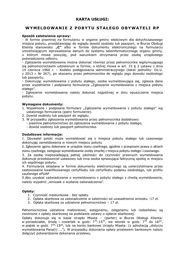 KARTA USŁUGI: WYMELDOWANIE Z POBYTU STAŁEGO OBYWATELI RP Sposób załatwienia sprawy: - W formie pisemnej na formularzu w organie gminy właściwym dla dotychczasowego miejsca pobytu, przedstawiając do wglądu dowód osobisty lub paszport, w Biurze Obsługi Klienta stanowisko „C” albo w formie dokumentu elektronicznego na formularzu umożliwiającym wprowadzenie danych do systemu teleinformatycznego organu gminy, o którym mowa powyżej, pod warunkiem otrzymania przez osobę urzędowego poświadczenia odbioru. - Zgłoszenie wymeldowania można dokonać również przez pełnomocnika legitymującego się pełnomocnictwem udzielonym w formie, o której mowa w art. 33 § 2 ustawy z dnia 14 czerwca 1960 r. – Kodeks postępowania administracyjnego (tekst jednolity: Dz.U. z 2013 r. Nr 267), po okazaniu przez pełnomocnika do wglądu jego dowodu osobistego lub paszportu. - Dokonując wymeldowania z pobytu stałego, osoba wymeldowująca się, zgłasza dane przez wypełnienie i podpisanie formularza „Zgłoszenie wymeldowania z miejsca pobytu stałego”. - Zgłoszenie wymeldowania należy dokonać najpóźniej w dniu opuszczenia miejsca pobytu. Wymagane dokumenty: 1. Wypełnione i podpisane formularz „Zgłoszenie wymeldowania z pobytu stałego” wg ustalonego formularza (patrz formularze). 2. Dowód osobisty lub paszport do wglądu. 3. W przypadku zgłoszenia wymeldowania przez pełnomocnika dodatkowo: - pisemne pełnomocnictwo do zgłoszenia wymeldowania z pobytu stałego, - dowód osobisty lub paszport pełnomocnika. Dodatkowe informacje: 1. Obywatel polski może wymeldować się z miejsca pobytu stałego lub czasowego dokonując zameldowania w nowym miejscu pobytu 2. Zgłoszenie zgonu dokonane w urzędzie stanu cywilnego, zgodnie z przepisami prawa o aktach stanu cywilnego, zastępuje wymeldowanie osoby zmarłej z miejsca pobytu stałego i czasowego. 3. Za osobę nieposiadającą pełnej zdolności do czynności prawnych wymeldowania dokonuje przedstawiciel ustawowy lub inna osoba sprawująca faktyczną opiekę w miejscu ich wspólnego pobytu. 4. Formularze składane w formie dokumentu elektronicznego są uwierzytelniane przez zastosowanie kwalifikowanego certyfikatu lub certyfikatu podpisu osobistego, lub profilu zaufanego ePUAP 5.Aby uzyskać zaświadczenie o wymeldowaniu z pobytu stałego z chwilą wymeldowania, należy wypełnić „wniosek o wydanie zaświadczenia”. Opłaty: 1. Czynność meldunkowa - bez opłaty. 2. Opłata skarbowa za zaświadczenie w zależności od uzasadnienia wniosku -17 zł. 3. Opłata skarbowa za udzielone pełnomocnictwo – 17 zł. Pełnomocnictwa udzielone małżonkowi, wstępnemu, zstępnemu lub rodzeństwu są zwolnione z opłaty skarbowej na podstawie ustawy o opłacie skarbowej. Opłaty dokonuje się w kasie Urzędu Miasta – (parter) w Biurze Obsługi Klienta: w poniedziałek, środę i czwartek w godz. 7 3o-153o, we wtorek w godz. 73o do 16³o, w piątek w godz. 73o-15⁰⁰, lub na konto bankowe Urzędu Miasta: (z adnotacją „dotyczy wymeldowania Pana(i) ….”). W przypadku dokonania opłaty przelewem bankowym należy dołączyć potwierdzenie dokonania przelewu. Termin załatwienia: Z chwilą zgłoszenia wymeldowania w Biurze Obsługi Klienta. Jednostka odpowiedzialna: Wydział Spraw Obywatelskich, tel. 074 645 08 28. Tryb odwoławczy i skargowy: Brak trybu odwoławczego. Podstawa prawna: - Ustawa z dnia 24 września 2010 r. o ewidencji ludności; - Ustawa z dnia 14 czerwca 1960 r. – Kodeks postępowania administracyjnego; - Ustawa z dnia 16 listopada 2006 r. o opłacie skarbowej; - ROZPORZĄDZENIE MINISTRA SPRAW WEWNĘTRZNYCH I ADMINISTRACJI z dnia 29 września 2011 r. w sprawie określenia wzorów i sposobu wypełniania formularzy stosowanych przy wykonywaniu obowiązku meldunkowego Formularze: Do pobrania w Biurze Obsługi Klienta, stanowisko „C” i z tej strony (plik do pobrania) wg ustalonego wzoru.