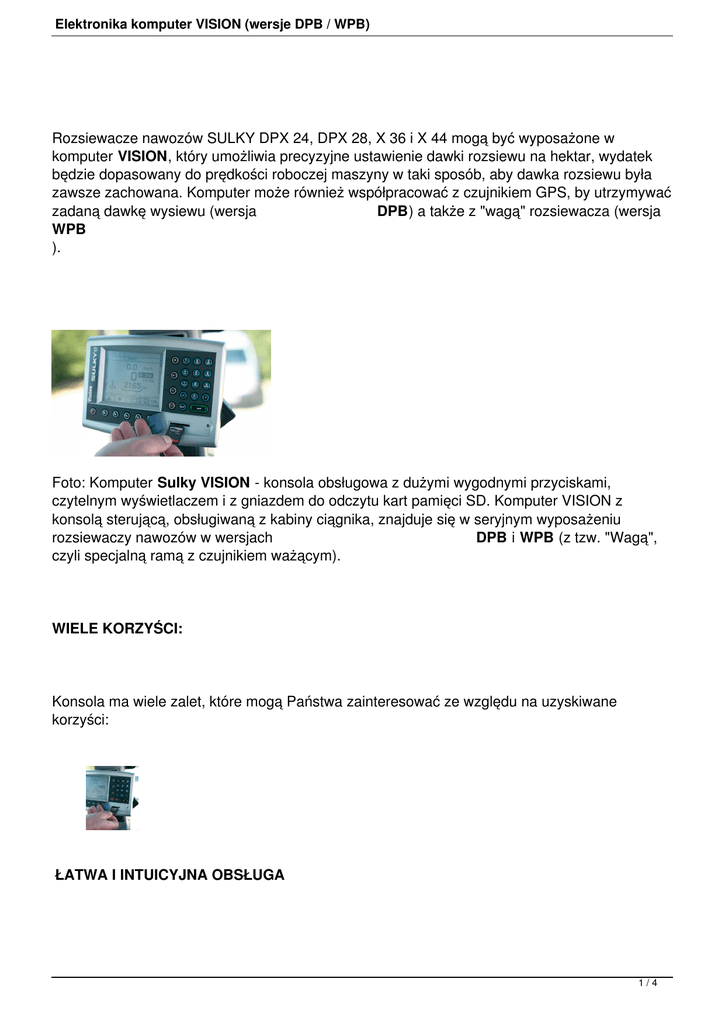 Elektronika komputer VISION (wersje DPB / WPB) Rozsiewacze nawozów SULKY DPX 24, DPX 28, X 36 i X 44 mogą być wyposażone w komputer VISION, który umożliwia precyzyjne ustawienie dawki rozsiewu na hektar, wydatek będzie dopasowany do prędkości roboczej maszyny w taki sposób, aby dawka rozsiewu była zawsze zachowana. Komputer może również współpracować z czujnikiem GPS, by utrzymywać zadaną dawkę wysiewu (wersja DPB) a także z "wagą" rozsiewacza (wersja WPB ). Foto: Komputer Sulky VISION - konsola obsługowa z dużymi wygodnymi przyciskami, czytelnym wyświetlaczem i z gniazdem do odczytu kart pamięci SD. Komputer VISION z konsolą sterującą, obsługiwaną z kabiny ciągnika, znajduje się w seryjnym wyposażeniu rozsiewaczy nawozów w wersjach DPB i WPB (z tzw. "Wagą", czyli specjalną ramą z czujnikiem ważącym). WIELE KORZYŚCI: Konsola ma wiele zalet, które mogą Państwa zainteresować ze względu na uzyskiwane korzyści: ŁATWA I INTUICYJNA OBSŁUGA 1/4 Elektronika komputer VISION (wersje DPB / WPB) > Łatwa w obsłudze jak telefon komórkowy dzięki alfanumerycznej klawiaturze, piktogramom i przewija > Ultranowoczesny, duży podświetlany ekran jest zgodny z oprogramowaniem Windows, zapewnia bez > Zmiana dawki ustawiana ręcznie, po prawej i po lewej stronie, obie strony razem lub oddzielnie. > Automatyczne utrzymywanie dawki: możliwość zapisania w pamięci 8 nawozów (najczęściej rozsiewa CZYTELNE I PRAKTYCZNE MENU > W pobliżu granicy pola, bez opuszczania kabiny ciągnika można uruchomić rozsiew graniczny z wyk > Informacje są dostępne w każdej chwili: ilość nawozu pozostającego w zbiorniku, odległość (m) lub > Zapis danych dotyczących rozsianej na danym polu dawki nawozu w pamięci wewnętrznej konsoli lu CZUJNIK GPS - SZYBKI I DOKŁADNY Czujnik GPS odczytuje prędkość poruszania się ciągnika z maszyną oraz lokalizuje je odczytując dane p "GPS READY" - ROLNICTWO PRECYZYJNE „GPS READY”, czyli gotowość do współpracy z sygnałem satelitarnym GPS – konsola jest gotowa do w 2/4 Elektronika komputer VISION (wersje DPB / WPB) Nie muszą Państwo przepłacać, by mieć dostęp do rolnictwa precyzyjnego. Dzięki nowej antenie GPS k KOMPATYBILNOŚĆ Z WIELOMA SYSTEMAMI Zgodność z licznymi systemami Greenstar, dostępnymi Agrimap+,naFarmstar, rynku ). ( Soyl/Cerelia, Satplan, Bgrid, Agrocom, Soneo, Zapis w pamięci wykonanych prac: karta pamięci SD umożliwia również zapisanie danych z pól, na który OSZCZĘDNOŚĆ NA CZASIE W rozsiewaczach wyposażonych w "Wagę" nie traci się czasu na kalibrację. "Waga", czyli układ ważący z czujnikiem na rozsiewaczu dokonującym dynamicznego pomiaru, dostarc Oszczędność na czasie jest ogromna! Dzięki takiemu rozwiązaniu wzrasta wydajność polowa. PRAKTYCZNE INFORMACJE UZUPEŁNIAJĄCE: 3/4 Elektronika komputer VISION (wersje DPB / WPB) Rozsiewacze nawozów, które mogą być wyposażone w komputer VISION wersja DPB: DPX 24, DPX 28, X 36 i X 44 . Rozsiewacze nawozów, które mogą być wyposażone w komputer VISION wersja WPB (rozsie wacz ma wtedy specjalną ramę z czujnikiem ważącym, tzw. "Waga"): DPX 28, X 36 i X 44 . Karta pamięci SD nie znajduje się w zestawie, należy zaopatrzyć się w nią we własnym zakresie. Istnieje również możliwość zastosowania czujnika na kole ciągnika, w przypadku, gdy nie ma być używany czujnik GPS. Nie ma wtedy możliwości wykorzystania funkcji geolokalizacji maszyny a przez to nie można również wykorzystać automatyki związanej z wykorzystaniem map dawkowania. 4/4