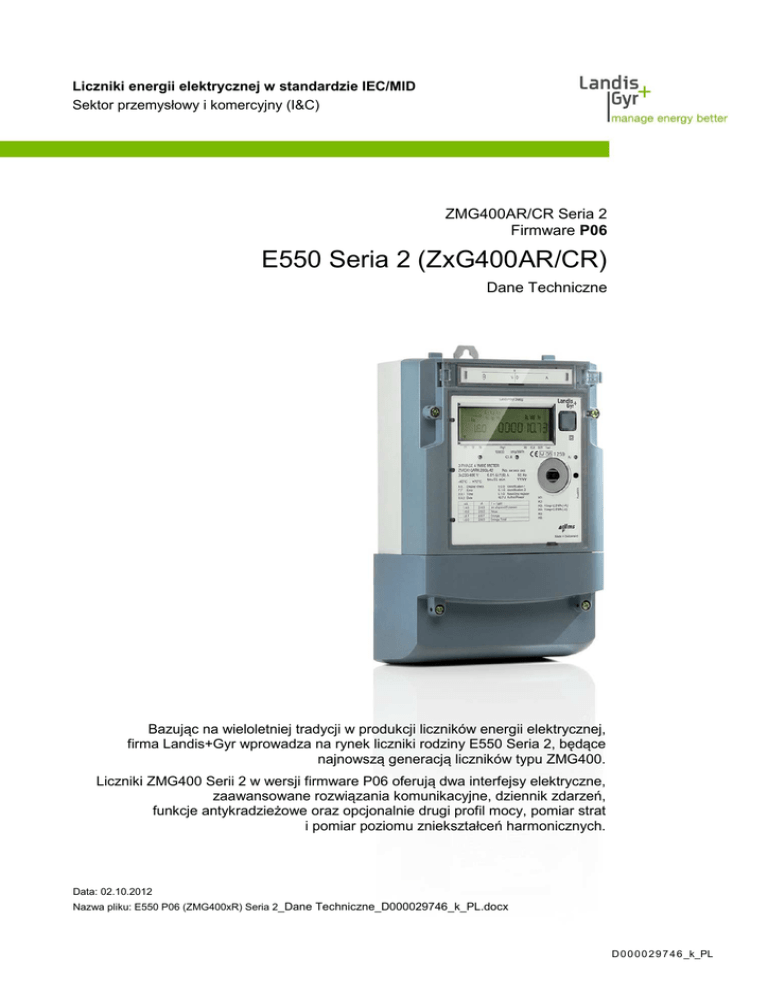 Liczniki energii elektrycznej w standardzie IEC/MID Sektor przemysłowy i komercyjny (I&C) ZMG400AR/CR Seria 2 Firmware P06 E550 Seria 2 (ZxG400AR/CR) Dane Techniczne Bazując na wieloletniej tradycji w produkcji liczników energii elektrycznej, firma Landis+Gyr wprowadza na rynek liczniki rodziny E550 Seria 2, będące najnowszą generacją liczników typu ZMG400. Liczniki ZMG400 Serii 2 w wersji firmware P06 oferują dwa interfejsy elektryczne, zaawansowane rozwiązania komunikacyjne, dziennik zdarzeń, funkcje antykradzieżowe oraz opcjonalnie drugi profil mocy, pomiar strat i pomiar poziomu zniekształceń harmonicznych. Data: 02.10.2012 Nazwa pliku: E550 P06 (ZMG400xR) Seria 2_Dane Techniczne_D000029746_k_PL.docx D 0 0 0 0 2 9 7 4 6 _k_PL 2/7 Przekładnikowe przemysłowe liczniki energii elektrycznej rodziny E550 rejestrują energię czynną i bierną, w obu kierunkach i we wszystkich kwadrantach, w sieciach 1-fazowych 2przewodowych, 2-fazowych 3-przewodowych, 3fazowych 4-przewodowych i 3-fazowych 3przewodowych (bez przewodu neutralnego). Wersja podstawowa Wersja podstawowa zawiera taryfowe rejestry energii, czerwone diody wzorcowe dla energii czynnej i biernej, interfejs optyczny dla lokalnego odczytu licznika oraz interfejs elektryczny. Interfejsy Liczniki E550 Serii 2 obsługują dwa niezależne interfejsy elektryczne. Liczniki mogą być wyposażone w następujące typy interfejsów: RS232, RS485, RS422, CS oraz specjalny zasilany interfejs RS232 dla podłączenia i zasilenia zewnętrznych modemów oferowanych przez firmę Landis+Gyr. Pomoc instalacyjna Wskazanie napięć, prądów, mocy, współczynnika mocy, kierunku wirowania pola oraz kierunku przepływu energii stanowi istotną pomoc podczas instalacji. E550 – ZMG400AR/CR Seria 2 – Specyfikacja techniczna ZMG410xR Energia czynna, wg IEC 62053-21 Energia bierna, wg IEC 62053-23 Ogólna charakterystyka Napięcie Napięcie znamionowe Un licznika ZMG400xR 3 x 58/100 V do 69/120 V 3 x 110/190 V do 133/230 V 3 x 220/380 V do 240/415 V 3 x 58/100 V do 277/480 V Zakres napięcia 80% do 115 % Un Częstotliwość Częstotliwość znamionowa fn Tolerancja 50 lub 60 Hz ± 2% Zastosowanie W sieciach 1-fazowych 2-przewodowych; 2fazowych 3-przewodowych; 3-fazowych 4przewodowych i 3-fazowych 3-przewodowych (bez przewodu neutralnego) Prąd Prąd rozruchu licznika ZMG405xR Zgodnie z IEC Typowy 0.1% In 0.07% In Prąd rozruchu licznika ZMG410xR Zgodnie z IEC Typowy 0.2% In 0.14% In Rozruch licznika jest faktycznie uzależniony od mocy rozruchu, a nie od wartości prądu rozruchu. Moc rozruchu dla podłączenia M jednofazowa Napięcie znamionowe x prąd rozruchu Dane dotyczące zgodności z MID Prąd odniesienia Iref do wyboru: 1.0, 5.0 A Prąd minimalny Imin 0.01 x Iref Prąd przejścia Itr 0.05 x Iref do wyboru: 1 or 5 A Prąd maksymalny Imax pomiarowy dla 1 A pomiarowy dla 5 A termiczny dla 1 A termiczny dla 5 A Prąd zwarciowy (przez 0.5 s) maks. 600% maks. 200% 8A 12 A 20 x Imax Dokładność pomiaru ZMG405xR Energia czynna, wg IEC 62053-22 Energia bierna, wg IEC 62053-23 © Landis+Gyr Charakterystyka pomiarowa Prąd (dla klas B i C) Dane dotyczące zgodności z IEC Prąd znamionowy In klasa 1 klasa 2 klasa 0.5 S klasa 1 Prąd maksymalny Imax 2.0, 6.0, 10.0 A Dokładność pomiaru wg normy EN 50470-3 ZMG400xR klasy B i C Charakterystyka pomiarowa Prąd startowy Ist Klasa B: Ist Klasa C: Ist 0.002 lub 0.01 A 0.001 lub 0.005 A D000029746_k_PL — E550 Seria 2 (ZxG400AR/CR) — Dane Techniczne 3/7 Charakterystyka działania Szybkie przebiegi przewodzone wg IEC 61000-4-4 Obwody prądowe i napięciowe 4 kV Obwody pomocnicze o napięciu > 40 V 2 kV Zanik napięcia (wyłączenie) Czas podtrzymania zgodnie z IEC 0.5 s Zachowanie danych po kolejnych około 0.2 s Wyłączenie po około 10 s Odporność na udar napięciowy wg IEC 61000-4-5 Obwody prądowe i napięciowe 4 kV Obwody pomocnicze o napięciu > 40 V 1 kV Ogólna charakterystyka Powrót napięcia (załączenie) Gotowość do działania przy 3 fazach po 4 s Gotowość do działania przy 1 fazie po 5 s Detekcja kierunku energii i napięć fazowych po 4 do 5 s Pobór mocy Sumaryczny pobór mocy w obwodach napięciowych Przy napięciu fazowym 58 V 240 V Moc pozorna (typowa) - dla wersji z płytką 041b 1.9 VA 2.3 VA - dla pozostałych wersji 1.3 VA 2.1 VA Pobór mocy na fazę w obwodzie prądowym Przy prądzie fazowym 1(6)A 1A 6A Moc czynna (typowa) 0.02 W 0.6 W Moc pozorna (typowa) 0.01 VA 0.25 VA Przy prądzie fazowym 5(10)A Moc czynna (typowa) Moc pozorna (typowa) 5A 0.1 W 0.02 VA 10 A 0.35 W 0.1 VA Wpływ warunków otoczenia Zakres temperaturowy Pracy Magazynowania zgodnie z IEC 62052-11 –40 °C do +70 °C –40 °C do +85 °C Współczynnik temperaturowy Zakres –25 °C do +70 °C Wartość średnia (typowa) ± 0.012% / K przy cosϕ=1 (od 0.05 Ib do Imax) ± 0.02% / K przy cosϕ=0.5 (od 0.1 Ib do Imax) ± 0.03% / K Szczelność obudowy wg IEC 60529 IP 53 Wytrzymałość izolacji Wytrzymałość izolacji 4 kV przy 50 Hz przez 1 min Impuls napięciowy 1.2/50 µs wg IEC 62052-11 Obwody prądowe i napięciowe 10 kV Obwody pomocnicze o napięciu > 40 V 6 kV Klasa ochronności ll wg IEC 60050-131 2 Zegar kalendarzowy Rodzaj kalendarza Gregoriański lub perski (Jalaali) Dokładność chodu < 5 ppm Czas podtrzymania (rezerwa chodu) Z kondensatorem Supercap > 21 dni Czas ładowania do 7 dni rezerwy chodu 24 h Czas ładowania do maks. rezerwy chodu 300 h Z baterią nr 1 (zapewnia działanie zegara kalendarzowego, wyświetlacza, interfejsu optycznego bez zasilania sieciowego) 10 lat Typ baterii UM3-R6-AA Z baterią nr 2 (tylko dla zegara kalendarzowego) 10 lat Typ baterii CR2032 Wyświetlacz Charakterystyka Rodzaj wyświetlacz ciekłokrystaliczny LCD Wielkość cyfr pola wartości 9 mm Liczba pozycji w polu wartości do 8 Wielkość cyfr pola indeksu 8 mm Liczba pozycji w polu indeksu do 7 Kompatybilność elektromagnetyczna Wejścia i wyjścia Wyładowanie elektrostatyczne Wyładowanie dotyko