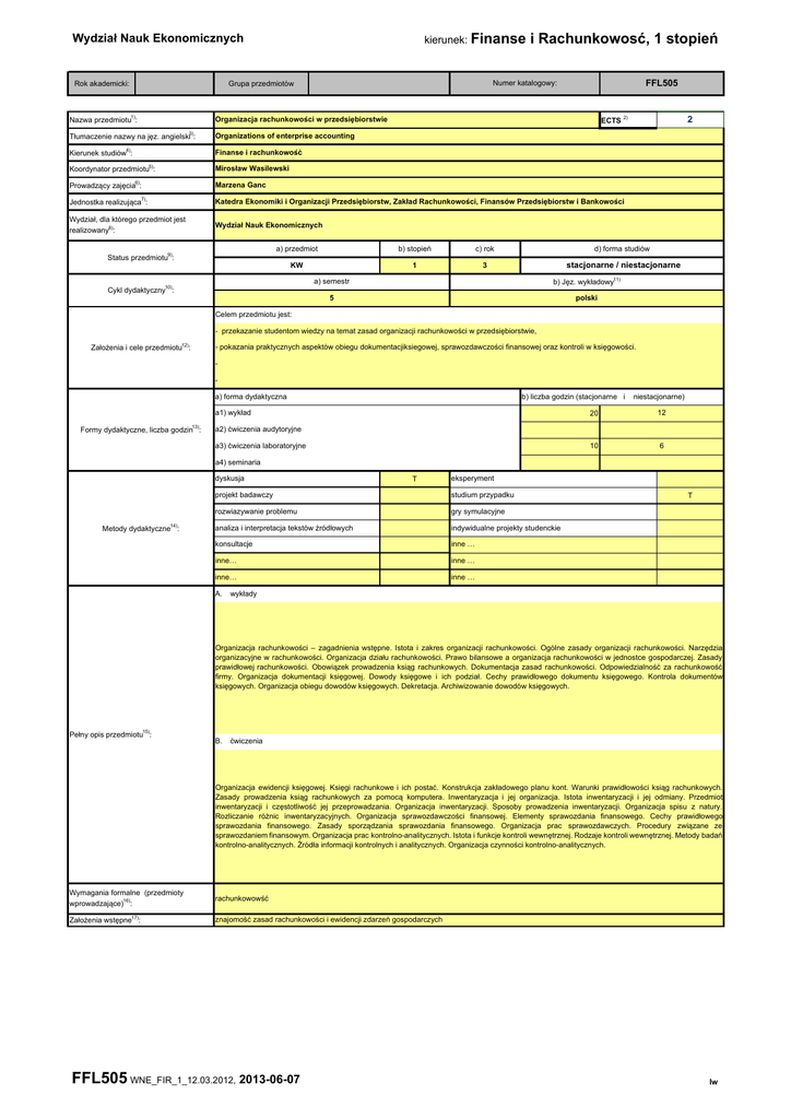 kierunek: Finanse Wydział Nauk Ekonomicznych Rok akademicki: FFL505 Numer katalogowy: Grupa przedmiotów Nazwa przedmiotu1): i Rachunkowosć, 1 stopień Tłumaczenie nazwy na jęz. angielski : Organizations of enterprise accounting Kierunek studiów4): Finanse i rachunkowość Koordynator przedmiotu5): Mirosław Wasilewski Prowadzący zajęcia6): Marzena Ganc Jednostka realizująca7): Katedra Ekonomiki i Organizacji Przedsiębiorstw, Zakład Rachunkowości, Finansów Przedsiębiorstw i Bankowości Wydział, dla którego przedmiot jest realizowany8): Wydział Nauk Ekonomicznych Status przedmiotu9): 2 ECTS 2) Organizacja rachunkowości w przedsiębiorstwie 3) a) przedmiot b) stopień c) rok d) forma studiów KW 1 3 stacjonarne / niestacjonarne Cykl dydaktyczny10): a) semestr b) Jęz. wykładowy11) 5 polski Celem przedmiotu jest: - przekazanie studentom wiedzy na temat zasad organizacji rachunkowości w przedsiębiorstwie, Założenia i cele przedmiotu12): - pokazania praktycznych aspektów obiegu dokumentacjiksiegowej, sprawozdawczości finansowej oraz kontroli w księgowości. a) forma dydaktyczna b) liczba godzin (stacjonarne i a1) wykład Formy dydaktyczne, liczba godzin13): niestacjonarne) 20 12 10 6 a2) ćwiczenia audytoryjne a3) ćwiczenia laboratoryjne a4) seminaria dyskusja Metody dydaktyczne14): T eksperyment projekt badawczy studium przypadku rozwiazywanie problemu gry symulacyjne analiza i interpretacja tekstów źródłowych indywidualne projekty studenckie konsultacje inne … inne… inne … inne… inne … A. T wykłady Organizacja rachunkowości – zagadnienia wstępne. Istota i zakres organizacji rachunkowości. Ogólne zasady organizacji rachunkowości. Narzędzia organizacyjne w rachunkowości. Organizacja działu rachunkowości. Prawo bilansowe a organizacja rachunkowości w jednostce gospodarczej. Zasady prawidłowej rachunkowości. Obowiązek prowadzenia ksiąg rachunkowych. Dokumentacja zasad rachunkowości. Odpowiedzialność za rachunkowość firmy. Organizacja dokumentacji księgowej. Dowody księgowe i ich podział. Cechy prawidłowego dokumentu księgowego. Kontrola dokumentów księgowych. Organizacja obiegu dowodów księgowych. Dekretacja. Archiwizowanie dowodów księgowych. Pełny opis przedmiotu15): B. ćwiczenia Organizacja ewidencji księgowej. Księgi rachunkowe i ich postać. Konstrukcja zakładowego planu kont. Warunki prawidłowości ksiąg rachunkowych. Zasady prowadzenia ksiąg rachunkowych za pomocą komputera. Inwentaryzacja i jej organizacja. Istota inwentaryzacji i jej odmiany. Przedmiot inwentaryzacji i częstotliwość jej przeprowadzania. Organizacja inwentaryzacji. Sposoby prowadzenia inwentaryzacji. Organizacja spisu z natury. Rozliczanie różnic inwentaryzacyjnych. Organizacja sprawozdawczości finansowej. Elementy sprawozdania finansowego. Cechy prawidłowego sprawozdania finansowego. Zasady sporządzania sprawozdania finansowego. Organizacja prac sprawozdawczych. Procedury związane ze sprawozdaniem finansowym. Organizacja prac kontrolno-analitycznych. Istota i funkcje kontroli wewnętrznej. Rodzaje kontroli wewnętrznej. Metody badań kontrolno-analitycznych. Źródła informacji kontrolnych i analitycznych. Organizacja czynności kontrolno-analitycznych. Wymagania formalne (przedmioty wprowadzające)16): rachunkowowść Założenia wstępne17): znajomość zasad rachunkowości i ewidencji zdarzeń gospodarczych FFL505 WNE_FIR_1_12.03.2012, 2013-06-07 lw kierunek: Finanse Wydział Nauk Ekonomicznych 01 - definiowanie istoty i zakresu polityki rachunkowości w przedsiębiorstwe i Rachunkowosć, 1 stopień 05 - 02 - umiejętność organizacji systemu księgowości w przedsiębiorstwie 06 Efekty kształcenia18): (z kolejnymi numerami, 01, 02, 03 itd.) Sposób weryfikacji efektów kształcenia19): 03 - umiejętność opracowywania i dostarczania odbiorcom sprawozdania finansowego rzetelnych i wiarygodnych informacji ekonomicznych 07 - 04 - zdolność do sporządzania sprawozdań finansowych 08 - kolokwium na zajęciach ćwiczeniowych ocena wykonanie zadania projektowego na zdefiniowany temat 01, 02, 03, 04 praca pisemna przygotowywana w ramach pracy własnej studenta ocena wynikająca z obserwacji w trakcie zajęć ocena eksperymentów wykonywanych w trakcie zajęć przygotowanie zespołowej analizy zdefiniowanego problemu ocena wystąpień i prezentacji w trakcie zajęć obserwacja w trakcie dyskusji zdefiniowanego problemu (aktywność) egzamin pisemny test komputerowy egzamin ustny inne.. inne… okresowe prace pisemne 01, 02, 03, imienne karty oceny studenta treść pytań egzaminacyjnych z oceną inne.. inne… kolokwium na zajęciach ćwiczeniowych 04 inne.. 01, 02, 03, 04 Forma dokumentacji osiągniętych efektów złożone projekty kształcenia 20): inne… Element oceny 01, 02 inne.. Waga w % 70% praca pisemna przygotowywana w ramach pracy własnej studenta Elementy i wagi mające wpływ na ocenę ocena eksperymentów wykonywanych w trakcie zajęć końcową21): Element oceny ocena wynikająca z obserwacji w trakcie zajęć przygotowanie zespołowej analizy zdefiniowanego problemu ocena wystąpień i prezentacji w trakcie zajęć obserwacja w trakcie dyskusji zdefiniowanego problemu (aktywność) egzamin pisemny test egzamin ustny inne.. inne… inne.. Miejsce realizacji zajęć22): Waga w % ocena wykonania zadania projektowego na zdefiniowany temat 10% 10% 10% sala dydaktyczna 23) Literatura podstawowa i uzupełniająca : a) podstawowa 1. Ustawa o rachunkowości z dnia 29 września 1994 z póź. zmian. 2. Dobija M. (red.), 2008: Organizacja rachunkowości. Wydawnictwo AE w Krakowie, Kraków. b) uzupełniająca 3. Bereżnicka J., Franc-Dąbrowska J., 2006: Podstawy rachunkowości. Wydawnictwo SGGW, Warszawa. 4. 5. 6. 7. 8. UWAGI24): FFL505 WNE_FIR_1_12.03.2012, 2013-06-07 lw