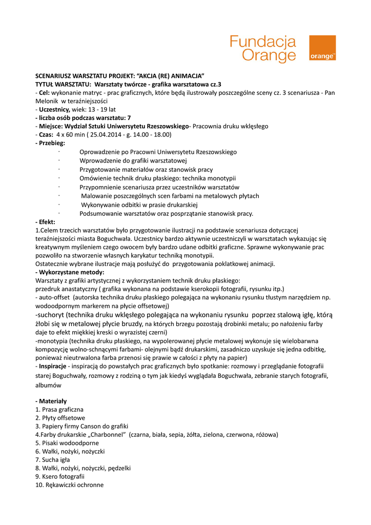 SCENARIUSZ WARSZTATU PROJEKT: “AKCJA (RE) ANIMACJA” TYTUŁ WARSZTATU: Warsztaty twórcze - grafika warsztatowa cz.3 - Cel: wykonanie matryc - prac graficznych, które będą ilustrowały poszczególne sceny cz. 3 scenariusza - Pan Melonik w teraźniejszości - Uczestnicy, wiek: 13 - 19 lat - liczba osób podczas warsztatu: 7 - Miejsce: Wydział Sztuki Uniwersytetu Rzeszowskiego- Pracownia druku wklęsłego - Czas: 4 x 60 min ( 25.04.2014 - g. 14.00 - 18.00) - Przebieg: · Oprowadzenie po Pracowni Uniwersytetu Rzeszowskiego · Wprowadzenie do grafiki warsztatowej · Przygotowanie materiałów oraz stanowisk pracy · Omówienie technik druku płaskiego: technika monotypii · Przypomnienie scenariusza przez uczestników warsztatów · Malowanie poszczególnych scen farbami na metalowych płytach · Wykonywanie odbitki w prasie drukarskiej · Podsumowanie warsztatów oraz posprzątanie stanowisk pracy. - Efekt: 1.Celem trzecich warsztatów było przygotowanie ilustracji na podstawie scenariusza dotyczącej teraźniejszości miasta Boguchwała. Uczestnicy bardzo aktywnie uczestniczyli w warsztatach wykazując się kreatywnym myśleniem czego owocem były bardzo udane odbitki graficzne. Sprawne wykonywanie prac pozwoliło na stworzenie własnych karykatur techniką monotypii. Ostatecznie wybrane ilustracje mają posłużyć do przygotowania poklatkowej animacji. - Wykorzystane metody: Warsztaty z grafiki artystycznej z wykorzystaniem technik druku płaskiego: przedruk anastatyczny ( grafika wykonana na podstawie kserokopii fotografii, rysunku itp.) - auto-offset (autorska technika druku płaskiego polegająca na wykonaniu rysunku tłustym narzędziem np. wodoodpornym markerem na płycie offsetowej) -suchoryt (technika druku wklęsłego polegająca na wykonaniu rysunku poprzez stalową igłę, którą żłobi się w metalowej płycie bruzdy, na których brzegu pozostają drobinki metalu; po nałożeniu farby daje to efekt miękkiej kreski o wyrazistej czerni) -monotypia (technika druku płaskiego, na wypolerowanej płycie metalowej wykonuje się wielobarwna kompozycję wolno-schnącymi farbami- olejnymi bądź drukarskimi, zasadniczo uzyskuje się jedna odbitkę, ponieważ nieutrwalona farba przenosi się prawie w całości z płyty na papier) - Inspiracje - inspiracją do powstałych prac graficznych było spotkanie: rozmowy i przeglądanie fotografii starej Boguchwały, rozmowy z rodziną o tym jak kiedyś wyglądała Boguchwała, zebranie starych fotografii, albumów - Materiały 1. Prasa graficzna 2. Płyty offsetowe 3. Papiery firmy Canson do grafiki 4.Farby drukarskie „Charbonnel” (czarna, biała, sepia, żółta, zielona, czerwona, różowa) 5. Pisaki wodoodporne 6. Wałki, nożyki, nożyczki 7. Sucha igła 8. Wałki, nożyki, nożyczki, pędzelki 9. Ksero fotografii 10. Rękawiczki ochronne 11. Kuweta 12. Rozpuszczalnik do farb 13. Pokost - Partnerzy - Wydział Sztuki Uniwersytetu Rzeszowskiego, Gminna Biblioteka Publiczna w Boguchwale, Urząd Miejski w Boguchwale, Gimnazjum im.ks. ppłk. Żytkiewicza w Boguchwale - Opis organizatora : Miejskie Centrum Kultury w Boguchwale - dom kultury - Kontakt: 17 8715357, www.facebook.com/mckboguchwala, www.boguchwala.pl Projekt realizowany w ramach programu Fundacji Orange. Materiał dostępny na licencji Creative Commons Uznanie autorstwa 3.0 Polska (licencja dostępna pod adresem: creativecommons.org/licenses/by/3.0/pl