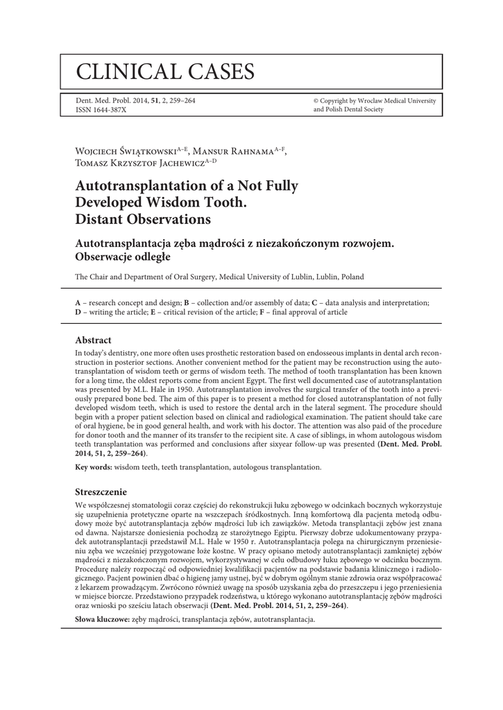 CLINICAL CASES Dent. Med. Probl. 2014, 51, 2, 259–264 ISSN 1644-387X © Copyright by Wroclaw Medical University and Polish Dental Society Wojciech ŚwiątkowskiA–E, Mansur RahnamaA–F, Tomasz Krzysztof JachewiczA–D Autotransplantation of a Not Fully Developed Wisdom Tooth. Distant Observations Autotransplantacja zęba mądrości z niezakończonym rozwojem. Obserwacje odległe The Chair and Department of Oral Surgery, Medical University of Lublin, Lublin, Poland A – research concept and design; B – collection and/or assembly of data; C – data analysis and interpretation; D – writing the article; E – critical revision of the article; F – final approval of article Abstract In today’s dentistry, one more often uses prosthetic restoration based on endosseous implants in dental arch reconstruction in posterior sections. Another convenient method for the patient may be reconstruction using the autotransplantation of wisdom teeth or germs of wisdom teeth. The method of tooth transplantation has been known for a long time, the oldest reports come from ancient Egypt. The first well documented case of autotransplantation was presented by M.L. Hale in 1950. Autotransplantation involves the surgical transfer of the tooth into a previously prepared bone bed. The aim of this paper is to present a method for closed autotransplantation of not fully developed wisdom teeth, which is used to restore the dental arch in the lateral segment. The procedure should begin with a proper patient selection based on clinical and radiological examination. The patient should take care of oral hygiene, be in good general health, and work with his doctor. The attention was also paid of the procedure for donor tooth and the manner of its transfer to the recipient site. A case of siblings, in whom autologous wisdom teeth transplantation was performed and conclusions after sixyear follow-up was presented (Dent. Med. Probl. 2014, 51, 2, 259–264). Key words: wisdom teeth, teeth transplantation, autologous transplantation. Streszczenie We współczesnej stomatologii coraz częściej do rekonstrukcji łuku zębowego w odcinkach bocznych wykorzystuje się uzupełnienia protetyczne oparte na wszczepach śródkostnych. Inną komfortową dla pacjenta metodą odbudowy może być autotransplantacja zębów mądrości lub ich zawiązków. Metoda transplantacji zębów jest znana od dawna. Najstarsze doniesienia pochodzą ze starożytnego Egiptu. Pierwszy dobrze udokumentowany przypadek autotransplantacji przedstawił M.L. Hale w 1950 r. Autotransplantacja polega na chirurgicznym przeniesieniu zęba we wcześniej przygotowane łoże kostne. W pracy opisano metody autotransplantacji zamkniętej zębów mądrości z niezakończonym rozwojem, wykorzystywanej w celu odbudowy łuku zębowego w odcinku bocznym. Procedurę należy rozpocząć od odpowiedniej kwalifikacji pacjentów na podstawie badania klinicznego i radiologicznego. Pacjent powinien dbać o higienę jamy ustnej, być w dobrym ogólnym stanie zdrowia oraz współpracować z lekarzem prowadzącym. Zwrócono również uwagę na sposób uzyskania zęba do przeszczepu i jego przeniesienia w miejsce biorcze. Przedstawiono przypadek rodzeństwa, u którego wykonano autotransplantację zębów mądrości oraz wnioski po sześciu latach obserwacji (Dent. Med. Probl. 2014, 51, 2, 259–264). Słowa kluczowe: zęby mądrości, transplantacja zębów, autotransplantacja. 260 In today’s dentistry, one more often uses prosthetic restoration based on endosseous implants in dental arch reconstruction in posterior sections. Another convenient method for the patient may be reconstruction using the autotransplantation of wisdom teeth [1, 2]. Transplantation (from Latin transplantare: plant again in a different place) is a procedure which consists of implantation of the cells, tissues and organs in the recipient, taken from a donor. We can distinguish: point 1 – autotransplantation – transplantation within a single organism; point 2 – isotransplanatation – transplantation in genetically identical individuals, the donor and recipient are monozygotic twins; point 3 – allotransplantations – transplantation within the same species; point 4 – ksenotransplantations – transplantation between individuals of different species [3, 4]. The method of tooth transplantation has been known for a long time, the oldest reports come from ancient Egypt. The first well documented case of autotransplantation was presented in 1950 according to Yoshino et al. [5]. The procedure should begin with a proper patient selection based on clinical and radiological examination. We can use the CBCT and stereolithographic models, to easier planning the procedure [6]. The patient should take care of oral hygiene, be in good general health, and cooperate with his doctor. The best time to perform autotransplantation of wisdom teeth is the developmental age. At that time, the increase in alveolar bone prevents the use of other methods of reconstruction of the dental arch, implants or fixed prostheses. Recommended age for transplantation of wisdom teeth in the lateral segment (replacing the first or second permanent molar) is 15–19 [7]. At this age, often required is the extraction of first permanent molar, less often the second permanent molar, which is the ideal site of extraction for a transplant. Before the surgery one should assess the proposed tooth for transplantation and its future location. At the age of 15–19, wisdom teeth have incomplete root development, which facilitates the whole procedure to remove the transplanted tooth and at the same time increases the chances of apexogenesis or apexification at the recipient site. According to most authors, it is optimal when the root of the donor is developed in 2/3 or 3/4 of its final length (stage F or G by Demirjan), it allows a better chance for revascularization so that tooth pulp will remain vital [8]. An important element for toot