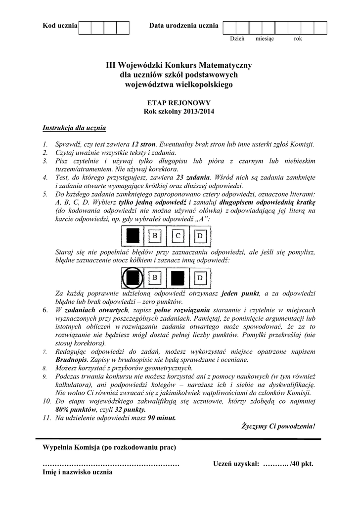 Kod ucznia Data urodzenia ucznia Dzień miesiąc rok III Wojewódzki Konkurs Matematyczny dla uczniów szkół podstawowych województwa wielkopolskiego ETAP REJONOWY Rok szkolny 2013/2014 Instrukcja dla ucznia 1. 2. 3. 4. 5. Sprawdź, czy test zawiera 12 stron. Ewentualny brak stron lub inne usterki zgłoś Komisji. Czytaj uważnie wszystkie teksty i zadania. Pisz czytelnie i używaj tylko długopisu lub pióra z czarnym lub niebieskim tuszem/atramentem. Nie używaj korektora. Test, do którego przystępujesz, zawiera 23 zadania. Wśród nich są zadania zamknięte i zadania otwarte wymagające krótkiej oraz dłuższej odpowiedzi. Do każdego zadania zamkniętego zaproponowano cztery odpowiedzi, oznaczone literami: A, B, C, D. Wybierz tylko jedną odpowiedź i zamaluj długopisem odpowiednią kratkę (do kodowania odpowiedzi nie można używać ołówka) z odpowiadającą jej literą na karcie odpowiedzi, np. gdy wybrałeś odpowiedź „A”: Staraj się nie popełniać błędów przy zaznaczaniu odpowiedzi, ale jeśli się pomylisz, błędne zaznaczenie otocz kółkiem i zaznacz inną odpowiedź: Za każdą poprawnie udzieloną odpowiedź otrzymasz jeden punkt, a za odpowiedzi błędne lub brak odpowiedzi – zero punktów. 6. W zadaniach otwartych, zapisz pełne rozwiązania starannie i czytelnie w miejscach wyznaczonych przy poszczególnych zadaniach. Pamiętaj, że pominięcie argumentacji lub istotnych obliczeń w rozwiązaniu zadania otwartego może spowodować, że za to rozwiązanie nie będziesz mógł dostać pełnej liczby punktów. Pomyłki przekreślaj (nie stosuj korektora). 7. Redagując odpowiedzi do zadań, możesz wykorzystać miejsce opatrzone napisem Brudnopis. Zapisy w brudnopisie nie będą sprawdzane i oceniane. 8. Możesz korzystać z przyborów geometrycznych. 9. Podczas trwania konkursu nie możesz korzystać ani z pomocy naukowych (w tym również kalkulatora), ani podpowiedzi kolegów – narażasz ich i siebie na dyskwalifikację. Nie wolno Ci również zwracać się z jakimikolwiek wątpliwościami do członków Komisji. 10. Do etapu wojewódzkiego zakwalifikują się uczniowie, którzy zdobędą co najmniej 80% punktów, czyli 32 punkty. 11. Na udzielenie odpowiedzi masz 90 minut. Życzymy Ci powodzenia! Wypełnia Komisja (po rozkodowaniu prac) ………………………………………………… Imię i nazwisko ucznia Uczeń uzyskał: ……….. /40 pkt. ETAP REJONOWY III Wojewódzki Konkurs Matematyczny dla uczniów szkół podstawowych województwa wielkopolskiego Informacje do zadań 1 i 2. W pewnej szkole troje uczniów intensywnie przygotowywało się do etapu rejonowego konkursu matematycznego. Każdy z nich rozwiązywał codziennie jednakową (większą od jeden) liczbę zadań, taką samą jak dwoje pozostałych. W sumie uczniowie rozwiązali odpowiednio 105, 112 i 84 zadania, gdyż każdy z nich rozpoczął przygotowania do konkursu w innym terminie. Zadanie 1. (1 pkt) Ile zadań rozwiązywał dziennie każdy z uczniów? A. 3 zadania B. 7 zadań C. 4 zadania D. 6 zadań Zadanie 2. (1 pkt) Ile dni przygotowywał się do konkursu uczeń, który rozwiązał najwięcej zadań? A. 7 dni B. 12 dni C. 16 dni D. 15 dni Informacje do zadań 3 i 4. W toku przygotowań do konkursu chłopcy ćwiczyli zamianę różnorodnych jednostek i analizowali różne dane liczbowe. Poniższe tabele przedstawiają niektóre z nich. Korzystając z tych informacji rozwiąż zadania 3 i 4. 1 KB (kilobajt) = 210 B Prędkość światła 1 080 000 000 km/h 1 MB (megabajt) = 210 KB Prędkość dźwięku 300 m/s 1 GB (gigabajt) = 210 MB Zadanie 3. (1 pkt) Podstawową jednostką określającą pojemność różnych nośników informacji jest 1B (bajt). Korzystając z informacji podanych w pierwszej tabeli oblicz, ile bajtów mieszczą trzy GB (gigabajty). A. 3 ⋅ 21000 B. 3 ⋅ 2 30 C. 3 ⋅ 210 D. 6 30 Zadanie 4. (1 pkt) Korzystając z informacji przytoczonych w drugiej tabeli oblicz, ile razy prędkość światła jest większa od prędkości dźwięku. A. milion razy B. 3,6 tys. razy C. tysiąc razy Strona 2 z 12 D. 3,6 mln razy ETAP REJONOWY III Wojewódzki Konkurs Matematyczny dla uczniów szkół podstawowych województwa wielkopolskiego Informacje do zadań 5 - 7. Poniższe diagramy przedstawiają wyniki etapu rejonowego konkursu matematycznego w pewnym województwie. Korzystając z danych liczbowych na rysunkach rozwiąż trzy kolejne zadania. Legenda: 0-9 pkt 10-20 pkt 21-31 pkt 32-40 pkt (awans do finału) Uczniowie, którzy nie awansowali do finału 700 Wszyscy uczestnicy etapu rejonowego 600 28° 500 98° liczba uczniów ? 648 ? 400 300 200 ? 100 162° 0 Zadanie 5. (1 pkt) Jaką część wszystkich uczestników etapu rejonowego konkursu matematycznego stanowili uczniowie, którzy awansowali do finału? A. 1 5 B. 0,02 C. 0,05 D. 1 4 Zadanie 6. (1 pkt) Korzystając z diagramów oblicz, ilu uczniów wzięło udział w etapie rejonowym konkursu matematycznego w tym województwie? A. 648 uczniów B. 1152 uczniów C. 1224 uczniów D. 1440 uczniów Zadanie 7. (1 pkt) Korzystając z diagramów oblicz, ilu uczniów otrzymało w etapie rejonowym konkursu matematycznego nie więcej niż połowę punktów. A. 648 uczniów B. 392 uczniów C. 504 uczniów Strona 3 z 12 D. 936 uczniów ETAP REJONOWY III Wojewódzki Konkurs Matematyczny dla uczniów szkół podstawowych województwa wielkopolskiego Informacje do zadań 8 - 10. Zosia jest najstarsza z rodzeństwa. Gdy miała trzy lata urodził się jej brat. Później, jeszcze dwukrotnie, co kolejne trzy lata na świat przyszły jej dwie siostry. Zadanie 8. (1 pkt) Ile lat łącznie ma czwórka rodzeństwa, jeśli przez x oznaczymy wiek brata Zosi? A. x 4 − 9 B. 4 x − 6 C. 4 x − 18 D. 4 x + 6 Zadanie 9. (1 pkt) Które równanie pozwoli obliczyć, ile lat miała Zosia, gdy była 4 razy starsza od swojej najmłodszej siostry, jeśli przez z oznaczymy ówczesny wiek Zosi? A. z = 4( z − 9) B. z = 4 z − 9 C. 4 z = z −