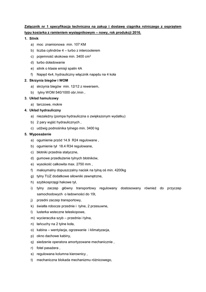 Załącznik nr 1 specyfikacja techniczna na zakup i dostawę ciągnika rolniczego z osprzętem typu kosiarka z ramieniem wysięgnikowym – nowy, rok produkcji 2016. 1. Silnik a) moc znamionowa min. 107 KM b) liczba cylindrów 4 – turbo z intercoolerem c) pojemność skokowa min. 3400 cm3 d) turbo doładowanie e) silnik o klasie emisji spalin 4A f) Napęd 4x4, hydrauliczny włącznik napędu na 4 koła 2. Skrzynia biegów i WOM a) skrzynia biegów min. 12/12 z rewersem, b) tylny WOM 540/1000 obr./min , 3. Układ hamulcowy a) tarczowe, mokre 4. Układ hydrauliczny a) niezależny (pompa hydrauliczna o zwiększonym wydatku) b) 2 pary wyjść hydraulicznych , c) udźwig podnośnika tylnego min. 3400 kg 5. Wyposażenie a) ogumienie przód 14.9 R24 regulowane , b) ogumienie tył 18.4 R34 regulowane, c) błotniki przednia statyczne, d) gumowe przedłużenie tylnych błotników, e) wysokość całkowita max. 2750 mm , f) maksymalny dopuszczalny nacisk na tylną oś min. 4200kg g) tylny TUZ dodatkowe siłowniki zewnętrzne, h) szybkosprzęgi hakowe tył, i) tylny zaczep główny transportowy regulowany samochodowych o ładowności do 15t, j) przedni zaczep transportowy, k) światła robocze przednie i tylne, 2 przesuwne, l) lusterka wsteczne teleskopowe, m) wycieraczka szyb – przednia i tylna, n) łańcuchy na 2 tylne koła, o) kabina – wentylacja, ogrzewanie i klimatyzacja, p) okno dachowe kabiny, q) siedzenie operatora amortyzowane mechanicznie , r) fotel pasażera , s) regulowana kolumna kierownicy , t) mechaniczna blokada mechanizmu różnicowego, dostosowany również do przyczep u) światło ostrzegawcze v) kpl. przegubów kulowych do końcówek zaczepów ramion dolnych w) ciągnik doposażyć w elementy dociążające ciągnik przy pracy z kosiarką bijakową z ramieniem wysięgnikowym, x) Praca ciągnika na terenie oczyszczalni ścieków – przewóz osadów ściekowych y) Szkolenie operatorów z obsługi ciągnika po stronie Dostawcy z) Gwarancja :– 24 miesięcy Serwis gwarancyjny i pogwarancyjny, czas reakcji 5 godz. (jeżeli czas przekroczy 48 godz., ciągnik zastępczy). Koszty części zamiennych i eksploatacyjnych, olei, smarów, pracy i usług serwisu w okresie gwarancji po stronie Wykonawcy. 6. Kosiarka z ramieniem wysięgnikowym a) Zasięg pracy wysięgnika z głowicą koszącą – min. 5,50m, b) zabezpieczenie ramienia – bezpiecznik hydrauliczny, c) sposób mocowania na nośniku – tylny TUZ, d) napęd hydrauliczny własny, e) sterowanie – linkowe mechaniczne, f) ciśnienie robocze układu hydraulicznego – min. 210 bar g) kąt obrotu głowicy – min. 200o, h) szerokość transportowa – max. 3,50m i) długość transportowa – max. 0,95m j) wysokość transportowa – max. 2,0m k) położenie wysięgnika względem nośnika – prawe l) max prędkość obrotowa WOM – min. 540 obr./min., m) belka oświetleniowa – tak Głowica kosząca: a) szerokość robocza w położeniu transportowym –1,40m -1,50m b) napęd – hydrauliczny c) rodzaj noży – bijakowe d) liczba noży – min. 24 e) zapasowy komplet noży – min. 24 noże f) komplet blach osłonowych noży, g) kierunek obrotów – lewy i prawy h) klasa kosiarki – koszenie trawy, zarośli i krzaków do średnicy 8cm, i) typ noży - koszenie trawy, zarośli i krzaków do średnicy 8 cm, j) znaki ostrzegawcze na kosiarkę, k) Szkolenie operatorów z obsługi kosiarki po stronie Dostawcy, l) Gwarancja – 24 miesiące Serwis gwarancyjny i pogwarancyjny: koszty części zamiennych i eksploatacyjnych, olei, smarów, pracy i usług serwisu w okresie gwarancji po stronie Wykonawcy. 7. Homologacje cały sprzęt 8. Dostawa: ciągnik wraz z kosiarką z ramieniem wysięgnikowym max. 14 dni od daty podpisania umowy, Miejsce dostawy- Oczyszczalnia ścieków w Otwocku, ul. Kraszewskiego 1 Do oferty należy dołączyć karty katalogowe oferowanych produktów UWAGA Kosiarka wysięgnikowa musi być również kompatybilna z ciągnikiem CLAAS AXOS 340C, który obecnie posiada Zamawiający.