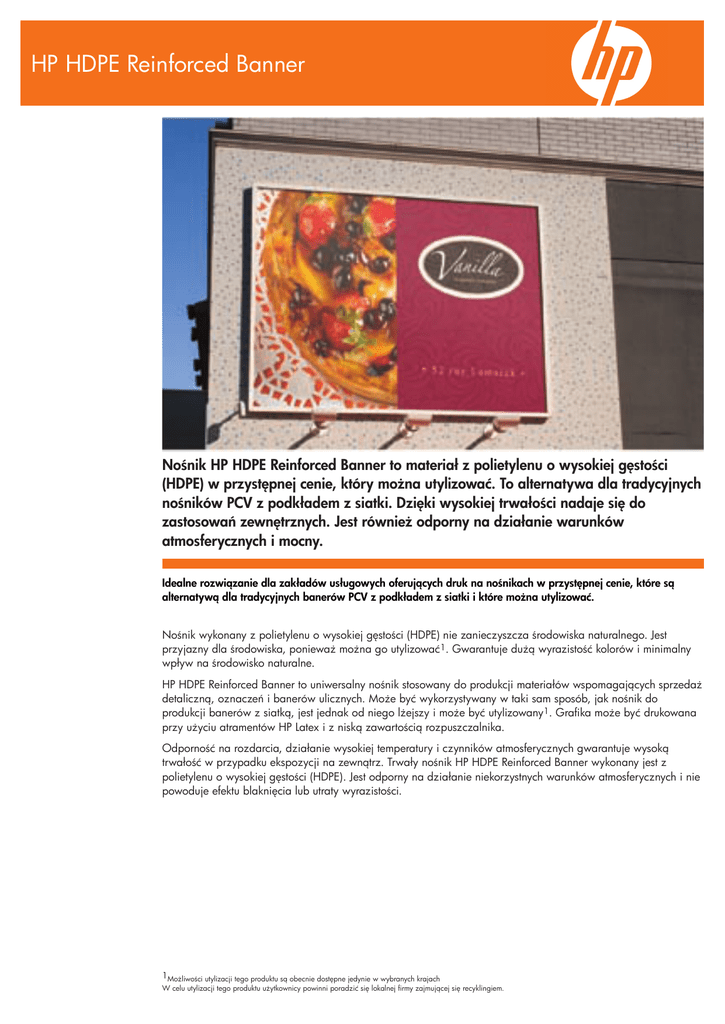 HP HDPE Reinforced Banner Nośnik HP HDPE Reinforced Banner to materiał z polietylenu o wysokiej gęstości (HDPE) w przystępnej cenie, który można utylizować. To alternatywa dla tradycyjnych nośników PCV z podkładem z siatki. Dzięki wysokiej trwałości nadaje się do zastosowań zewnętrznych. Jest również odporny na działanie warunków atmosferycznych i mocny. Idealne rozwiązanie dla zakładów usługowych oferujących druk na nośnikach w przystępnej cenie, które są alternatywą dla tradycyjnych banerów PCV z podkładem z siatki i które można utylizować. Nośnik wykonany z polietylenu o wysokiej gęstości (HDPE) nie zanieczyszcza środowiska naturalnego. Jest przyjazny dla środowiska, ponieważ można go utylizować1. Gwarantuje dużą wyrazistość kolorów i minimalny wpływ na środowisko naturalne. HP HDPE Reinforced Banner to uniwersalny nośnik stosowany do produkcji materiałów wspomagających sprzedaż detaliczną, oznaczeń i banerów ulicznych. Może być wykorzystywany w taki sam sposób, jak nośnik do produkcji banerów z siatką, jest jednak od niego lżejszy i może być utylizowany1. Grafika może być drukowana przy użyciu atramentów HP Latex i z niską zawartością rozpuszczalnika. Odporność na rozdarcia, działanie wysokiej temperatury i czynników atmosferycznych gwarantuje wysoką trwałość w przypadku ekspozycji na zewnątrz. Trwały nośnik HP HDPE Reinforced Banner wykonany jest z polietylenu o wysokiej gęstości (HDPE). Jest odporny na działanie niekorzystnych warunków atmosferycznych i nie powoduje efektu blaknięcia lub utraty wyrazistości. 1Możliwości utylizacji tego produktu są obecnie dostępne jedynie w wybranych krajach W celu utylizacji tego produktu użytkownicy powinni poradzić się lokalnej firmy zajmującej się recyklingiem. HP HDPE Reinforced Banner Zgodność Najnowsze informacje na temat zgodności materiałów eksploatacyjnych do drukarek wielkoformatowych można znaleźć na stronie www.hp.com/go/designjet/supplies Najnowsze profile ICC dla nośników można znaleźć pod adresem www.hp.com/go/designjet/supplies (należy kliknąć profile ICC i wybrać model drukarki). W przypadku drukarek niepostscriptowych informacji na ten temat można zasięgnąć u dostawcy procesora RIP. Dane techniczne produktu Waga Grubość Nieprzejrzystość Jasność Biel Laminowanie Wykończenie Odporność na podarcie Wytrzymałość na rozciąganie Temperatura pracy Wilgotność podczas pracy Atrament o niskiej zawartości rozpuszczalnika odporny na światło (ekspozycja wewnętrzna w domu lub biurze) Atrament o niskiej zawartości rozpuszczalnika odporny na światło (archiwizacja) Wodotrwałość Czas suszenia Okres trwałości Temperatura przechowywania Wilgotność przechowywania Kraj pochodzenia Informacje o zamawianiu 180 g/m² wg metody testowej ISO 536 216 mikronów wg metody testowej ISO 534 Powyżej 88% wg metody TAPPI T-425 90% według metody testowej TAPPI T-452, 92% według metody testowej ISO 2470 110 według metody testowej CIE Ganz 82, 95,7 według metody testowej ISO 11476, 85,7 według metody testowej ISO 11475 Tak, metoda natryskowa Matowy MD>35 N/CD>30 N według metody testowej ASTM D1004 MD>380 N/CD>480 N według metody testowej TAPPI T-494 Od 15 do 100°C Wilgotność wzgl. 20–80% Ponad 200 lat (przy zastosowaniu atramentów HP Latex). Szczegóły: http://www.hp.com/go/supplies/printpermanence. 1,2 roku (przy zastosowaniu atramentów HP Latex). Szczegóły: http://www.hp.com/go/supplies/printpermanence. Odporność na działanie wody Szybko schnący z suszeniem w temperaturze 23°C, przy wilgotności względnej 50% 2 lata w oryginalnym, fabrycznie zamkniętym opakowaniu od 0 do 40° C wilgotność względna 5-95% Wyprodukowano w Stanach Zjednoczonych Numer produktu CG414A CG415A CG416A CG417A Gwarancja Wymiary rolki 914 mm x 45,7 1067 mm x 45,7 1524 mm x 45,7 2642 mm x 100,6 Kod UPC 883585618255 883585618262 883585618279 883585618286 HP gwarantuje, że wielkoformatowe materiały drukarskie HP są wolne od wad produkcyjnych i są tak zaprojektowane, by przy właściwym użytkowaniu nie powodować zacięć drukarki. © 2009 Hewlett-Packard Development Company L.P. Jedyne gwarancje, jakich HP udziela na produkty i usługi, są określone w oświadczeniach gwarancyjnych dostarczanych wraz z takimi produktami i usługami. Żaden zapis niniejszego dokumentu nie może być uważany za dodatkową gwarancję. HP nie ponosi odpowiedzialności za błędy techniczne lub redakcyjne oraz braki występujące w niniejszym dokumencie. Aby uzyskać więcej informacji na temat materiałów do wydruków HP w dużym formacie, odwiedź http://www.hp.com/go/designjet/supplies Publikacja na region EMEA 4AA2-1591 PLE m m m m