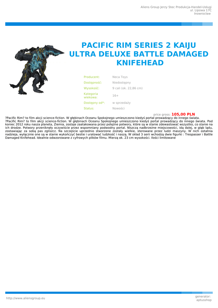 Aliens Group Jerzy Stec Produkcja-Handel-Usługi ul. Lipowa 17C Inowrocław PACIFIC RIM SERIES 2 KAIJU ULTRA DELUXE BATTLE DAMAGED KNIFEHEAD Producent: Neca Toys Dostępność: Niedostępny Wysokość: 9 cali (ok. 22,86 cm) Kategoria wiekowa: 16+ Dostępny od*: w sprzedaży Status: Nowości price gross: 105,00 PLN ?Pacific Rim? to film akcji science-fiction. W głębinach Oceanu Spokojnego umieszczono kiedyś portal prowadzący do innego świata. ?Pacific Rim? to film akcji science-fiction. W głębinach Oceanu Spokojnego umieszczono kiedyś portal prowadzący do innego świata. Pod koniec 2012 roku nasza planeta, Ziemia, zostaje zaatakowana przez potężne potwory, które są w stanie zdewastować wszystko, co stanie na ich drodze. Potwory przeniknęły oczywiście przez wspomniany podwodny portal. Niszczą nadbrzeżne miejscowości, idą dalej, w głąb lądu, zostawiając za sobą pas zgliszcz. Na szczęście uprzednio stworzone zostały wielkie, sterowane przez ludzi maszyny. W nich ostatnia nadzieja, wyłącznie one są w stanie wykończyć bestie i uratować ludzkość i naszą. W skład 3 serii wchodzą dwie figurki : Trespasser i Battle Damaged Knifehead. Idealnie odwzorowane z cyfrowych plików filmu. Mierzą ok. 23 cm wysokości. Ilości limitowane http://www.aliensgroup.eu generator: aptusshop