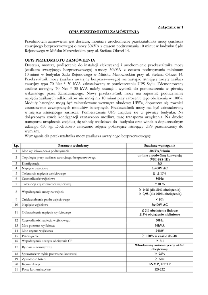 Załącznik nr 1 OPIS PRZEDMIOTU ZAMÓWIENIA Przedmiotem zamówienia jest dostawa, montaż i uruchomienie przekształtnika mocy (zasilacza awaryjnego bezprzerwowego) o mocy 30kVA z czasem podtrzymania 10 minut w budynku Sądu Rejonowego w Mińsku Mazowieckim przy ul. Stefana Okrzei 14. OPIS PRZEDMIOTU ZAMÓWIENIA Dostawa, montaż, podłączenie do instalacji elektrycznej i uruchomienie przekształtnika mocy (zasilacza awaryjnego bezprzerwowego) o mocy 30kVA z czasem podtrzymania minimum 10 minut w budynku Sądu Rejonowego w Mińsku Mazowieckim przy ul. Stefana Okrzei 14. Przekształtnik mocy (zasilacz awaryjny bezprzerwowego) ma zastąpić istniejący zużyty zasilacz awaryjny typu 70 Net * 30 kVA zainstalowany w pomieszczeniu UPS Sądu. Zdemontowany zasilacz awaryjny 70 Net * 30 kVA należy usunąć i wynieść do pomieszczenia w piwnicy wskazanego przez Zamawiającego. Nowy przekształtnik mocy ma zapewnić podtrzymanie napięcia zasilanych odbiorników nie mniej niż 10 minut przy założeniu jego obciążenia w 100%. Moduły bateryjne mogą być zainstalowane wewnątrz obudowy UPS’a, dopuszcza się również zastosowanie zewnętrznych modułów bateryjnych. Przekształtnik mocy ma być zainstalowany w miejscu istniejącego zasilacza. Pomieszczenie UPS znajduje się w piwnicy budynku. Na dołączonym rzucie kondygnacji zaznaczono możliwą trasę transportu urządzenia. Na drodze transportu urządzenia znajdują się schody wejściowe do budynku oraz winda o dopuszczalnym udźwigu 630 kg. Dodatkowo załączono zdjęcie pokazujące istniejący UPS przeznaczony do wymiany. Wymagania dla przekształtnika mocy (zasilacza awaryjnego bezprzerwowego): Lp. Parametr techniczny 1 Moc wyjściowa/czas podtrzymania 2 Topologia pracy zasilacza awaryjnego bezprzerwowego 3 4 Konfiguracja Napięcie wejściowe 5 6 Tolerancja napięcia wejściowego Częstotliwość wejściowa 7 Tolerancja częstotliwości wejściowej 8 Współczynnik mocy na wejściu Stawiane wymagania 30kVA/10min on-line z podwójną konwersją (VFI-SSS-111) 3:3 3x400V AC ≥ ± 10% 50Hz ± 10 % ≥ 0,95 (dla 50% obciążenia) ≥ 0,98 (dla 100% obciążenia) 9 Zniekształcenia prądu wejściowego 10 Napięcie wyjściowe < 5% 11 Odkształcenia napięcia wyjściowego ≤ 2% obciążenie liniowe ≤ 5% obciążenie nieliniowe 12 13 Częstotliwość napięcia wyjściowego Moc pozorna wyjściowa 50Hz 30kVA 14 15 16 Moc czynna wyjściowa Przeciążenie Współczynnik szczytu obciążenia CF 17 By-pass automatyczny 18 Sprawność w trybie podwójnej konwersji 24kW ≥ 120% w czasie do 60s ≥ 3:1 Wbudowany automatyczny układ obejściowy ≥ 95% 19 20 Żywotność baterii Komunikacja 21 Porty komunikacyjne 3x400V AC ≥ 5lat SNMP, HTTP RS-232 Ethernet 10/100 BaseT (RJ-45) 22 Opcje dodatkowe 23 Podłączenie wyłącznika awaryjnego EPO 24 Panel sterujący 25 Gwarancja producenta 26 Hałas 27 Wymiary 28 Dokumentacja możliwość zdalnego wyłączenia w systemie Windows Tak Wyświetlacz LCD z komunikatami w języku polskim 24 miesiące ≤ 60dB (z 1m) Pozwalające na wniesienie urządzenia na miejsce montażu: Szerokość nie więcej niż 75cm Wysokość nie więcej niż 185 cm Instrukcja obsługi w języku polskim W skład przedmiotu zamówienia wchodzi również wykonywanie nieodpłatnego serwisu gwarancyjnego dostarczonego przekształtnika mocy (zasilacza awaryjnego bezprzerwowego). W skład przedmiotu zamówienia wchodzi również: demontaż, odłączenie od instalacji elektrycznej, wyniesienie do pomieszczenia wskazanego przez Zamawiającego mieszczącego się w piwnicy budynku istniejącego przekształtnika mocy 70 Net * 30 kVA. W skład przedmiotu zamówienia wchodzi przeszkolenie dwóch pracowników Sądu Rejonowego w Mińsku Mazowieckim z obsługi urządzenia. Zaleca się dokonanie wizji lokalnej, po uzgodnieniu telefonicznym, w celu sporządzenia rzetelnej oferty. Do oferty ma zostać dołączona: a) karta katalogowa zaproponowanego urządzenia. b) wypełniona tabela z parametrami technicznymi. MAKSYMALNY TERMIN WYKONANIA UMOWY: - do 8 tygodni od dnia podpisania umowy OKRES GWARANCJI - 24 miesięcy od daty odbioru bezusterkowego OPIS SPOSOBU OBLICZENIA CENY Cena oferty powinna zawierać dostawę, montaż i uruchomienie przekształtnika mocy (zasilacza awaryjnego bezprzerwowego), a także gwarancję oraz wykonywanie serwisu gwarancyjnego dostarczonego przekształtnika mocy (zasilacza awaryjnego bezprzerwowego) przez okres biegu gwarancji oraz koszty demontażu i wyniesienia zużytego sprzętu znajdującego się w miejscu dostawy do pomieszczenia wskazanego przez Zamawiającego mieszczącego się budynku. KRYTERIUM WYBORU OFERTY: CENA: 100 %