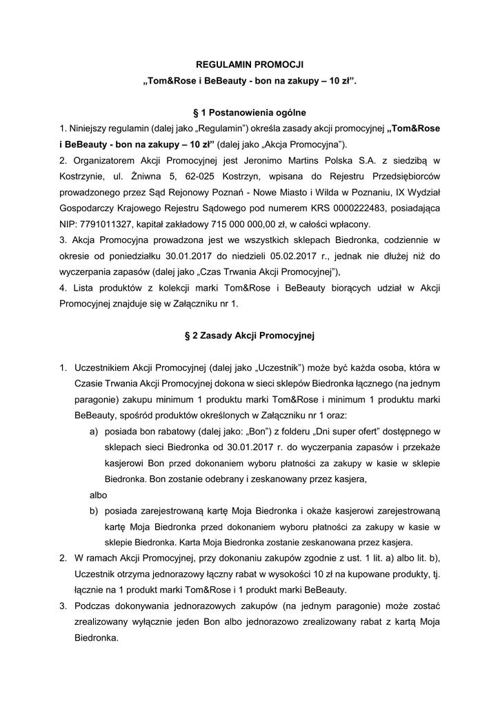 REGULAMIN PROMOCJI „Tom&Rose i BeBeauty - bon na zakupy – 10 zł”. § 1 Postanowienia ogólne 1. Niniejszy regulamin (dalej jako „Regulamin”) określa zasady akcji promocyjnej „Tom&Rose i BeBeauty - bon na zakupy – 10 zł” (dalej jako „Akcja Promocyjna”). 2. Organizatorem Akcji Promocyjnej jest Jeronimo Martins Polska S.A. z siedzibą w Kostrzynie, ul. Żniwna 5, 62-025 Kostrzyn, wpisana do Rejestru Przedsiębiorców prowadzonego przez Sąd Rejonowy Poznań - Nowe Miasto i Wilda w Poznaniu, IX Wydział Gospodarczy Krajowego Rejestru Sądowego pod numerem KRS 0000222483, posiadająca NIP: 7791011327, kapitał zakładowy 715 000 000,00 zł, w całości wpłacony. 3. Akcja Promocyjna prowadzona jest we wszystkich sklepach Biedronka, codziennie w okresie od poniedziałku 30.01.2017 do niedzieli 05.02.2017 r., jednak nie dłużej niż do wyczerpania zapasów (dalej jako „Czas Trwania Akcji Promocyjnej”), 4. Lista produktów z kolekcji marki Tom&Rose i BeBeauty biorących udział w Akcji Promocyjnej znajduje się w Załączniku nr 1. § 2 Zasady Akcji Promocyjnej 1. Uczestnikiem Akcji Promocyjnej (dalej jako „Uczestnik”) może być każda osoba, która w Czasie Trwania Akcji Promocyjnej dokona w sieci sklepów Biedronka łącznego (na jednym paragonie) zakupu minimum 1 produktu marki Tom&Rose i minimum 1 produktu marki BeBeauty, spośród produktów określonych w Załączniku nr 1 oraz: a) posiada bon rabatowy (dalej jako: „Bon”) z folderu „Dni super ofert” dostępnego w sklepach sieci Biedronka od 30.01.2017 r. do wyczerpania zapasów i przekaże kasjerowi Bon przed dokonaniem wyboru płatności za zakupy w kasie w sklepie Biedronka. Bon zostanie odebrany i zeskanowany przez kasjera, albo b) posiada zarejestrowaną kartę Moja Biedronka i okaże kasjerowi zarejestrowaną kartę Moja Biedronka przed dokonaniem wyboru płatności za zakupy w kasie w sklepie Biedronka. Karta Moja Biedronka zostanie zeskanowana przez kasjera. 2. W ramach Akcji Promocyjnej, przy dokonaniu zakupów zgodnie z ust. 1 lit. a) albo lit. b), Uczestnik otrzyma jednorazowy łączny rabat w wysokości 10 zł na kupowane produkty, tj. łącznie na 1 produkt marki Tom&Rose i 1 produkt marki BeBeauty. 3. Podczas dokonywania jednorazowych zakupów (na jednym paragonie) może zostać zrealizowany wyłącznie jeden Bon albo jednorazowo zrealizowany rabat z kartą Moja Biedronka. 4. Rabat wynikający z Bonu oraz rabat wynikający z karty Moja Biedronka nie łączą się. 5. Bon może być wykorzystany tylko raz w Czasie Trwania Akcji Promocyjnej. Karta Moja Biedronka w celu uzyskania rabatu może być wykorzystana tylko raz w Czasie Trwania Akcji Promocyjnej 6. Maksymalny przyznany rabat wynosi 10 zł niezależnie od ilości kupowanych produktów. 7. W przypadku zwrotu towaru, przy zakupie którego Uczestnik skorzystał z rabatu, Uczestnik otrzyma wyłącznie zwrot ceny rzeczywiście uiszczonej – tj. ceny regularnej pomniejszonej o rabat. § 3 Reklamacje 1. W przypadku przeprowadzenia Akcji Promocyjnej niezgodnie z Regulaminem Uczestnikowi przysługuje prawo do złożenia reklamacji. 2. Reklamacja powinna zostać zgłoszona w terminie 30 dni od dnia skorzystania z Akcji Promocyjnej. 3. W celu usprawnienia procesu zgłaszania i rozpatrywania, reklamacja może zostać złożona w formie pisemnej na adres: Jeronimo Martins Polska S.A., ul. Żniwna 5, 62-025 Kostrzyn. 4. Składający reklamację powinien uwidocznić w jej treści swoje dane, tak aby kontakt z nim w celu poinformowania o wyniku postępowania reklamacyjnego był możliwy. 5. W celu usprawnienia postępowania reklamacyjnego składający reklamację powinien załączyć do reklamacji kserokopię dowodu zakupu produktu w sieci sklepów Biedronka. 6. Reklamacje będą rozpatrywane przez Organizatora. Uczestnik wnoszący reklamację zostanie poinformowany o jej rozstrzygnięciu w terminie 14 dni od jej otrzymania przez Organizatora. Informacja o rozstrzygnięciu reklamacji zostanie przekazana Uczestnikowi w takiej formie, w jakiej zostało dokonane zgłoszenie reklamacyjne, tudzież w innej formie uzgodnionej pomiędzy Uczestnikiem a Organizatorem. 7. Organizator będzie przetwarzał dane osobowe Uczestnika zgłaszającego reklamację wyłącznie w związku z procedurą reklamacyjną. § 4 Postanowienia końcowe 1. Regulamin Akcji Promocyjnej dostępny jest w sklepach Biedronka oraz na stronie internetowej www.biedronka.pl. 2. Postanowienia Regulaminu podlegają przepisom prawa polskiego. W kwestiach nieuregulowanych Regulaminem zastosowanie mają przepisu kodeksu cywilnego oraz innych ustaw. 3. Wszelkie spory wynikłe z tytułu wykonania zobowiązań związanych z niniejszą Akcją Promocyjną będą rozstrzygane przez właściwy sąd powszechny. Załącznik nr 1 Produkty marki Tom&Rose Index Nazwa 293179 LEGINSY I SPODNICA SJ 293159 PONCHO BOHO 293161 KOSZULA DAMSKA LUB TUNIKA 293160 BOTKI DAMSKIE Produkty marki BeBeauty Index Nazwa MLECZKO / PŁYN DO DEM.MIX BE 211022 BEAUTY200ML 208113 ŻEL DO TWARZY BE BEAUTY 150ML 233711 KREM PRZ/ZMAR.BE BEAUTY 50/60/70 50ML 237977 FLUID MAT/KRY/KREM BB MIX 30ML BEBEAUTY