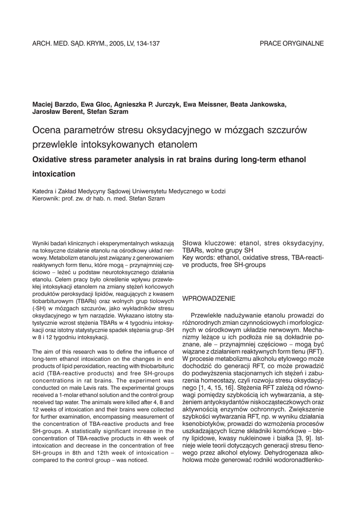ARCH. MED. SĄD. KRYM., 2005, LV, 134-137 PRACE ORYGINALNE Maciej Barzdo, Ewa Gloc, Agnieszka P. Jurczyk, Ewa Meissner, Beata Jankowska, Jarosław Berent, Stefan Szram Ocena parametrów stresu oksydacyjnego w mózgach szczurów przewlekle intoksykowanych etanolem Oxidative stress parameter analysis in rat brains during long-term ethanol intoxication Katedra i Zakład Medycyny Sądowej Uniwersytetu Medycznego w Łodzi Kierownik: prof. zw. dr hab. n. med. Stefan Szram Wyniki badań klinicznych i eksperymentalnych wskazują na toksyczne działanie etanolu na ośrodkowy układ nerwowy. Metabolizm etanolu jest związany z generowaniem reaktywnych form tlenu, które mogą – przynajmniej częściowo – leżeć u podstaw neurotoksycznego działania etanolu. Celem pracy było określenie wpływu przewlekłej intoksykacji etanolem na zmiany stężeń końcowych produktów peroksydacji lipidów, reagujących z kwasem tiobarbiturowym (TBARs) oraz wolnych grup tiolowych (-SH) w mózgach szczurów, jako wykładników stresu oksydacyjnego w tym narządzie. Wykazano istotny statystycznie wzrost stężenia TBARs w 4 tygodniu intoksykacji oraz istotny statystycznie spadek stężenia grup -SH w 8 i 12 tygodniu intoksykacji. The aim of this research was to define the influence of long-term ethanol intoxication on the changes in end products of lipid peroxidation, reacting with thiobarbituric acid (TBA-reactive products) and free SH-groups concentrations in rat brains. The experiment was conducted on male Levis rats. The experimental groups received a 1-molar ethanol solution and the control group received tap water. The animals were killed after 4, 8 and 12 weeks of intoxication and their brains were collected for further examination, encompassing measurement of the concentration of TBA-reactive products and free SH-groups. A statistically significant increase in the concentration of TBA-reactive products in 4th week of intoxication and decrease in the concentration of free SH-groups in 8th and 12th week of intoxication – compared to the control group – was noticed. Słowa kluczowe: etanol, stres oksydacyjny, TBARs, wolne grupy SH Key words: ethanol, oxidative stress, TBA-reactive products, free SH-groups WPROWADZENIE Przewlekłe nadużywanie etanolu prowadzi do różnorodnych zmian czynnościowych i morfologicznych w ośrodkowym układzie nerwowym. Mechanizmy leżące u ich podłoża nie są dokładnie poznane, ale – przynajmniej częściowo – mogą być wiązane z działaniem reaktywnych form tlenu (RFT). W procesie metabolizmu alkoholu etylowego może dochodzić do generacji RFT, co może prowadzić do podwyższenia stacjonarnych ich stężeń i zaburzenia homeostazy, czyli rozwoju stresu oksydacyjnego [1, 4, 15, 16]. Stężenia RFT zależą od równowagi pomiędzy szybkością ich wytwarzania, a stężeniem antyoksydantów niskocząsteczkowych oraz aktywnością enzymów ochronnych. Zwiększenie szybkości wytwarzania RFT, np. w wyniku działania ksenobiotyków, prowadzi do wzmożenia procesów uszkadzających liczne składniki komórkowe – błony lipidowe, kwasy nukleinowe i białka [3, 9]. Istnieje wiele teorii dotyczących generacji stresu tlenowego przez alkohol etylowy. Dehydrogenaza alkoholowa może generować rodniki wodoronadtlenko- Nr 2 OCENA PARAMETRÓW STRESU OKSYDACYJNEGO W MÓZGACH SZCZURÓW we (HO2), natomiast enzymy mikrosomalne rodnik wodorotlenowy. Procesy metabolizmu aldehydu octowego z udziałem oksydazy aldehydowej lub ksantynowej są również źródłem reaktywnych form tlenu [8]. W toku metabolizmu etanolu powstają również rodniki hydroksyetylowe [14]. Etanol może ponadto ułatwiać uwalnianie żelaza z białek magazynujących, umożliwiając zachodzenie reakcji Fentona, a także poprzez wpływ na mitochondria przyczynić się do zwiększenia jednoelektronowej redukcji tlenu do anionorodnika ponadtlenkowego [17, 18]. CEL PRACY Celem pracy było określenie wpływu przewlekłej intoksykacji etanolem na zmiany stężeń końcowych produktów peroksydacji lipidów, reagujących z kwasem tiobarbiturowym (TBARs) oraz wolnych grup tiolowych (-SH) w mózgach szczurów, jako wykładników stresu oksydacyjnego w tym narządzie. MATERIAŁ I METODY Badania przeprowadzono na samcach szczurów szczepu wsobnego Lewis, w początkowym wieku około 3 miesięcy. Grupa doświadczalna licząca 30 szczurów została podzielona na trzy równoliczebne podgrupy. Grupa porównawcza liczyła 10 szczurów. Zwierzęta grupy doświadczalnej otrzymywały do picia 1 M roztwór alkoholu etylowego, zaś zwierzętom grupy porównawczej podawano do picia wodę wodociągową. Szczury uśmiercano w 4, 8 i 12 tygodniu doświadczenia. Pobrane mózgi zwierząt zamrożono w temperaturze -80°C do dalszych badań biochemicznych, które obejmowały ocenę następujących parametrów stresu oksydacyjnego: 1. stężenia końcowych produktów peroksydacji lipidów, reagujących z kwasem tiobarbiturowym oznaczanych metodą spektrofluorymetryczną; 2. stężenia wolnych grup tiolowych oznaczanych metodą z odczynnikiem Ellmana. Powyższe parametry stresu oksydacyjnego zostały podane w przeliczeniu na ilość białka oznaczonego metodą Lowry’ego. Badania przeprowadzono po uzyskaniu zgody Lokalnej Komisji Etycznej w Łodzi do Spraw Doświadczeń na Zwierzętach (decyzja nr Ł/BD/53 z dnia 22.05.2001 r.). 135 WYNIKI Stężenie TBARs w homogenatach mózgów szczurów intoksykowanych etanolem wzrosło w sposób istotny statystycznie w 4 tygodniu intoksykacji do wartości 8 ± 3 µM/mg (p < 0,05) w stosunku do stężenia oznaczonego w grupie odniesienia (4 ± 2 µM/mg). W 8 i 12 tygodniu obserwowano nieistotny statystycznie spadek do wartości odpowiednio 3 ± 2 µM/mg i 1 ± 1 µM/mg. Wyniki przedstawiono w tabeli I. Tabela I. Parametry statystyczne zmian stężenia TBARs w mózgach szczurów intoksykowanych etanolem. Table I. The statistical parameters of the TBA-reactive products in the brains of rats intoxica