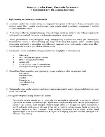 Wewnątrzszkolne Zasady Oceniania Zachowania w Gimnazjum nr 1 im. Janusza Korczaka 1. Tryb i zasady ustalania oceny zachowania. 1) Ocenianie zachowania ucznia polega na rozpoznawaniu przez wychowawcę klasy, nauczycieli oraz uczniów danej klasy stopnia respektowania przez ucznia zasad współżycia społecznego i ogólnie przyjętych norm etycznych. 2) Wychowawca klasy na początku każdego roku szkolnego informuje uczniów oraz rodziców (prawnych opiekunów) o warunkach i sposobie oraz kryteriach oceniania zachowania. 3) Przed posiedzeniem klasyfikacyjnym Rady Pedagogicznej wychowawca klasy jest zobowiązany poinformować ucznia o przewidywanej dla niego śródrocznej lub rocznej ocenie klasyfikacyjnej zachowania, natomiast w przypadku przewidywanej nagannej oceny zachowania wychowawca klasy powinien poinformować o tym fakcie rodziców ucznia. 4) Śródroczna i roczna ocena klasyfikacyjna zachowania uwzględnia w szczególności: a. b. c. d. e. f. frekwencję, takt i kulturę w relacjach z ludźmi, dbałość o wygląd zewnętrzny, sumienność, przestrzeganie zasad bezpieczeństwa, postawę wobec nałogów i uzależnień. 5) Ocenę klasyfikacyjną zachowania śródroczną i roczną ustala się według następującej skali: a) wzorowe, b) bardzo dobre, c) dobre, d) poprawne, e) nieodpowiednie, f) naganne. 6) Ocenę zachowania ustala wychowawca klasy po zasięgnięciu opinii nauczycieli, zespołu klasowego oraz ucznia (samoocena). 2. Szczegółowe kryteria oceny zachowania ucznia. 1) Zachowanie ucznia ocenia się w następujących kategoriach opisowych oznaczonych cyframi rzymskimi. Zadaniem wychowawcy jest wybranie w kolejnych kategoriach spośród poszczególnych zapisów tego zdania, które najlepiej charakteryzuje ucznia po zasięgnięciu opinii nauczycieli i innych członków społeczności szkolnej. Cyfra przy wybranym zapisie oznacza liczbę przyznanych uczniowi punktów w danej kategorii. Suma punktów zamieniana jest na ocenę według zasad wymienionych w ustaleniach końcowych. Kategoria VII dotyczy wyłącznie uczniów, będących w II półroczu klasy trzeciej. 1 2) Kategorie opisowe: I. Frekwencja. Ilość opuszczonych, nieusprawiedliwionych godzin lekcyjnych w I półroczu Ilość opuszczonych, Ilość nieusprawiedliwionych godzin lekcyjnych pkt w roku szkolnym 1 2 6 od 2 do 3 od 3 do 6 4 od 4 do 6 od 7 do 12 2 0od 7 do 12 od 13 do 24 1 od 16 do 21od 25 do 30 od 13 do 15 od 31 do 42 -1 powyżej 21 powyżej 42 -2 I półrocze Rok szkolny Ilość pkt Uczeń jest zawsze taktowny, prezentuje wysoką kulturę słowa i dyskusji, a jego postawa nacechowana jest życzliwością w stosunku do otoczenia. Brak uwag pisemnych. Uczeń jest zawsze taktowny, prezentuje wysoką kulturę słowa i dyskusji, a jego postawa nacechowana jest życzliwością w stosunku do otoczenia. Brak uwag pisemnych. 4 Uwaga: 3 spóźnienia mają wartość 1 godziny nieusprawiedliwionej. II. Takt i kultura osobista w relacjach z ludźmi. Uczeń ma maksymalnie 1 uwagę pisemną. Na Uczeń ma maks. 2 uwagi pisemne. Na uwagi uwagi ustne reaguje właściwie, a w rozmowach ustne reaguje właściwie, a w rozmowach stara stara się o zachowanie kultury słowa. się o zachowanie kultury słowa. Uczeń otrzymał od 2 do 3 uwag pisemnych, zachował się nietaktownie, użył mało kulturalnych słów w rozmowie lub dyskusji. Uczeń otrzymał od 3 do 6 uwag pisemnych, zachował się nietaktownie, użył mało kulturalnych słów w rozmowie lub dyskusji. 3 2 Uczeń otrzymał od 4 do 6 uwag pisemnych, Uczeń otrzymał od 7 do 12 uwag pisemnych, używa wulgaryzmów w rozmowach lub używa wulgaryzmów w rozmowach lub dyskusjach. dyskusjach. Uczeń otrzymał od 7 do10 uwag pisemnych, jest wulgarny, agresywny. Nie stara się nawet o zachowanie kulturalnych form w prowadzeniu rozmowy czy dyskusji. Uczeń otrzymał od 13 do20 uwag pisemnych, jest wulgarny, agresywny. Nie stara się nawet o 1 0 2 zachowanie kulturalnych form w prowadzeniu rozmowy czy dyskusji. Uczeń otrzymał od 11 do14 uwag pisemnych, jest wulgarny, agresywny. Nie stara się nawet o zachowanie kulturalnych form w prowadzeniu rozmowy czy dyskusji. Uczeń otrzymał od 21 do28 uwag pisemnych, jest wulgarny, agresywny. Nie stara się nawet o zachowanie kulturalnych form w prowadzeniu rozmowy czy dyskusji. -1 Uczeń otrzymał powyżej 14 uwag pisemnych, jest wulgarny, agresywny. Nie stara się nawet o zachowanie kulturalnych form w prowadzeniu rozmowy czy dyskusji. Uczeń otrzymał powyżej 28 uwag pisemnych, jest wulgarny, agresywny. Nie stara się nawet o zachowanie kulturalnych form w prowadzeniu rozmowy czy dyskusji. -2 Rok szkolny Ilość pkt III. Dbałość o wygląd zewnętrzny. 4I półrocze 2Zdarzyło się (1 - 2 razy) że strój ucznia lub Zdarzyło się (3 - 4 razy) że strój ucznia lub zachowanie przez niego higieny osobistej budziło zachowanie przez niego higieny osobistej zastrzeżenia.Uczeń szczególnie dba o swój budziło zastrzeżenia. wygląd, jest zawsze czysty i stosownie ubrany, ponadto: - nie stosuje wyzywającego makijażu, - dziewczęta mogą nosić krótkie kolczyki wyłącznie w uszach, na lekcjach wychowania fizycznego zabronione jest noszenie biżuterii, - podczas uroczystości szkolnych obowiązuje strój galowy, -do szkoły uczeń przychodzi w niewyzywającym stroju, - nie nosi ubrań z obraźliwymi obrazkami i napisami. Uczeń szczególnie dba o swój wygląd, jest zawsze czysty i stosownie ubrany, ponadto: - nie stosuje wyzywającego makijażu, - dziewczęta mogą nosić krótkie kolczyki wyłącznie w uszach, na lekcjach wychowania fizycznego zabronione jest noszenie biżuterii, - podczas uroczystości szkolnych obowiązuje strój galowy, - do szkoły uczeń przychodzi w niewyzywającym stroju, - nie nosi ubrań z obraźliwymi obrazkami i napisami. 3 Uczniowi trzeba często przypominać o potrzebie Uczniowi trzeba często przypominać o dbałości o higienę osobistą i odpowiednim stroju potrzebie dbałości o higienę osobis