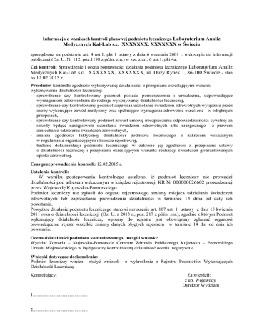 Informacja o wynikach kontroli planowej podmiotu leczniczego Laboratorium Analiz Medycznych Kal-Lab s.c. XXXXXXX, XXXXXXX w Świeciu sporządzona na podstawie art. 4 ust.1, pkt 1 ustawy z dnia 6 września 2001 r. o dostępie do informacji publicznej (Dz. U. Nr 112, poz.1198 z późn. zm.) w zw. z art. 6 ust.1, pkt 4a. Cel kontroli: Sprawdzenie i ocena poprawności działania podmiotu leczniczego Laboratorium Analiz Medycznych Kal-Lab s.c. XXXXXXX, XXXXXXX, ul. Duży Rynek 1, 86-100 Świecie - stan na 12.02.2015 r. Przedmiot kontroli: zgodność wykonywanej działalności z przepisami określającymi warunki wykonywania działalności leczniczej: - sprawdzenie czy kontrolowany podmiot posiada pomieszczenia i urządzenia, odpowiadające wymaganiom odpowiednim do rodzaju wykonywanej działalności leczniczej, - sprawdzenie czy kontrolowany podmiot zapewnia udzielanie świadczeń zdrowotnych wyłącznie przez osoby wykonujące zawód medyczny oraz spełniające wymagania zdrowotne określone w odrębnych przepisach, - sprawdzenie czy kontrolowany podmiot zawarł umowę ubezpieczenia odpowiedzialności cywilnej za szkody będące następstwem udzielania świadczeń zdrowotnych albo niezgodnego z prawem zaniechania udzielania świadczeń zdrowotnych, - analiza zgodności faktycznej działalności podmiotu leczniczego z zakresem wskazanym w regulaminie organizacyjnym i księdze rejestrowej, - badanie dokumentacji podmiotu leczniczego w zakresie jej zgodności z przepisami ustawy o działalności leczniczej i przepisami określającymi warunki realizacji świadczeń gwarantowanych opieki zdrowotnej. Czas przeprowadzenia kontroli: 12.02.2015 r. Ustalenia kontroli: W wyniku postępowania kontrolnego ustalono, iż podmiot leczniczy nie prowadzi działalności pod adresem wskazanym w księdze rejestrowej, KR Nr 000000026602 prowadzonej przez Wojewodę Kujawsko-Pomorskiego. Podmiot leczniczy nie zgłosił do organu rejestrowego zmiany miejsca udzielania świadczeń zdrowotnych lub zaprzestania prowadzenia działalności w terminie 14 dnia od daty ich powstania. Powyższe działanie podmiotu leczniczego stanowi naruszenie art. 107 ust. 1 ustawy z dnia 15 kwietnia 2011 roku o działalności leczniczej (Dz. U. z 2013 r., poz. 217 z późn. zm.), zgodnie z którym Podmiot wykonujący działalność leczniczą, wpisany do rejestru jest obowiązany zgłaszać organowi prowadzącemu rejestr wszelkie zmiany danych objętych rejestrem w terminie 14 dni od dnia ich powstania. Ocena działalności podmiotu kontrolowanego, uwagi i wnioski: Wydział Zdrowia – Kujawsko-Pomorskie Centrum Zdrowia Publicznego Kujawsko – Pomorskiego Urzędu Wojewódzkiego w Bydgoszczy kontrolowaną działalność ocenia negatywnie. Wnioski dotyczące doskonalenia: Podmiot leczniczy winien złożyć wniosek Działalność Leczniczą. Kontrolujący: 1.............................................. 2.............................................. o wykreślenie z Rejestru Podmiotów Wykonujących Zatwierdził: z up. Wojewody Dyrektor Wydziału