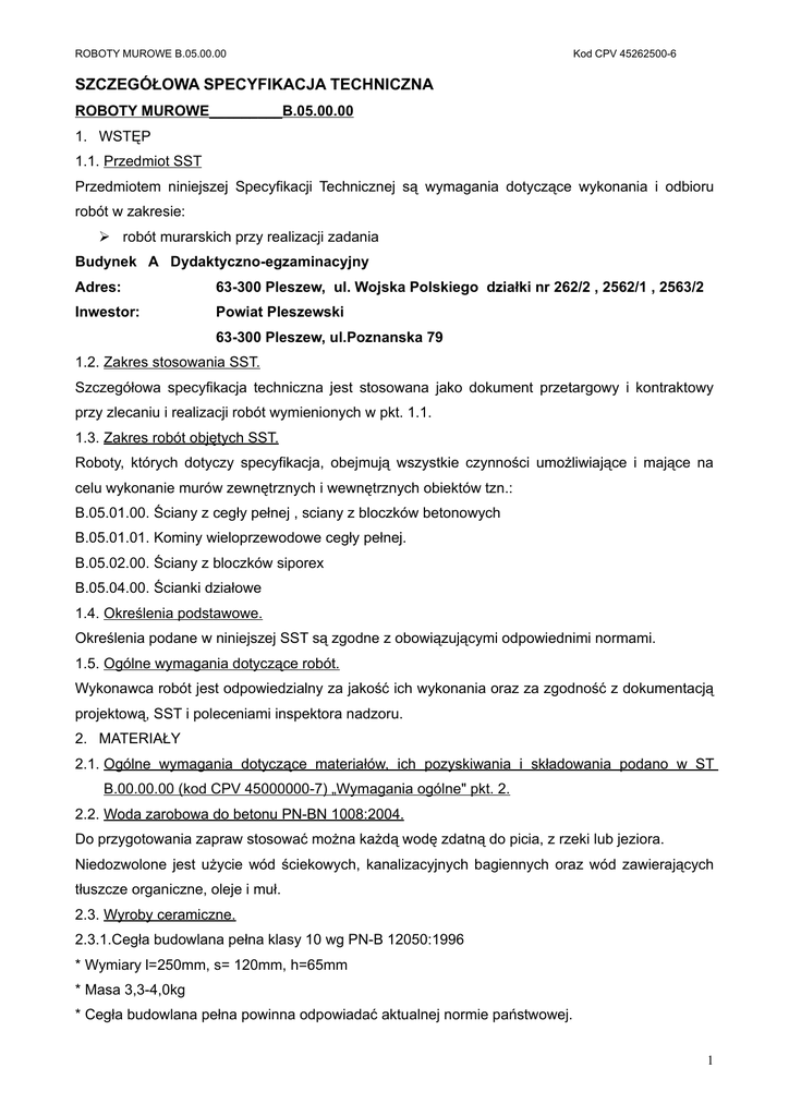 ROBOTY MUROWE B.05.00.00 Kod CPV 45262500-6 SZCZEGÓŁOWA SPECYFIKACJA TECHNICZNA ROBOTY MUROWE_________B.05.00.00 1. WSTĘP 1.1. Przedmiot SST Przedmiotem niniejszej Specyfikacji Technicznej są wymagania dotyczące wykonania i odbioru robót w zakresie: robót murarskich przy realizacji zadania Budynek A Dydaktyczno-egzaminacyjny Adres: 63-300 Pleszew, ul. Wojska Polskiego działki nr 262/2 , 2562/1 , 2563/2 Inwestor: Powiat Pleszewski 63-300 Pleszew, ul.Poznanska 79 1.2. Zakres stosowania SST. Szczegółowa specyfikacja techniczna jest stosowana jako dokument przetargowy i kontraktowy przy zlecaniu i realizacji robót wymienionych w pkt. 1.1. 1.3. Zakres robót objętych SST. Roboty, których dotyczy specyfikacja, obejmują wszystkie czynności umożliwiające i mające na celu wykonanie murów zewnętrznych i wewnętrznych obiektów tzn.: B.05.01.00. Ściany z cegły pełnej , sciany z bloczków betonowych B.05.01.01. Kominy wieloprzewodowe cegły pełnej. B.05.02.00. Ściany z bloczków siporex B.05.04.00. Ścianki działowe 1.4. Określenia podstawowe. Określenia podane w niniejszej SST są zgodne z obowiązującymi odpowiednimi normami. 1.5. Ogólne wymagania dotyczące robót. Wykonawca robót jest odpowiedzialny za jakość ich wykonania oraz za zgodność z dokumentacją projektową, SST i poleceniami inspektora nadzoru. 2. MATERIAŁY 2.1. Ogólne wymagania dotyczące materiałów, ich pozyskiwania i składowania podano w ST B.00.00.00 (kod CPV 45000000-7) „Wymagania ogólne" pkt. 2. 2.2. Woda zarobowa do betonu PN-BN 1008:2004. Do przygotowania zapraw stosować można każdą wodę zdatną do picia, z rzeki lub jeziora. Niedozwolone jest użycie wód ściekowych, kanalizacyjnych bagiennych oraz wód zawierających tłuszcze organiczne, oleje i muł. 2.3. Wyroby ceramiczne. 2.3.1.Cegła budowlana pełna klasy 10 wg PN-B 12050:1996 * Wymiary l=250mm, s= 120mm, h=65mm * Masa 3,3-4,0kg * Cegła budowlana pełna powinna odpowiadać aktualnej normie państwowej. 1 ROBOTY MUROWE B.05.00.00 Kod CPV 45262500-6 * Dopuszczalna liczba cegieł połówkowych, pękniętych całkowicie lub z jednym pęknięciem przechodzącym przez całą grubość cegły o długości powyżej 6 mm nie może przekraczać dla cegły - 10% cegieł badanych. * Nasiąkliwość nie powinna być wyższa niż 24%. * Wytrzymałość na ściskanie 10,0 MPa * Gęstość pozorna 1,7-1,9 kg/dm3 * Współczynnik przewodności cieplnej 0,52-0,56 W/mK * Odporność na działanie mrozu po 25 cyklach zamrażania do -15°C i odmrażania * brak uszkodzeń po badaniu. * Odporność na uderzenie powinna być taka, aby cegła puszczona z wysokości l ,5m na inne cegły nie rozpadła się. 2.3.2.Cegła budowlana pełna klasy 15 wg PN-B-12050:1996 * Wymiary jak póz. 2.2.1. * Masa 4,0-4,5 kg. * Dopuszczalna ilość cegieł połówkowych, pękniętych do 10% ilości cegieł badanych * Nasiąkliwość nie powinna być większa od 16%. * Wytrzymałość na ściskanie 15 MPa. * Odporność na działanie mrozu jak dla cegły klasy 10 MPa. * Odporność na uderzenie powinna być taka, aby cegła upuszczona z wysokości 1,5 m na inne cegły nie rozpadła się na kawałki; może natomiast wystąpić wy szczerbienie lub jej pęknięcie. Ilość cegieł nie spełniających powyższego wymagania nie powinna być większa niż: * 2 na 15 sprawdzanych cegieł * 3 na 25 sprawdzanych cegieł * 5 na 40 sprawdzanych cegieł 2.3.3.Cegła dziurawka klasy 50 * Wymiary l = 250 mm, s = 120 mm, h = 65 mm * Masa 2,15-2,8 kg * Nasiąkliwość nie powinna być wyższa niż 22%. * Wytrzymałość na ściskanie 5,0 MPa * Gęstość pozorna l ,3 kg/dm3 * Współczynnik przewodności cieplnej 0,55 W/mK. * Odporność na działanie mrozu po 25 cyklach zamrażania do -15°C i odmrażania - brak uszkodzeń po badaniu. 2.3.4.Bloczki z betonu . Wymiary: 25x25x12 cm, 38x25x12 cm. Odmiany: w zależności od ciężaru objętościowego i wytrzymałości na ściskanie. Bloczki przewidziano do uzycia w murach fundamentowych 2.3.5 Bloczki siporex do murowania na cienkie spoiny mają szerokość równą grubości muru. Bloczki podstawowe produkowane są z gładką i z profilowaną powierzchnią czołową na pióro i 2 ROBOTY MUROWE B.05.00.00 Kod CPV 45262500-6 wpust, bloczki uzupełniające - tylko z gładką powierzchnią czołową. Przyjęte przez firmę Xella Polska oznaczenie bloczków składa się z symbolu PP, klasy i odmiany betonu komórkowego YTONG oraz litery (liter) określających ukształtowanie powierzchni bocznych. 2.4. Zaprawy budowlane cementowo-wapienne. Marka i skład zaprawy powinny być zgodne z wymaganiami podanymi w projekcie. Orientacyjny stosunek objętościowy składników zaprawy dla marki 30: cement ciasto wapienne piasek 1 : 1 6 1 : 1 7 1 : 1,7 5 cement wapienne hydratyzowane piasek 1 : 1 6 1 : 1 7 Orientacyjny stosunek objętościowy składników zaprawy dla marki 50: cement ciasto wapienne piasek 1 : 0,3 4 1 : 0,5 4,5 cement wapienne hydratyzowane piasek 1 : 0,3 4 1 : 0,5 4,5 - Przygotowanie zapraw do robót murowych powinno być wykonywane mechanicznie. - Zaprawę należy przygotować w takiej ilości, aby mogła być wbudowana możliwie wcześnie po jej przygotowaniu tj. ok. 3 godzin. Do zapraw murarskich należy stosować piasek rzeczny lub kopalniany. Do zapraw cementowo-wapiennych należy stosować cement portlandzki z dodatkiem żużla lub popiołów lotnych 25 i 35 lub bez dodatków oraz cement hutniczy 25 pod warunkiem, że temperatura otoczenia w ciągu 7 dni od chwili zużycia zaprawy nie będzie niższa niż+5°C. Do zapraw cementowo-wapiennych należy stosować wapno suchogaszone lub gaszone w postaci ciasta wapiennego otrzymanego z wapna niegaszonego, które powinno tworzyć jednolitą i jednobarwną masę, bez grudek niegaszonego wapna i zanieczyszczeń obcych. Skład objętościowy zapraw należy dobierać doświadczalnie, w zależności od wymaganej marki zaprawy oraz rodzaju cementu i wapna. 2.5. Gotowe zaprawy murarskie. D