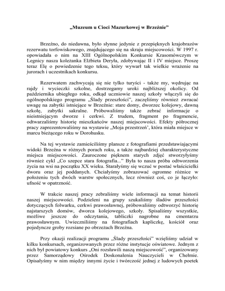 „Muzeum u Cioci Mazurkowej w Brzeźnie” Brzeźno, do niedawna, było słynne jedynie z przepięknych krajobrazów rezerwatu torfowiskowego, znajdującego się na skraju miejscowości. W 1997 r. opowiadała o nim na XIII Ogólnopolskim Konkursie Krasomówczym w Legnicy nasza koleżanka Elżbieta Deryła, zdobywając II i IV miejsce. Proszę teraz Elę o powiedzenie tego teksu, który wywarł tak wielkie wrażenie na jurorach i uczestnikach konkursu. Rezerwatem zachwycają się nie tylko turyści - także my, wędrując na rajdy i wycieczki szkolne, dostrzegamy uroki najbliższej okolicy. Od października ubiegłego roku, odkąd uczniowie naszej szkoły włączyli się do ogólnopolskiego programu „Ślady przeszłości”, zaczęliśmy również zwracać uwagę na zabytki istniejące w Brzeźnie: stare domy, dworzec kolejowy, dawną szkołę, zabytki sakralne. Próbowaliśmy także zebrać informacje o nieistniejącym dworze i cerkwi. Z trudem, fragment po fragmencie, odtwarzaliśmy historię mieszkańców naszej miejscowości. Efekty półrocznej pracy zaprezentowaliśmy na wystawie „Moja przestrzeń’, która miała miejsce w marcu bieżącego roku w Dorohusku. Na tej wystawie zamieściliśmy plansze z fotografiami przedstawiającymi widoki Brzeźna w różnych porach roku, a także najbardziej charakterystyczne miejsca miejscowości. Zauroczone pięknem starych zdjęć stworzyłyśmy również cykl „Co szepce stara fotografia...” Była to nasza próba odtworzenia życia na wsi na początku XX wieku. Starałyśmy się wczuć w postać właścicielki dworu oraz jej poddanych. Chciałyśmy zobrazować ogromne różnice w położeniu tych dwóch warstw społecznych, lecz również coś, co je łączyło: ufność w opatrzność. W trakcie naszej pracy zebraliśmy wiele informacji na temat historii naszej miejscowości. Podzieleni na grupy szukaliśmy śladów przeszłości dotyczących folwarku, cerkwi prawosławnej, próbowaliśmy odtworzyć historię najstarszych domów, dworca kolejowego, szkoły. Spisaliśmy wszystkie, możliwe jeszcze do odczytania, tabliczki nagrobne na cmentarzu prawosławnym. Uwieczniliśmy na fotografiach kapliczkę, kościół oraz pojedyncze groby rozsiane po obrzeżach Brzeźna. Przy okazji realizacji programu „Ślady przeszłości” wzięliśmy udział w kilku konkursach, organizowanych przez różne instytucje oświatowe. Jednym z nich był powiatowy konkurs „Oni rozsławili naszą miejscowość”, organizowany przez Samorządowy Ośrodek Doskonalenia Nauczycieli w Chełmie. Opisałyśmy w nim między innymi życie i twórczość jednej z ludowych poetek Brzeźna, Izabeli Balik. Praca znalazła uznanie w oczach komisji, zajęłyśmy I miejsce. Ja, natomiast, wzięłam udział w konkursie „Kroniki rodzinne”, organizowanym przez Przegląd Reader’s Digest i Ministerstwo Edukacji Narodowej i Sportu. W pracy literackiej zamieściłam opis wydarzeń z życia pięciu pokoleń mojej rodziny, a także ponad sto fotografii z rodzinnych albumów, wiersze, w większości niepublikowane, pisane przez moją prababcię, Izabelę Balik, kopie dokumentów, świadectw i innych pamiątek, będących w posiadaniu rodziny. Za drzewo genealogiczne, dołączone do kroniki, zdobyłam nagrodę specjalną konkursu. Z kolei ja uczestniczyłam w konkursie pt. „Historia jednego domu”, organizowanym przez I Liceum Ogólnokształcące w Chełmie. Opisałam w nim dom Cecylii Mazurek, którym zaopiekowaliśmy się, przeznaczając go na muzeum naszej miejscowości. Niestety, nie znam jeszcze werdyktu komisji konkursowej, gdyż ogłoszenie wyników nastąpi dopiero w czerwcu. W ramach pracy nad tworzeniem muzeum podjęliśmy między innymi takie działania, jak: przeprowadzenie zbiórki dawnego sprzętu domowego, skompletowanie dokumentów, fotografii, starych książek, itp., odnowienie wnętrza domu i zrobienie generalnych porządków oraz urządzenie wnętrza. W sobotę, 25 maja br., na Zamku Królewskim w Warszawie uczestniczyliśmy w ogólnopolskiej prezentacji programu „Ślady przeszłości” połączonej z podsumowaniem prawie rocznych działań podjętych przez uczniów z ponad czterdziestu szkół z całej Polski. Jako jedyni mogliśmy pochwalić się tak daleko posuniętą próbą zachowania historii regionu i tak obywatelskim działaniem – założeniem, przy znacznej pomocy całego społeczeństwa naszej miejscowości, muzeum. Oprócz stałej ekspozycji etnograficznej, mają być w nim docelowo organizowane: pokazy pieczenia chleba, pisania pisanek, plecenia koszy, obrzędy związane ze świętami i polskimi tradycjami ludowymi. Jesteśmy przekonani, że zrealizujemy nasze plany. Na razie cieszymy się, że udało się ocalić od zapomnienia fragment historii naszej miejscowości. Nasze muzeum, będące być może początkiem małego skansenu, stwarza nowe perspektywy dla Brzeźna. Istnieje bowiem możliwość współpracy z Ośrodkiem Dydaktyczno-Muzealnym Zarządu Chełmskich Parków Krajobrazowych.. Zwiedzający rezerwat, czy też przyjeżdżający na warsztaty ekologiczne uczniowie, mogą od dziś również zajrzeć do muzeum „U Cioci Mazurkowej”. Zwiedzając je mogą się przekonać o wyjątkowym charakterze tego miejsca, prezentującego niezwykłość codziennej egzystencji. Jeszcze raz proszę Elę o zabranie głosu – opowie nam o roli skansenów w odtwarzaniu historii danego regionu. Idea gromadzenia obiektów architektury na wydzielonym obszarze otwartej przestrzeni wraz z ich tradycyjnym wyposażeniem i otoczeniem ma już ponad stuletnią historię. W roku 1891 Artur Hazelius udostępnił w Sztokholmie pierwsze muzeum na wolnym powietrzu. Realizatorem pierwszego skansenu w Polsce był Izydor Gulgowski. W 1906 r. wykupił on we Wdzydzach Kiszewskich chatę i wyposażył jej wnętrze. Takie były początki Kaszubskiego Parku Etnograficznego. Obecnie w naszym kraju znajduje się 29 muzeów etnograficznych na wolnym powietrzu oraz ponad 3