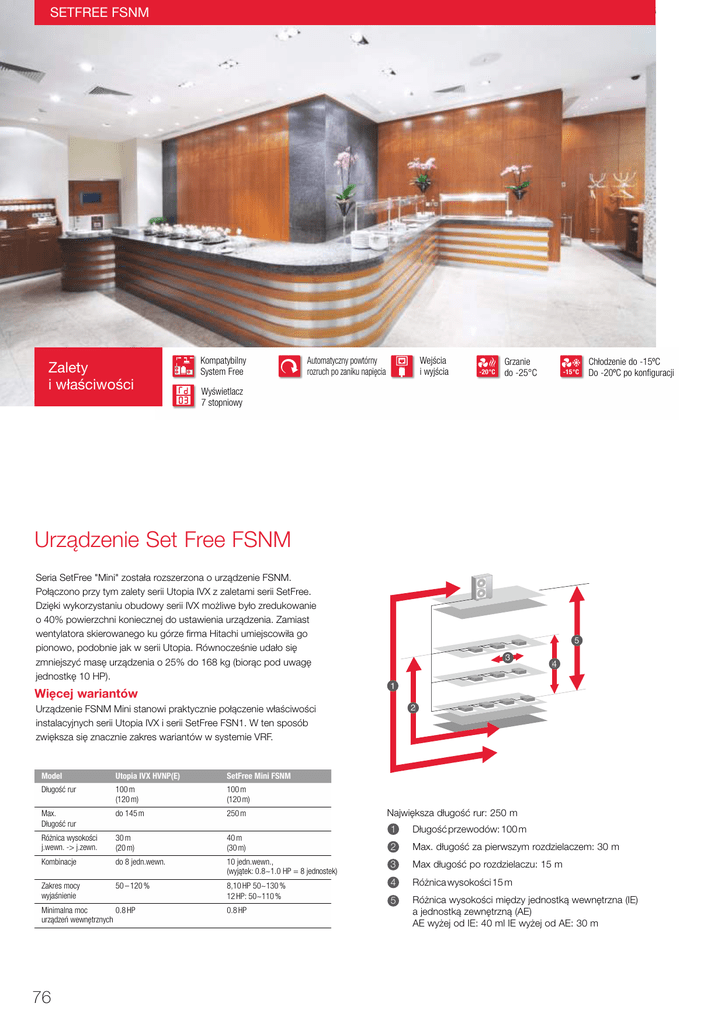 SETFREE FSNM Zalety i właściwości Kompatybilny System Free Automatyczny powtórny rozruch po zaniku napięcia Wejścia i wyjścia -20 °C Grzanie do -25°C -15 °C Chłodzenie do -15ºC Do -20ºC po konfiguracji Wyświetlacz 7 stopniowy Urządzenie Set Free FSNM Seria SetFree "Mini" została rozszerzona o urządzenie FSNM. Połączono przy tym zalety serii Utopia IVX z zaletami serii SetFree. Dzięki wykorzystaniu obudowy serii IVX możliwe było zredukowanie o 40% powierzchni koniecznej do ustawienia urządzenia. Zamiast wentylatora skierowanego ku górze firma Hitachi umiejscowiła go pionowo, podobnie jak w serii Utopia. Równocześnie udało się zmniejszyć masę urządzenia o 25% do 168 kg (biorąc pod uwagę jednostkę 10 HP). 5 3 1 Więcej wariantów 2 Urządzenie FSNM Mini stanowi praktycznie połączenie właściwości instalacyjnych serii Utopia IVX i serii SetFree FSN1. W ten sposób zwiększa się znacznie zakres wariantów w systemie VRF. Model Utopia IVX HVNP(E) SetFree Mini FSNM Długość rur 100 m (120 m) 100 m (120 m) Max. Długość rur do 145 m 250 m Różnica wysokości j.wewn. -> j.zewn. 30 m (20 m) 40 m (30 m) Kombinacje do 8 jedn.wewn. Zakres mocy wyjaśnienie 50 – 120 % Minimalna moc 0.8 HP urządzeń wewnętrznych 76 4 Największa długość rur: 250 m 1 Długość przewodów: 100 m 2 Max. długość za pierwszym rozdzielaczem: 30 m 10 jedn.wewn., (wyjątek: 0.8~1.0 HP = 8 jednostek) 3 Max długość po rozdzielaczu: 15 m 8,10 HP 50~130 % 12 HP: 50~110 % 4 Różnica wysokości 15 m 5 Różnica wysokości między jednostką wewnętrzna (IE) a jednostką zewnętrzną (AE) AE wyżej od IE: 40 ml IE wyżej od AE: 30 m 0.8 HP Jednostki zewnętrzne: pompa ciepła FSNM 400 V / 3 fazy RAS-8FSNM RAS-10FSNM RAS-12FSNM Nominalna moc chłodnicza 1 (Zakres regulacji) Jednostka zewnętrzna SetFree FSNM kW 22,4 (2,2~22,4) 28,0 (2,2~28,0) 33,5 (2,2~33,5) Nominalna moc grzewcza 2 (Zakres regulacji) kW 25,0 (2,5~25,0) 31,5 (2,5~31,5) 37,5 (2,5~37,5) 2~10 2~10 2~10 50~130 % (4~10,4∗) 50~130 % (5~13,0∗) 50~130 % (6~15,6∗) Ilość jednostek wewnętrznych min.~max. Nominalna moc przyłączeniowa min.~max. (HP) % Napięcie zasilania 50 Hz V / Ph 400 / 3 400 / 3 400 / 3 Nominalna moc pobierana (chłodzenie/grzanie) kW 6,3 / 5,9 8,3 / 7,8 10,7 / 9,9 Współczynnik EER / COP (100 %) W /W 3,56 / 4,24 3,37 / 4,04 3,13 / 3,79 Prąd pracy chłodzenie / grzanie (max.) A 10,3 / 9,6 (14,0) 13,6 / 12,4 (18,0) 17,3 / 16,0 (23,0) Bezpiecznik (prąd pracy) A 20 (8) 20 (8) 25 (8) Wymiary jednostki zewnętrznej (wys. x szer. x głęb.) mm 1.650 × 1.100 × 390 1.650 × 1.100 × 390 1.650 × 1.100 × 390 173 (6,5) Masa urządzenia (Ilość czynnika R410A) kg 170 (5,0) 170 (5,5) Poziom ciśnienia akustycznego3 (chłodzenie / grzanie) dB(A) 53 / 55 56 / 58 59 / 61 Przepływ powietrza zewn. (max.) m³ / h 7.260 9.000 9.780 Zakres pracy jednostki zewnętrznej4 (max.) °C Chłodzenie: -5°C ~ +46°C ts (-20°C po konfiguracji); Grzanie: -20°C ~ +15°C tm Czynnik R410A, elektroniczny zawór rozprężny, zawór, separator cieczy, obieg subcoolera Obieg chłodniczy system 2-rurowy: jednoczesne chłodzenie i grzanie nie jest możliwe Wykonanie obiegu chłodniczego Maksymalna długość rur m 100 (j.wewn. - j.zewn.), 250 (cały układ), 40 (za pierwszym rozdzielaczem) Różnica wysokości max. m 40 (Jednostka zewnętrzna wyżej), 30 (Jednostka zewnętrzna wyżej), 15 (pomiędzy jednostkami wewnętrznymi) Króćce rurowe (rura cieczowa / rura gazowa) mm 9,53 / 19,05 12,7 / 22,2 12,7 / 25,4~28,6 1 Nominalna moc chłodnicza przy: temp. pomieszczenia 27°C (19°C tm) i temp. zewn. 35°C; długość rur 7,5 m; różnica wysokości 0 m. Nominalna moc grzewcza przy: temp. pomieszczenia 20°C i temp. wewn. 7°C (6°C tm); długość rur 7,5 m; różnica wysokości 0 m. Poziom hałasu pomiar w odl. 1 m (pomiar w pomieszczeniu bezechowym). 4 Zasadniczo odradza się pracę w trybie chłodzenia pojedynczą jednostką wewnętrzną (pomieszczeń technologicznych) w zimie (Temp. wymiennika byt duża => mogą być problemy ze sterowaniem. Należy ustawić co najmniej 50% nominalnej mocy chłodniczej). Dla trybu chłodzenia przy temp. zewn. do -20°C po skonfigurowaniu. * HP = Suma mocy chłodniczej jednostek wewnętrznych. 2 3 Pozostałe warunki pomiaru: pomiar przy podłączonych jednostkach wewnętrznych o jednakowej mocy jak dla jednostki zewnętrznej (dla 100 %). Urządzenia oznaczone tym znakiem są certyfikowane przez Eurovent. 77