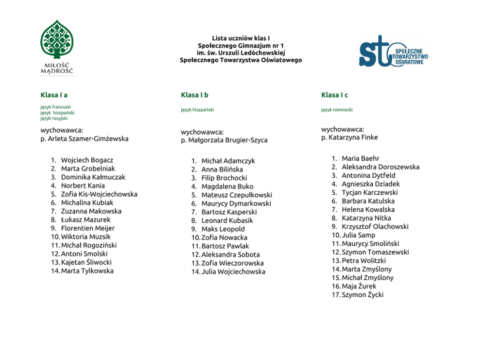 Lista uczniów klas I Społecznego Gimnazjum nr 1 im. św. Urszuli Ledóchowskiej Społecznego Towarzystwa Oświatowego Klasa I a język francuski język hiszpański język rosyjski wychowawca: p. Arleta Szamer-Gimżewska 1. Wojciech Bogacz 2. Marta Grobelniak 3. Dominika Kałmuczak 4. Norbert Kania 5. Zofia Kis-Wojciechowska 6. Michalina Kubiak 7. Zuzanna Makowska 8. Łukasz Mazurek 9. Florentien Meijer 10. Wiktoria Muzsik 11. Michał Rogoziński 12. Antoni Smolski 13. Kajetan Śliwocki 14. Marta Tylkowska Klasa I b Klasa I c język hiszpański język niemiecki wychowawca: p. Małgorzata Brugier-Szyca 1. Michał Adamczyk 2. Anna Bilińska 3. Filip Brochocki 4. Magdalena Buko 5. Mateusz Czepułkowski 6. Maurycy Dymarkowski 7. Bartosz Kasperski 8. Leonard Kubasik 9. Maks Leopold 10. Zofia Nowacka 11. Bartosz Pawlak 12. Aleksandra Sobota 13. Zofia Wieczorowska 14. Julia Wojciechowska wychowawca: p. Katarzyna Finke 1. Maria Baehr 2. Aleksandra Doroszewska 3. Antonina Dytfeld 4. Agnieszka Dziadek 5. Tycjan Karczewski 6. Barbara Katulska 7. Helena Kowalska 8. Katarzyna Nitka 9. Krzysztof Olachowski 10. Julia Samp 11. Maurycy Smoliński 12. Szymon Tomaszewski 13. Petra Wolitzki 14. Marta Zmyślony 15. Michał Zmyślony 16. Maja Żurek 17. Szymon Życki
