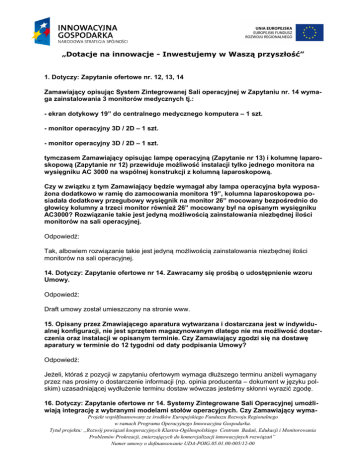 „Dotacje na innowacje - Inwestujemy w Waszą przyszłość” 1. Dotyczy: Zapytanie ofertowe nr. 12, 13, 14 Zamawiający opisując System Zintegrowanej Sali operacyjnej w Zapytaniu nr. 14 wymaga zainstalowania 3 monitorów medycznych tj.: - ekran dotykowy 19” do centralnego medycznego komputera – 1 szt. - monitor operacyjny 3D / 2D – 1 szt. - monitor operacyjny 3D / 2D – 1 szt. tymczasem Zamawiający opisując lampę operacyjną (Zapytanie nr 13) i kolumnę laparoskopową (Zapytanie nr 12) przewiduje możliwość instalacji tylko jednego monitora na wysięgniku AC 3000 na wspólnej konstrukcji z kolumną laparoskopową. Czy w związku z tym Zamawiający będzie wymagał aby lampa operacyjna była wyposażona dodatkowo w ramię do zamocowania monitora 19”, kolumna laparoskopowa posiadała dodatkowy przegubowy wysięgnik na monitor 26” mocowany bezpośrednio do głowicy kolumny a trzeci monitor również 26” mocowany był na opisanym wysięgniku AC3000? Rozwiązanie takie jest jedyną możliwością zainstalowania niezbędnej ilości monitorów na sali operacyjnej. Odpowiedź: Tak, albowiem rozwiązanie takie jest jedyną możliwością zainstalowania niezbędnej ilości monitorów na sali operacyjnej. 14. Dotyczy: Zapytanie ofertowe nr 14. Zawracamy się prośbą o udostępnienie wzoru Umowy. Odpowiedź: Draft umowy został umieszczony na stronie www. 15. Opisany przez Zmawiającego aparatura wytwarzana i dostarczana jest w indywidualnej konfiguracji, nie jest sprzętem magazynowanym dlatego nie ma możliwość dostarczenia oraz instalacji w opisanym terminie. Czy Zamawiający zgodzi się na dostawę aparatury w terminie do 12 tygodni od daty podpisania Umowy? Odpowiedź: Jeżeli, któraś z pozycji w zapytaniu ofertowym wymaga dłuższego terminu aniżeli wymagany przez nas prosimy o dostarczenie informacji (np. opinia producenta – dokument w języku polskim) uzasadniającej wydłużenie terminu dostaw wówczas jesteśmy skłonni wyrazić zgodę. 16. Dotyczy: Zapytanie ofertowe nr 14. Systemy Zintegrowane Sali Operacyjnej umożliwiają integrację z wybranymi modelami stołów operacyjnych. Czy Zamawiający wymaProjekt współfinansowany ze środków Europejskiego Funduszu Rozwoju Regionalnego w ramach Programu Operacyjnego Innowacyjna Gospodarka. Tytuł projektu: „Rozwój powiązań kooperacyjnych Klastra-Ogólnopolskiego Centrum Badań, Edukacji i Monitorowania Problemów Prokreacji, zmierzających do komercjalizacji innowacyjnych rozwiązań” Numer umowy o dofinansowanie UDA-POIG.05.01.00-005/12-00 „Dotacje na innowacje - Inwestujemy w Waszą przyszłość” ga integracji Systemu opisanego w pkt 1 ze stołem operacyjnym? Jeśli tak, to czy Zamawiający zgodzi się na dostarczenie Systemu Zintegrowanego, kompatybilnego z następującymi modelami stołów operacyjnych: - BERCHTOLD OPERON, B 710 - BERCHTOLD OPERON, B 810 - Maquet Alphamaquet, 1150 - Maquet Alphamaxx, 1133 - Maquet Alphastar, 1132 - Maquet Alphastar (Pro) - Maquet BetaStar - Maquet Magnus - OPT OR-Table, OPT/90, OPT/100, OPT VANTO - Trumpf Jupiter - Trumpf Mars - Trumpf Mard 2 - Trumpf MarsEndouro - Trumpf SATURN Select - Trumpf TITAN - Trumpf TruSystem 5500 / 7500 - STERIS OR-Table 3085 SP - Eschmann OR Tables T20/T30 - Merivaara OR Table PromeriX - Schmitz & Söhne OR Table Diamond - Schaerer Medical arcus 501, arcus 601, arcus 701 Odpowiedź: Projekt współfinansowany ze środków Europejskiego Funduszu Rozwoju Regionalnego w ramach Programu Operacyjnego Innowacyjna Gospodarka. Tytuł projektu: „Rozwój powiązań kooperacyjnych Klastra-Ogólnopolskiego Centrum Badań, Edukacji i Monitorowania Problemów Prokreacji, zmierzających do komercjalizacji innowacyjnych rozwiązań” Numer umowy o dofinansowanie UDA-POIG.05.01.00-005/12-00 „Dotacje na innowacje - Inwestujemy w Waszą przyszłość” Tak, albowiem zamawiający wymaga integracji Systemu opisanego w pkt 1 ze stołem operacyjnym. Projekt współfinansowany ze środków Europejskiego Funduszu Rozwoju Regionalnego w ramach Programu Operacyjnego Innowacyjna Gospodarka. Tytuł projektu: „Rozwój powiązań kooperacyjnych Klastra-Ogólnopolskiego Centrum Badań, Edukacji i Monitorowania Problemów Prokreacji, zmierzających do komercjalizacji innowacyjnych rozwiązań” Numer umowy o dofinansowanie UDA-POIG.05.01.00-005/12-00