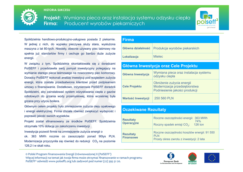 HISTORIA SUKCESU Projekt: Wymiana pieca oraz instalacja systemu odzysku ciepła Firma: Producent wyrobów piekarniczych Przed jednej z nich, Spółdzielnia handlowo-produkcyjno-usługowa posiada 2 piekarnie. W do wypieku pieczywa służy stara, wysłużona modernizacją maszyna z lat 80-tych. Niestety, obecnie używany piec taśmowy nie spełnia już standartów firmy i cechuje go bardzo duże zużycie energii. W związku z tym, Spółdzielnia skontaktowała się z doradcami PolSEFF i przedstawiła swój pomysł inwestycyjny polegający na wymianie starego pieca taśmowego na nowoczesny piec komorowy. Firma Po modernizacji Główna działalność Produkcja wyrobów piekarskich Lokalizacja Główna Inwestycja oraz Cele Projektu Główna Inwestycja Wymiana pieca oraz instalacja systemu odzysku ciepła Cele Projektu Obniżenie zużycia energii Modernizacja przedsiębiorstwa Podniesienie jakości produkcji Doradcy PolSEFF wykonali analizę inwestycji pod względem zużycia energii, która została przedsatwiona klientowi przed podpisaniem umowy o finansowanie. Dodatkowo, inżynierowie PolSEFF doradzili Spółdzielni, aby zainstalować system odzyskiwania ciepła z gazów odlotowych do grzania wody przemysłowej, która wcześniej była grzana przy użyciu boilera. Głównym celem projektu było zmniejszenie zużycia oleju opałowego i energii elektrycznej. Firma chciała również zwiększyć wydajność i Wartość Inwestycji otrzymała 10% dotację po zakończeniu inwestycji . Inwestycja pozwoli firmie na zmniejszenie zużycia energii o ok. 363 MWh rocznie co zaoszczędzi ponad 90tys PLN. 250 560 PLN Oczekiwane Rezultaty poprawić jakość swoich wypieków. Projekt został sfinansowany ze środków PolSEFF. Spółdzielnia Mielec Rezultaty Operacyjne Roczne oszczędności energii: 363 MWh 74% Roczny spadek emisji CO2: 126 ton Rezultaty Finansowe Roczne oszczędności kosztów energii: 91 550 PLN Prosty okres zwrotu z inwestycji: 2 lata Modernizacja przyczyniła się również do redukcji CO2 na poziomie 126,2 t w skali roku. © Polski Program Finansowania Energii Zrównoważonej II (PolSEFF2) Więcej informacji na temat jak twoja firma może otrzymać finansowanie w ramach programu PolSEFF2 odwiedź www.polseff2.org lub zadzwoń pod numer (22) 395 51 20. HISTORIA SUKCESU Projekt: Wymiana pieca oraz instalacja systemu odzysku ciepła Firma: Producent wyrobów piekarniczych Po Modernizacji Przed Modernizacją Inwestycja / Rodzaj Urządzenia Wartość inwestycji Rok produkcji Roczna produkcja Wzrost produkcji z tytułu wymiany Zużycie energii elektrycznej Zużycie oleju opałowego Oszczędności energii Zmniejszenie emisji CO2 Oszczędności kosztów zużycia energii j.m. Przed Modernizacją Po Modernizacji - Piec taśmowy PTC 24/165 Piec komorowy IBIS-‐RP 27 PLN -‐-‐ -‐-‐ - 1988 2013 kg/rok 213 804 220 800 % 3,2 kWh/rok 53 046 14 213 l/rok 45 289 11 477 % 74,5 t/rok 126 PLN/rok 91 550 © Polski Program Finansowania Energii Zrównoważonej II (PolSEFF2) Więcej informacji na temat jak twoja firma może otrzymać finansowanie w ramach programu PolSEFF2 odwiedź www.polseff2.org lub zadzwoń pod numer (22) 395 51 20.