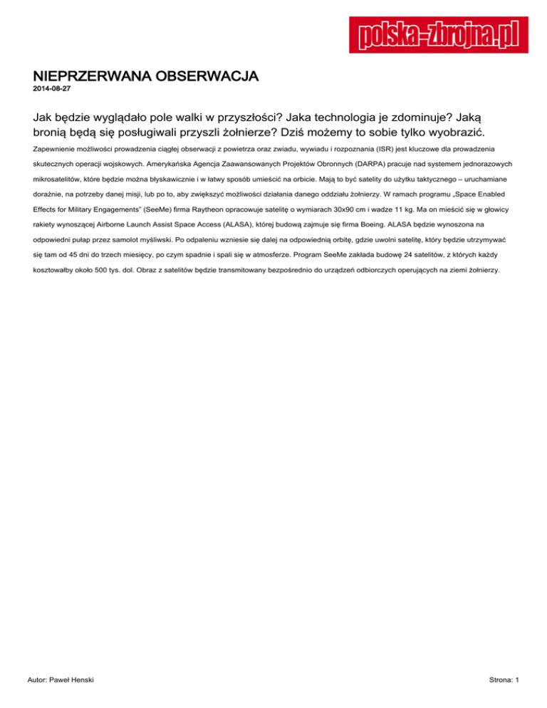 NIEPRZERWANA OBSERWACJA 2014-08-27 Jak będzie wyglądało pole walki w przyszłości? Jaka technologia je zdominuje? Jaką bronią będą się posługiwali przyszli żołnierze? Dziś możemy to sobie tylko wyobrazić. Zapewnienie możliwości prowadzenia ciągłej obserwacji z powietrza oraz zwiadu, wywiadu i rozpoznania (ISR) jest kluczowe dla prowadzenia skutecznych operacji wojskowych. Amerykańska Agencja Zaawansowanych Projektów Obronnych (DARPA) pracuje nad systemem jednorazowych mikrosatelitów, które będzie można błyskawicznie i w łatwy sposób umieścić na orbicie. Mają to być satelity do użytku taktycznego – uruchamiane doraźnie, na potrzeby danej misji, lub po to, aby zwiększyć możliwości działania danego oddziału żołnierzy. W ramach programu „Space Enabled Effects for Military Engagements” (SeeMe) firma Raytheon opracowuje satelitę o wymiarach 30x90 cm i wadze 11 kg. Ma on mieścić się w głowicy rakiety wynoszącej Airborne Launch Assist Space Access (ALASA), której budową zajmuje się firma Boeing. ALASA będzie wynoszona na odpowiedni pułap przez samolot myśliwski. Po odpaleniu wzniesie się dalej na odpowiednią orbitę, gdzie uwolni satelitę, który będzie utrzymywać się tam od 45 dni do trzech miesięcy, po czym spadnie i spali się w atmosferze. Program SeeMe zakłada budowę 24 satelitów, z których każdy kosztowałby około 500 tys. dol. Obraz z satelitów będzie transmitowany bezpośrednio do urządzeń odbiorczych operujących na ziemi żołnierzy. Autor: Paweł Henski Strona: 1 Alternatywą dla rozpoznania satelitarnego mają być latające statki, utrzymujące się w powietrzu miesiącami lub nawet latami. Program „Vulture” zakłada budowę samolotu bezzałogowego, który będzie mógł przebywać w powietrzu przez ponad pięć lat, wykonując zadania ISR oraz odgrywając rolę latającego centrum łączności. Przypominająca szybowiec maszyna ma mieć silniki śmigłowe napędzane energią słoneczną, gromadzoną w specjalnych komórkach paliwowych. Vulture będzie pomostem pomiędzy tradycyjnymi samolotami zwiadowczymi i rozpoznawczymi a satelitami. DARPA oraz USAF prowadzą również program „Integrated Sensor is Structure” (ISIS), który zakłada budowę olbrzymich stratosferycznych sterowców, wyposażonych w potężne, ale lekkie radary działające w technologii AESA. Radar ma być zintegrowany z konstrukcją sterowca, napędzanego, podobnie jak Vulture, energią słoneczną. Elektromagnes i laser Autor: Paweł Henski Strona: 2 Już w niedalekiej przyszłości na pokładach okrętów US Navy zagoszczą działa elektromagnetyczne oraz laserowe. Wspólne badania prowadzone przez firmy BAE Systems, General Atomics oraz Boeing doprowadziły w 2008 roku do skonstruowania pierwszego szynowego działa elektromagnetycznego. Dziś jest to w pełni funkcjonalna konstrukcja, którą już niedługo będzie można zainstalować na pokładzie okrętu. Działo o mocy 32 MJ jest w stanie wystrzelić ważący około 10 kg pocisk z prędkością rzędu Ma = 7 na odległość ponad 160 km. Pociski o mniejszej wadze będzie można miotać na dystansach 200–300 km. Lecące z olbrzymią prędkością nie potrzebują żadnego materiału wybuchowego – zniszczą cel samą energią kinetyczną. Dzisiejsze pociski okrętowe, wspomagane napędem rakietowym (ERGM), osiągają maksymalny zasięg około 100 km. Większy mają już tylko rakiety. Ograniczenia fizyczne ładunków miotających sprawiają, że tradycyjne pociski nie osiągają prędkości wylotowej większej niż 1,5 km/s. Działo elektromagnetyczne potrafi wystrzelić z prędkością wylotową od 2,5 do 6 km/s. Już 2,5 km/s pozwala rozpędzić pocisk do prędkości rzędu Ma = 5. Działa elektromagnetyczne sprawią, że spod pokładów okrętów znikną ładunki i materiały wybuchowe, zarówno służące do wystrzeliwania pocisków, jak i te znajdujące się w ich głowicach. Wyeliminuje to chociażby niebezpieczeństwo wybuchu amunicji w razie pożaru. Pod pokładem, na tej samej powierzchni użytkowej, będzie można zmagazynować dziesięć razy więcej pocisków do działa elektromagnetycznego niż obecnie. Pociski kinetyczne wyposażone w systemy naprowadzania precyzyjnego (GPS/INS) docelowo zastąpią rakiety manewrujące typu Cruise. W dodatku ich koszt będzie stanowił ułamek tego, ile trzeba zapłacić za rakiety Tomahawk. Opracowanie działa laserowego okazuje się większym wyzwaniem. Amerykańskie siły powietrzne przez lata prowadziły program budowy powietrznego lasera tlenowo-jodowego (ABL) zdolnego do zestrzeliwania rakiet balistycznych. W 2007 roku umieszczony na pokładzie Boeinga 747 laser zdołał zniszczyć lecącą rakietę. Jednakże wykorzystanie bojowe chemicznego lasera tlenowo-jodowego okazało się ślepym zaułkiem. Jest zbyt skomplikowany, zajmuje za dużo miejsca, a efektywność jego działania jest niewystarczająca. W ostatnich latach nastąpił szybki rozwój laserów półprzewodnikowych oraz tzw. laserów na ciele stałym. Są to konstrukcje mniej skomplikowane i bardziej poręczne. US Navy w ramach programu LAWS testuje laser docelowo przystosowany do zamontowania na pokładach okrętów. Jak na razie, te urządzenia będą służyć do niszczenia mniej zaawansowanych celów, takich jak niewielkie jednostki nawodne czy samoloty bezzałogowe. W przyszłości będą niszczyć zagrażające okrętom rakiety, pociski czy torpedy. Oczywiście działo laserowe nie strzela, jak ma to miejsce w filmach fantastycznych. Generuje stały promień, który przepala wyznaczony cel, podobnie jak przepuszczone przez szkło powiększające światło słoneczne przepala kartkę papieru. Dopracowanie i miniaturyzacja laserów sprawią, że w przyszłości będzie to broń montowana również w pojazdach naziemnych oraz w samolotach. Już dziś DARPA prowadzi program HELLADS, którego celem jest skonstruowanie lasera o mocy 150 kW. Ma on mieć komp