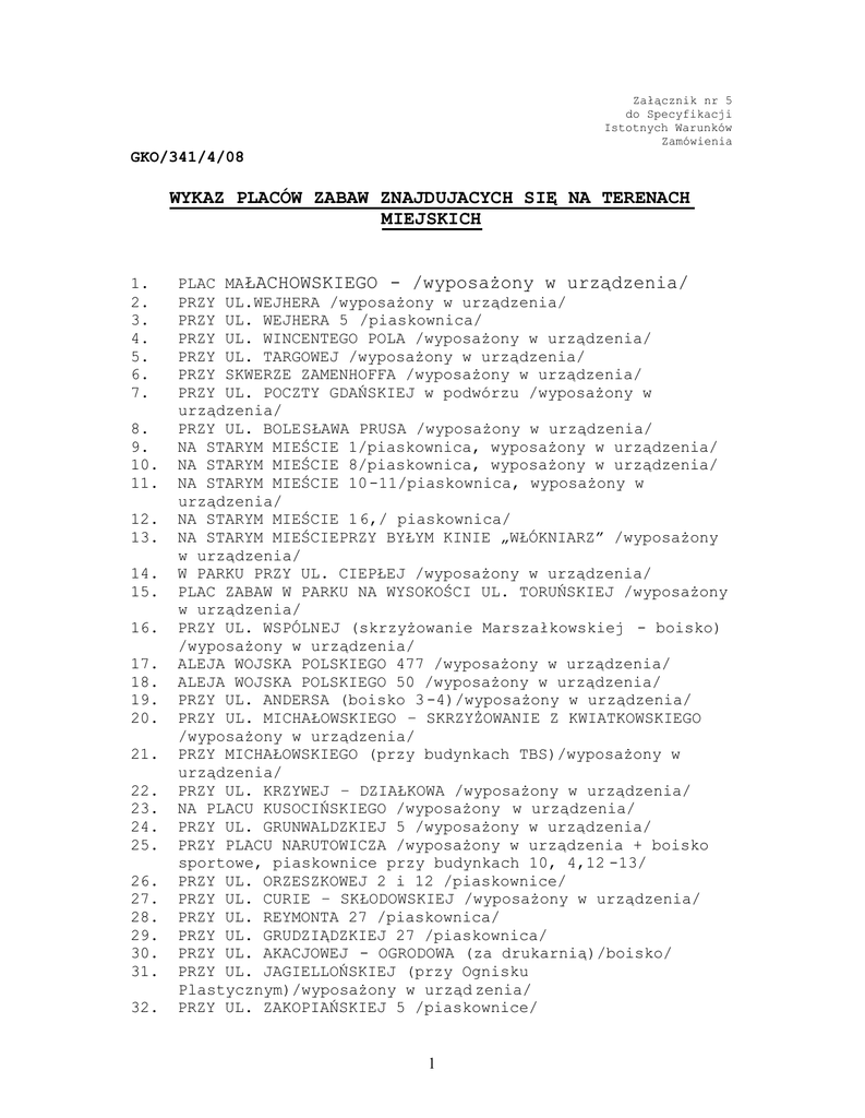 Załącznik nr 5 do Specyfikacji Istotnych Warunków Zamówienia GKO/341/4/08 WYKAZ PLACÓW ZABAW ZNAJDUJACYCH SIĘ NA TERENACH MIEJSKICH 1. 2. 3. 4. 5. 6. 7. 8. 9. 10. 11. 12. 13. 14. 15. 16. 17. 18. 19. 20. 21. 22. 23. 24. 25. 26. 27. 28. 29. 30. 31. 32. PLAC MA ŁACHOWSKIEGO - /wyposażony w urządzenia/ PRZY UL.WEJHERA /wyposażony w urządzenia/ PRZY UL. WEJHERA 5 /piaskownica/ PRZY UL. WINCENTEGO POLA /wyposażony w urządzenia/ PRZY UL. TARGOWEJ /wyposażony w urządzenia/ PRZY SKWERZE ZAMENHOFFA /wyposażony w urządzenia/ PRZY UL. POCZTY GDAŃSKIEJ w podwórzu /wyposażony w urządzenia/ PRZY UL. BOLESŁAWA PRUSA /wyposażony w urządzenia/ NA STARYM MIEŚCIE 1/piaskownica, wyposażony w urządzenia/ NA STARYM MIEŚCIE 8/piaskownica, wyposażony w urządzenia/ NA STARYM MIEŚCIE 10 -11/piaskownica, wyposażony w urządzenia/ NA STARYM MIEŚCIE 16,/ piaskownica/ NA STARYM MIEŚCIEPRZY BYŁYM KINIE „WŁÓKNIARZ” /wyposażony w urządzenia/ W PARKU PRZY UL. CIEPŁEJ /wyposażony w urządzenia/ PLAC ZABAW W PARKU NA WYSOKOŚCI UL. TORUŃSKIEJ /wyposażony w urządzenia/ PRZY UL. WSPÓLNEJ (skrzyżowanie Marszałkowskiej - boisko) /wyposażony w urządzenia/ ALEJA WOJSKA POLSKIEGO 477 /wyposażony w urządzenia/ ALEJA WOJSKA POLSKIEGO 50 /wyposażony w urządzenia/ PRZY UL. ANDERSA (boisko 3 -4)/wyposażony w urządzenia/ PRZY UL. MICHAŁOWSKIEGO – SKRZYŻOWANIE Z KWIATKOWSKIEGO /wyposażony w urządzenia/ PRZY MICHAŁOWSKIEGO (przy budynkach TBS)/wyposażony w urządzenia/ PRZY UL. KRZYWEJ – DZIAŁKOWA /wyposażony w urządzenia/ NA PLACU KUSOCIŃSKIEGO /wyposażony w urządzenia/ PRZY UL. GRUNWALDZKIEJ 5 /wyposażony w urządzenia/ PRZY PLACU NARUTOWICZA /wyposażony w urządzenia + boisko sportowe, piaskownice przy budynkach 10, 4,12 -13/ PRZY UL. ORZESZKOWEJ 2 i 12 /piaskownice/ PRZY UL. CURIE – SKŁODOWSKIEJ /wyposażony w urządzenia/ PRZY UL. REYMONTA 27 /piaskownica/ PRZY UL. GRUDZIĄDZKIEJ 27 /piaskownica/ PRZY UL. AKACJOWEJ - OGRODOWA (za drukarnią)/boisko/ PRZY UL. JAGIELLOŃSKIEJ (przy Ognisku Plastycznym)/wyposażony w urząd zenia/ PRZY UL. ZAKOPIAŃSKIEJ 5 /piaskownice/ 1 33. 34. 35. 36. 37. 38. 39. 40. 41. PRZY UL. PRZY UL. PRZY UL. PRZY UL. PRZY UL. PRZY UL. PRZY UL. ręcznej/ PRZY UL. PRZY UL. GAŁCZYŃSKIEGO /kosz do piłki ręcznej/ 500-LECIA /piaskownica/ KOSZYKOWEJ /kosz do piłki ręcznej/ SZYMANOWSKIEGO 7 /wyposażony w urządzenia/ GEN. MACZKA 15 /wyposażony w urządzenia/ NOGATOWEJ 95 /wyposażony w urządzenia/ SIENKIEWICZA 41 /w podwórzu/ /kosz do piłki SUCHARSKIEGO /wyposażony w urządzenia/ TCZEWSKIEJ PRZY SZKOLE /wyp osażony w urządzenia/ wyposażony w urządzenia oznacza, że na placu zabaw znajdują się między innymi taki urządzenia jak stoły do tenisa, kosz do piłki ręcznej, piaskownice, równoważnie, huśtawki, obrotnice, wieże drewniane, przeplotnie, ślizgi 2