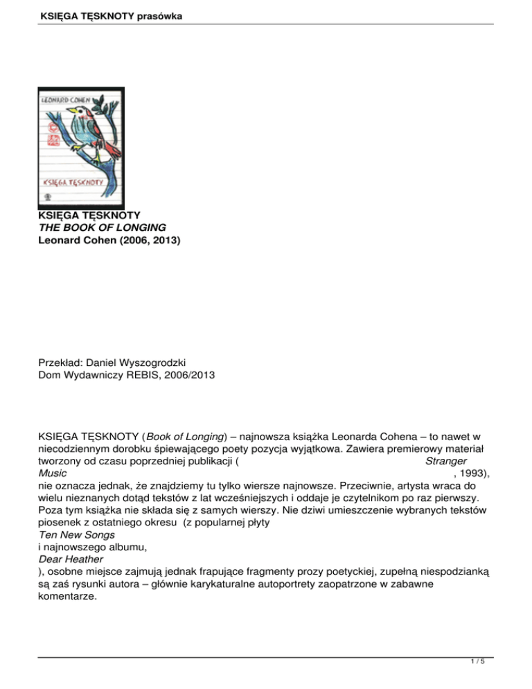 KSIĘGA TĘSKNOTY prasówka KSIĘGA TĘSKNOTY THE BOOK OF LONGING Leonard Cohen (2006, 2013) Przekład: Daniel Wyszogrodzki Dom Wydawniczy REBIS, 2006/2013 KSIĘGA TĘSKNOTY (Book of Longing) – najnowsza książka Leonarda Cohena – to nawet w niecodziennym dorobku śpiewającego poety pozycja wyjątkowa. Zawiera premierowy materiał tworzony od czasu poprzedniej publikacji ( Stranger Music , 1993), nie oznacza jednak, że znajdziemy tu tylko wiersze najnowsze. Przeciwnie, artysta wraca do wielu nieznanych dotąd tekstów z lat wcześniejszych i oddaje je czytelnikom po raz pierwszy. Poza tym książka nie składa się z samych wierszy. Nie dziwi umieszczenie wybranych tekstów piosenek z ostatniego okresu (z popularnej płyty Ten New Songs i najnowszego albumu, Dear Heather ), osobne miejsce zajmują jednak frapujące fragmenty prozy poetyckiej, zupełną niespodzianką są zaś rysunki autora – głównie karykaturalne autoportrety zaopatrzone w zabawne komentarze. 1/5 KSIĘGA TĘSKNOTY prasówka Przewrotny humor i autoironia poety lśnią nieprzerwanie na tych barwnych stronach, a jego główny znak rozpoznawczy – odważna i bardzo oryginalna mieszanka religii i seksu – to poezja jednocześnie tak bardzo perwersyjna i tak mało... bluźniercza. Nowy tom Cohena zaskakuje nie tylko różnorodnością form (imponujące wrażenie robią liczne epigramaty), ale równie szerokim i barwnym spektrum tematycznym. Czy jest to podsumowanie życia artysty? Za wcześnie orzekać. Niewątpliwie jednak mamy tu rekapitulację głównych wątków jego twórczości, a relacje pomiędzy dojrzałym mężczyzną i młodymi kobietami (licznymi) stają się ich wspólnym mianownikiem. Cohen pisze o niemożności zbliżenia (Ciało pełne samotności). Pisze o depresji (Cel). Pisze o swoim wieloletnim nauczycielu, Roshi, i o latach spędzonych w klasztorze zen na górze Baldy. Pisze o przyjaciółkach i o matce. Pisze o Montrealu, Nowym Jorku, Grecji i o Indiach – każde miejsce, w którym mieszkał, ożywa w jego wierszach. Pisze o tym, co dla niego znaczy bycie Żydem ( Ni e jestem Żydem ), pisze śmiało o Żydach i o Niemcach ( Kukiełki ). Żartobliwie, chociaż nie bez złośliwości, wyjaśnia Dlaczego kocha Francję . Ironicznie podsumowuje rewolucyjne przemiany naszych czasów ( Już wtedy było po imprezie ). Wraca do odwiecznych fascynacji ( Lorca żyje ) i uzależnień ( Trzeba mi prochów ). W zaskakującej paraboli Inni autorzy przekonuje skutecznie do „swojej tematyki”. Uważnego czytelnika czeka na tych stronach niejeden lekki szok! „Moim Odkupicielem jest kobieta” wyznaje (Mój odkupiciel) i jest to chyba wyznanie najważniejsze. KSIĘGA TĘSKNOTY składa się bowiem nie tylko na niezwykle intymny, osobisty autoportret człowieka, który pozostaje – wbrew sobie – ikoną naszej epoki, jest także hymnem do kobiety i hołdem wobec kobiety. Niezmiennie niepowtarzalnej. Bazą dla tych rozważań jest prywatna relacja poety z Bogiem, ale także filozofia zen i – nieprzemijająca w jego twórczości – fascynacja postacią Jezusa (Myślałem, że ma rację). Ale 2/5 KSIĘGA TĘSKNOTY prasówka kiedy autor, chociaż zapytuje przewrotnie „dlaczego miałbym dygotać na ołtarzu oświecenia” ( Upadek zen ), podpowiada, jaki trop prowadzi do należytego zrozumienia jego wierszy, sięga po wskazówkę wywodzącą się wprost z filozofii zen: „Nie próbuj słów tych dekodować, to nie drogowskaz tylko droga” ( Ja tylko tyle ). KSIĘGA TĘSKNOTY to wyjątkowa szansa, by poznać Leonarda Cohena tak blisko, jak nigdy dotąd. Bliżej niż na płycie. Bliżej nawet niż na koncercie. Bliżej niż w każdej z jego poprzednich książek. KSIĘGA TĘSKNOTY to poeta nagi. Ale uśmiechnięty. [REBIS press release, 2006] 3/5 KSIĘGA TĘSKNOTY prasówka 4/5 KSIĘGA TĘSKNOTY prasówka 5/5