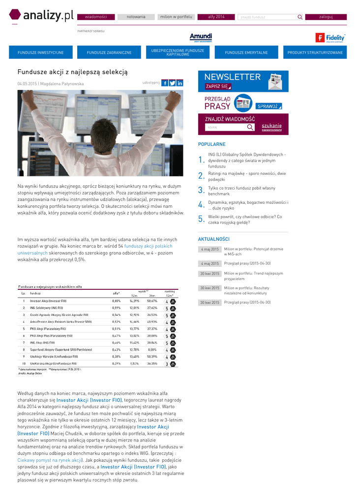 wiadomości notowania milion w portfelu alfy 2014 zaloguj znajdź fundusz PARTNERZY SERWISU FUNDUSZE INWESTYCYJNE FUNDUSZE ZAGRANICZNE UBEZPIECZENIOWE FUNDUSZE KAPITAŁOWE FUNDUSZE EMERYTALNE PRODUKTY STRUKTURYZOWANE Fundusze akcji z najlepszą selekcją 04.05.2015 | Magdalena Patynowska udostępnij: POPULARNE 1. ING (L) Globalny Spółek Dywidendowych dywidendy z całego świata w jednym funduszu 2. Ratingi na majówkę - sporo nowości, dwie podwyżki Na wyniki funduszu akcyjnego, oprócz bieżącej koniunktury na rynku, w dużym stopniu wpływają umiejętności zarządzających. Poza zarządzaniem poziomem zaangażowania na rynku instrumentów udziałowych (alokacja), przewagę konkurencyjną portfela tworzy selekcja. O skuteczności selekcji mówi nam wskaźnik alfa, który pozwala ocenić dodatkowy zysk z tytułu doboru składników. 3. Tylko co trzeci fundusz pobił własny benchmark 4. Dynamika, egzotyka, bogactwo możliwości i … duże ryzyko 5. Wielki powrót, czy chwilowe odbicie? Co czeka rosyjską giełdę? Im wyższa wartość wskaźnika alfa, tym bardziej udana selekcja na tle innych rozwiązań w grupie. Na koniec marca br. wśród 54 funduszy akcji polskich uniwersalnych skierowanych do szerokiego grona odbiorców, w 4 - poziom wskaźnika alfa przekroczył 0,5%. AKTUALNOŚCI Według danych na koniec marca, najwyższym poziomem wskaźnika alfa charakteryzuje się Investor Akcji (Investor FIO), tegoroczny laureat nagrody Alfa 2014 w kategorii najlepszy fundusz akcji o uniwersalnej strategii. Warto jednocześnie zauważyć, że fundusz ten może pochwalić się najwyższą miarą tego wskaźnika nie tylko w okresie ostatnich 12 miesięcy, lecz także w 3-letnim horyzoncie. Zgodnie z filozofią inwestycyjną, zarządzający Investor Akcji (Investor FIO) Maciej Chudzik, w doborze spółek do portfela, kieruje się przede wszystkim wspomnianą selekcją opartą w dużej mierze na analizie fundamentalnej oraz na analizie trendów rynkowych. Skład portfela funduszu w dużym stopniu odbiega od benchmarku opartego o indeks WIG. (przeczytaj : Ciekawy pomysł na rynek akcji). Jak pokazują wyniki funduszu, takie podejście sprawdza się już od dłuższego czasu, a Investor Akcji (Investor FIO), jako jedyny fundusz akcji polskich uniwersalnych w okresie ostatnich 3 lat regularnie plasował się w pierwszym kwartylu rocznych stóp zwrotu. 4 maj 2015 Milion w portfelu: Potencjał drzemie w MiŚ-ach 4 maj 2015 Przegląd prasy (2015-04-30) 30 kwi 2015 Milion w portfelu: Trend najlepszym przyjacielem 30 kwi 2015 Milion w portfelu: Rezultaty niezależne od koniunktury 30 kwi 2015 Przegląd prasy (2015-04-30) Pod względem selekcji wyróżnia się także przedstawiciel ING TFI, którego selektywny charakter został podkreślony w samej nazwie funduszu - ING Selektywny (ING FIO). W przypadku tego funduszu, od momentu przebudowy portfela w 2012 r., kluczem do sukcesu jest odpowiednia selekcja akcji przy jednoczesnym dużym odwzorowaniu benchmarku, którym jest indeks szerokiego ryku WIG. Nie przeszkadza to jednak zarządzającemu stosować odważne zakłady z rynkiem, które polegają na niedoważeniu bądź przeważeniu pozycji w portfelu względem ich udziału w indeksie WIG. Jednak, jak pokazują wyniki dotychczas zawierane zakłady okazywały się trafne, czego przykładem jest przeważenie spółek z sektora energetycznego, których akcje nieoczekiwanie wzrosły na początku 2014 r. W sumie, od momentu przebudowy portfela w 2014 r. ING Selektywny (ING FIO) wypracował wynik wyższy o +13,2 pkt proc. od średniej rozwiązań akcji o uniwersalnej strategii. W czołówce funduszy akcyjnych charakteryzujących się wysokim wskaźnikiem alfa znajduje się także Credit Agricole Akcyjny (Credit Agricole FIO). Fundusz ten jest zarządzany przez Szymona Borawskiego-Reksa, który odpowiada także za zarządzanie Arka Prestiż Akcji Polskich (Arka Prestiż SFIO) oraz Arka BZ WBK Akcji Polskich (Arka BZ WBK FIO), czyli produktów które na tle innych rozwiązań akcyjnych także pozytywnie wyróżniają się udaną selekcją spółek. Jednak na korzyść Credit Agricole Akcyjnego (Credit Agricole FIO) przemawiają niższe aktywa, które pozwalają na większą elastyczność i możliwość wprowadzania szybszych zmian w portfelu, do którego mogą trafiać spółki, których potencjalny udział w funduszach akcyjnych BZ WBK TFI byłby zbyt niski. W pierwszej dziesiątce funduszy akcyjnych z najwyższym wskaźnikiem alfa znajdziemy także po dwa produkty PKO TFI (PKO Akcji (Parasolowy FIO), PKO Akcji Plus (Parasolowy FIO)) oraz Union Investment TFI (UniAkcje Wzrostu (UniFundusze FIO), UniKorona Akcje (UniFundusze FIO)). Magdalena Patynowska Analizy Online TAGI: Credit Agricole fundusze akcji polskich Maciej Chudzik produkty selekcja ING TFI Investors TFI Szymon Borawski-Reks ZOBACZ TAKŻE 04.05.2015 04.05.2015 Fundusze akcji z najlepszą selekcją 30.04.2015 Arkadiusz Bogusz kompletuje zespół 30.04.2015 Ratingi na majówkę - sporo nowości, dwie podwyżki To był tydzień: Światowe indeksy w dół, WIG delikatnie w górę produkty Analiz Online S.A. o firmie relacje inwestorskie kariera kontakt regulamin reklama RSS patronaty medialne mapa serwisu polityka prywatności partnerzy serwisu Serwisy z grupy Fund Online to zestaw narzędzi do wszechstronnej oceny funduszy inwestycyjnych, ubezpieczeniowych i emerytalnych. Baza Ratingów unikatowe na polskim rynku narzędzie kompleksowej oceny funduszy inwestycyjnych. Copyright © Analizy Online S.A. 2015 Holder - serwis, który na bieżąco monitoruje zmiany akcjonariatu spółek publicznych notowanych na GPW i NewConnect. Program Navigator umożliwia analizę, ofertowanie, monitoring i raportowanie inwestycji klienta.