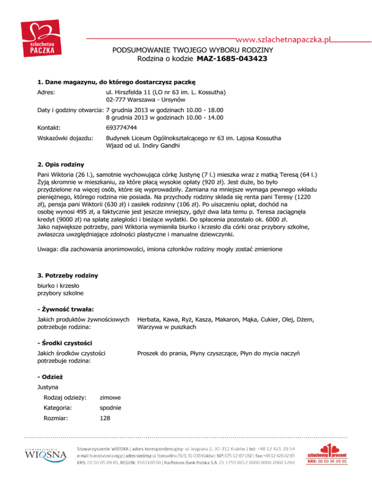 PODSUMOWANIE TWOJEGO WYBORU RODZINY Rodzina o kodzie MAZ-1685-043423 1. Dane magazynu, do którego dostarczysz paczkę Adres: ul. Hirszfelda 11 (LO nr 63 im. L. Kossutha) 02-777 Warszawa - Ursynów Daty i godziny otwarcia: 7 grudnia 2013 w godzinach 10.00 - 18.00 8 grudnia 2013 w godzinach 10.00 - 14.00 Kontakt: 693774744 Wskazówki dojazdu: Budynek Liceum Ogólnokształcącego nr 63 im. Lajosa Kossutha Wjazd od ul. Indiry Gandhi 2. Opis rodziny Pani Wiktoria (26 l.), samotnie wychowująca córkę Justynę (7 l.) mieszka wraz z matką Teresą (64 l.) Żyją skromnie w mieszkaniu, za które płacą wysokie opłaty (920 zł). Jest duże, bo było przydzielone na więcej osób, które się wyprowadziły. Zamiana na mniejsze wymaga pewnego wkładu pieniężnego, którego rodzina nie posiada. Na przychody rodziny składa się renta pani Teresy (1220 zł), pensja pani Wiktorii (630 zł) i zasiłek rodzinny (106 zł). Po uiszczeniu opłat, dochód na osobę wynosi 495 zł, a faktycznie jest jeszcze mniejszy, gdyż dwa lata temu p. Teresa zaciągnęła kredyt (9000 zł) na spłatę zaległości i bieżące wydatki. Do spłacenia pozostało ok. 6000 zł. Jako największe potrzeby, pani Wiktoria wymieniła biurko i krzesło dla córki oraz przybory szkolne, zwłaszcza uwzględniające zdolności plastyczne i manualne dziewczynki. Uwaga: dla zachowania anonimowości, imiona członków rodziny mogły zostać zmienione 3. Potrzeby rodziny biurko i krzesło przybory szkolne - Żywność trwała: Jakich produktów żywnościowych potrzebuje rodzina: Herbata, Kawa, Ryż, Kasza, Makaron, Mąka, Cukier, Olej, Dżem, Warzywa w puszkach - Środki czystości Jakich środków czystości potrzebuje rodzina: - Odzież Justyna Rodzaj odzieży: zimowe Kategoria: spodnie Rozmiar: 128 Proszek do prania, Płyny czyszczące, Płyn do mycia naczyń PODSUMOWANIE TWOJEGO WYBORU RODZINY Rodzina o kodzie MAZ-1685-043423 Sylwetka: normalna Uwagi: kolory pastelowe Justyna Rodzaj odzieży: zimowa Kategoria: kurtka Rozmiar: 128 Sylwetka: normalna Uwagi: Justyna Rodzaj odzieży: przejściowe Kategoria: bluzki Rozmiar: 128 Sylwetka: Uwagi: Teresa Rodzaj odzieży: zimowa Kategoria: kurtka Rozmiar: 160 rozmiar 50 Sylwetka: masywna Uwagi: kolory jasne, stonowane Teresa Rodzaj odzieży: przejściowe Kategoria: bluzka Rozmiar: Sylwetka: masywna Uwagi: nie pod szyję z powodu choroby tarczycy - Obuwie Teresa Rodzaj obuwia: zimowe Kategoria: kozaki Rozmiar: 39 Uwagi: PODSUMOWANIE TWOJEGO WYBORU RODZINY Rodzina o kodzie MAZ-1685-043423 Justyna Rodzaj obuwia: zimowe Kategoria: kozaki Rozmiar: 31/32 Uwagi: Justyna Rodzaj obuwia: Kategoria: kapcie Rozmiar: 31/32 Uwagi: - Pomoce szkolne Jakich pomocy szkolnych potrzebuje rodzina? Zeszyty, Bloki, Kredki, Farbki, Plastelina, Papier kolorowy, Nożyczki, Klej, Piórnik, Przybory do pisania Inne: Justynka ma zdolności plastyczne, manualne - Wyposażenie mieszkania Jakiego wyposażenia mieszkania potrzebuje rodzina: Kołdra, Poduszka, Pościel, Ręczniki Brakujące sprzęty: Biurko i krzesło dla Justynki, to przy którym odrabia lekcje czy rysuje, jest już bardzo zniszczone; kiwa się - Specjalne upominki Justynka marzy o lalce Monster High 4. Osoby opiekujące sie rodziną - Wolontariusz opiekun rodziny Imię i nazwisko: Małgorzata Romańska E-mail: [email protected] Telefon: 226413004, 503140721 Preferowana forma kontaktu: przede wszystkim mejl, potem telefon czas dowolny poza nocą. ja jestem ranny ptaszek - Lider rejonu Imię i nazwisko: Agnieszka Dudzińska PODSUMOWANIE TWOJEGO WYBORU RODZINY Rodzina o kodzie MAZ-1685-043423 5. Jak zapakować paczkę Paczki można dostarczyć wyłącznie do tego magazynu, z którego wybrana została rodzina. Pamiętaj, że po wybraniu przez Ciebie rodziny nikt inny nie będzie już dla niej przygotowywał paczki. Nie musisz zaspokoić wszystkich potrzeb rodziny, zwróć jednak uwagę, że wszystkie wymienione rzeczy są dla rodziny bardzo ważne. Rzeczy które podarujesz rodzinie powinny być dla niej prezentem. Nie muszą być one nowe, ale zawsze przygotowane z myślą o drugim człowieku. Przygotuj więc paczkę tak, by podniosła poczucie własnej wartości u obdarowanych przez Ciebie osób. Wskazówki do przygotowania Paczki: * paczki powinny być podzielone na kilka, poręcznych, niezbyt ciężkich pudeł, prosimy nie dostarczać do magazynu produktów zapakowanych w reklamówki czy worki foliowe * każde pudło powinno być opisane kodem rodziny oraz opatrzone numerem, pudła należy numerować według klucza: np. 1 z 5, 2 z 5 itd. * paczce powinny znaleźć się suche i trwałe artykuły spożywcze, prosimy, aby nie pakować do pudeł produktów, które łatwo ulegają uszkodzeniu, wylaniu, rozgnieceniu * aby prezent nabrał świątecznego charakteru można owinąć pudła kolorowym papierem Dziękując za Twoje zaangażowanie w SZLACHETNĄ PACZKĘ, zapraszamy do ponownego spotkania przy rozliczaniu formularza PIT. Przekaż swój 1% na Stowarzyszenie WIOSNA. Razem zmieniamy świat na lepsze! Dziękując za Twoje zaangażowanie w SZLACHETNĄ PACZKĘ, zapraszamy do ponownego spotkania przy rozliczaniu formularza PIT. Przekaż swój 1% na Stowarzyszenie WIOSNA. Razem zmieniamy świat na lepsze!