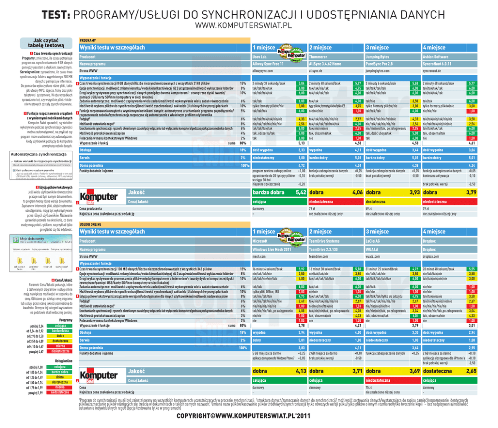 TEST: PROGRAMY/USŁUGI DO SYNCHRONIZACJI I UDOSTĘPNIANIA DANYCH WWW.KOMPUTERSWIAT.PL Jak czytać tabelę testową Czas trwania synchronizacji Programy: zmierzono, ile czasu potrzebuje program na zsynchronizowanie 8 GB danych pomiędzy pecetem a dyskiem zewnętrznym. Serwisy online: sprawdzono, ile czasu trwa synchronizacja folderu wypełnionego 200 MB danych z pamięcią w internecie. Do pomiarów wykorzystano różne pliki, takie jak utwory MP3, zdjęcia, filmy oraz pliki tekstowe i systemowe. W obu wypadkach sprawdzono też, czy wszystkie pliki z folderów testowych zostały zsynchronizowane. PROGRAMY 1 Funkcja rozpoznawania urządzeń z wymiennymi nośnikami danych Komputer Świat sprawdził, czy niektóre wykonywane podczas synchronizacji czynności można zautomatyzować, na przykład czy program może uruchamiać się automatycznie, kiedy użytkownik podłączy do komputera zewnętrzny nośnik danych. 2 Edycja plików tekstowych Jeśli wielu użytkowników równocześnie pracuje nad tym samym dokumentem, to program tworzy różne wersje dokumentu. Zapisane w internecie pliki, dzięki systemowi udostępniania, mogą być wykorzystywane przez różnych użytkowników. Nadawanie uprawnień pozwala na określenie, co dane osoby mogą robić z plikiem, na przykład tylko go oglądać czy też edytować. 1 2 Wyniki testu w szczegółach 1 miejsce 2 miejsce 3 miejsce 4 miejsce Producent Usov Lab. Thummerer Jumping Bytes Asbion Software Nazwa programu Allway Sync Free 11 AllSync 3.4.62 Home PureSync Pro 2.8 SyncroNaut 6.0.11 Strona WWW allwaysync.com allsync.de jumpingbytes.com syncronaut.de Wyposażenie i funkcje Czas trwania synchronizacji 8 GB danych/liczba niezsynchronizowanych z wszystkich 2148 plików Opcje synchronizacji: możliwość zmiany kierunku/w obu kierunkach/więcej niż 2 urządzenia/możliwość wykluczenia folderów Drogi wykorzystywane przy synchronizacji danych pomiędzy dwoma komputerami1: zewnętrzne dyski twarde/ pamięci USB/karty SD/inne komputery w sieci lokalnej Zadania automatyczne: możliwość zapisywania wielu zadań/możliwość wykonywania wielu zadań równocześnie Możliwość wyboru plików do synchronizacji/możliwość synchronizacji zakładek (Ulubionych) w przeglądarkach Funkcja rozpoznawania urządzeń z wymiennymi nośnikami danych: automatyczne uruchamianie programu po podłączeniu/ rozpoznawanie nośnika/synchronizacja rozpoczyna się automatycznie z właściwym profilem użytkownika Podgląd2 Możliwość ustawiania reguł3 Uruchamianie synchronizacji: ręczne/o określonym czasie/przy włączaniu lub wyłączaniu komputera/podczas podłączania nośnika danych Możliwość protokołowania/zapisu Polecenia w menu kontekstowym Windows Wyposażenie i funkcj suma 15% 8% 10% 2 minuty 34 sekundy/brak tak/tak/tak/tak tak/tak/tak/tak 5,84 6,00 6,00 2 minuty 48 sekund/brak tak/tak/nie/tak tak/tak/tak/tak 5,77 4,75 6,00 3 minuty 6 sekund/brak tak/tak/tak/tak tak/tak/tak/tak 5,68 6,00 6,00 2 minuty 48 sekund/brak tak/tak/tak/tak tak/tak/tak/tak 5,77 6,00 6,00 6% 10% 5% tak/tak tylko formaty plików/nie tak/tak/tak 6,00 3,00 6,00 tak/tak typy plików, formaty plików/tylko IE8 nie/nie/nie 6,00 3,75 1,00 tak/nie tylko formaty plików/nie tak/tak/tak 3,50 3,00 6,00 tak/tak tylko formaty plików/nie nie/nie/nie 6,00 3,00 1,00 6% 8% 6% 4% 2% 80% tak/tak/tak/tak/nie/nie nie/tak/tak/nie/nie/nie tak/tak/tak/tak tak, obszerna/tak tak 4,33 2,56 6,00 6,00 6,00 5,13 tak/tak/nie/nie/nie/nie tak/tak/tak/tak/tak/tak tak/nie/nie/nie tak, obszerna/tak nie 2,67 6,00 2,25 6,00 1,00 4,58 tak/tak/tak/nie/tak/nie nie/tak/tak/nie/nie/nie nie/nie/nie/tak, po zalogowaniu tak, dość uboga/tak tak 4,33 2,56 2,25 5,00 6,00 4,58 tak/tak/nie/tak/nie/nie nie/tak/tak/nie/nie/nie tak/tak/tak/tak tak, obszerna/tak nie 3,50 2,56 6,00 6,00 1,00 4,61 Obsługa 18% dość wygodna 3,33 wygodna 4,11 dość wygodna 3,44 dość wygodna 3,06 Serwis 2% niedostateczny 1,00 bardzo dobry 5,01 bardzo dobry 5,01 bardzo dobry 5,01 Ocena pośrednia Punkty dodatnie i ujemne 100% 4,72 program zawiera usługę online +1,00 ograniczenie do 20 tysięcy plików -0,10 w ciągu 30 dni niepełne spolszczenie -0,20 funkcja zabezpieczania danych brak polskiej wersji 4,51 +0,05 -0,50 funkcja zabezpieczania danych brak polskiej wersji 4,38 +0,05 -0,50 funkcja zabezpieczania danych konieczna aktywacja 4,34 +0,05 -0,10 brak polskiej wersji -0,50 3 poniżej 2,34 od 2,34 do 2,92 od 2,93 do 3,50 od 3,51 do 4,09 od 4,10 do 4,67 powyżej 4,67 Programy celująca bardzo dobra dobra dostateczna mierna niedostateczna Usługi online celująca bardzo dobra dobra dostateczna mierna niedostateczna poniżej 1,00 od 1,00 do 1,24 od 1,25 do 1,49 od 1,50 do 1,74 od 1,75 do 1,99 powyżej 1,99 5,42 dobra4,06 dobra 3,93 dobra celująca niedostateczna dostateczna niedostateczna darmowy - 79 zł nie znaleziono niższej ceny 59 zł nie znaleziono niższej ceny 79 zł nie znaleziono niższej ceny Wyniki testu w szczegółach 1 miejsce 2 miejsce 3 miejsce 4 miejsce Producent Microsoft TeamDrive Systems LaCie AG Dropbox Nazwa programu Windows Live Mesh 2011 TeamDrive 2.3.130 WUALA Dropbox Strona WWW mesh.com teamdrive.com wuala.com dropbox.com Cena/Jakość 4 Cena producenta Najniższa cena znaleziona przez redakcję 3,79 USŁUGI ONLINE 1 4 Cena/Jakość Parametr Cena/Jakość pokazuje, które z testowanych programów i usług online mają największe możliwości w stosunku do ceny. Obliczono go, dzieląc cenę programu lub usługi przez ocenę jakości podniesioną do kwadratu. Oceny w tej kategorii wystawiono na podstawie skali widocznej poniżej. bardzo dobra Jakość 3 Wyposażenie i funkcje Czas trwania synchronizacji 100 MB danych/liczba niezsynchronizowanych z wszystkich 342 plików Opcje synchronizacji: możliwość zmiany kierunku/w obu kierunkach/więcej niż 2 urządzenia/możliwość wykluczenia folderów Drogi wykorzystywane do przenoszenia plików między komputerem a internetem1: twardy dysk w komputerze/dyski zewnętrzne/pa