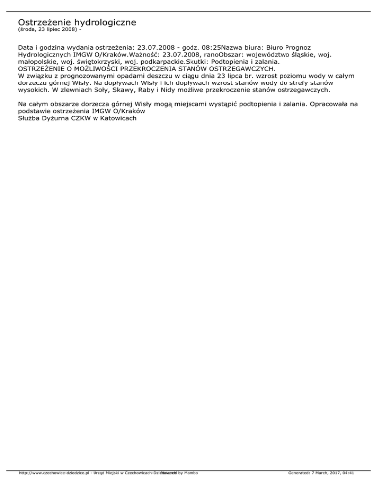 Ostrze enie hydrologiczne - Urząd Miejski w Czechowicach