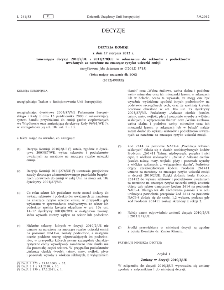 L 241/52 PL Dziennik Urzędowy Unii Europejskiej 7.9.2012 DECYZJE DECYZJA KOMISJI z dnia 17 sierpnia 2012 r. zmieniająca decyzje 2010/2/UE i 2011/278/UE w odniesieniu do sektorów i podsektorów uważanych za narażone na znaczące ryzyko ucieczki emisji (notyfikowana jako dokument nr C(2012) 5715) (Tekst mający znaczenie dla EOG) (2012/498/UE) tkanin” oraz „Wełna żużlowa, wełna skalna i podobne wełny mineralne oraz ich mieszanki luzem, w arkuszach lub w belach”, ocena ta wykazała, że mogą one być wyraźnie wydzielone spośród innych podsektorów na podstawie szczególnych cech, oraz że spełniają kryteria ilościowe określone w art. 10a ust. 15 dyrektywy 2003/87/WE. Podsektory „Arkusze cienkie (woale), taśmy, maty, wojłoki, płyty i pozostałe wyroby z włókien szklanych, z wyłączeniem tkanin” oraz „Wełna żużlowa, wełna skalna i podobne wełny mineralne oraz ich mieszanki luzem, w arkuszach lub w belach” należy zatem dodać do wykazu sektorów i podsektorów uważa nych za narażone na znaczące ryzyko ucieczki emisji. KOMISJA EUROPEJSKA, uwzględniając Traktat o funkcjonowaniu Unii Europejskiej, uwzględniając dyrektywę 2003/87/WE Parlamentu Europej skiego i Rady z dnia 13 października 2003 r. ustanawiającą system handlu przydziałami do emisji gazów cieplarnianych we Wspólnocie oraz zmieniającą dyrektywę Rady 96/61/WE (1), w szczególności jej art. 10a ust. 1 i 13, a także mając na uwadze, co następuje: (1) Decyzja Komisji 2010/2/UE (2) ustala, zgodnie z dyrek tywą 2003/87/WE, wykaz sektorów i podsektorów uważanych za narażone na znaczące ryzyko ucieczki emisji. (2) Decyzja Komisji 2011/278/UE (3) ustanawia przejściowe zasady dotyczące zharmonizowanego przydziału bezpłat nych uprawnień do emisji w całej Unii na mocy art. 10a dyrektywy 2003/87/WE. (3) Co roku sektor lub podsektor może zostać dodany do wykazu sektorów i podsektorów uważanych za narażone na znaczące ryzyko ucieczki emisji, w przypadku gdy wykazano w sprawozdaniu analitycznym, że sektor lub podsektor spełnia kryteria określone w art. 10a ust. 14–17 dyrektywy 2003/87/WE w następstwie zmiany, która wywarła istotny wpływ na sektor lub podsektor. (4) Niektóre sektory, których w decyzji 2010/2/UE nie uznano za narażone na znaczące ryzyko ucieczki emisji na poziomie NACE-4, zostały podzielone, a następnie ocenie poddano szereg odpowiadających im podsekto rów, w przypadku których pewne szczególnie charakte rystyczne cechy wywoływały zasadniczo inne skutki niż dla pozostałej części sektora. W przypadku podsektorów „Arkusze cienkie (woale), taśmy, maty, wojłoki, płyty i pozostałe wyroby z włókien szklanych, z wyłączeniem (1) Dz.U. L 275 z 25.10.2003, s. 32. (2) Dz.U. L 1 z 5.1.2010, s. 10. (3) Dz.U. L 130 z 17.5.2011, s. 1. (5) Kod 2614 na poziomie NACE-4 „Produkcja włókien szklanych” składa się z dwóch sześciocyfrowych kodów Prodcom: „261411 Taśmy, niedoprzędy, przędza i nici cięte, z włókien szklanych” i „261412 Arkusze cienkie (woale), taśmy, maty, wojłoki, płyty i pozostałe wyroby z włókien szklanych, z wyłączeniem tkanin”. Podsektor objęty sześciocyfrowym kodem Prodcom 261411 uznano za narażony na znaczące ryzyko ucieczki emisji w decyzji 2010/2/UE. Dzięki dodaniu kodu Prodcom 261412 do wykazu sektorów i podsektorów uważanych za narażone na znaczące ryzyko ucieczki emisji, zostanie objęty cały sektor oznaczony kodem 2614 na poziomie NACE-4. Dlatego też dla zachowania jasności i w celu uniknięcia powielania przepisów kod 2614 na poziomie NACE-4 dodaje się do części 1.2 wykazu, podczas gdy kod Prodcom 261411 zostaje skreślony z sekcji 2. (6) Należy zatem odpowiednio zmienić decyzje 2010/2/UE i 2011/278/UE. (7) Środki przewidziane w niniejszej decyzji są zgodne z opinią Komitetu ds. Zmian Klimatu, PRZYJMUJE NINIEJSZĄ DECYZJĘ: Artykuł 1 Zmiany w decyzji 2010/2/UE W załączniku do decyzji 2010/2/UE wprowadza się zmiany zgodnie z załącznikiem I do niniejszej decyzji. 7.9.2012 PL Dziennik Urzędowy Unii Europejskiej Artykuł 2 Zmiany w decyzji 2011/278/UE W załączniku I do decyzji 2011/278/UE wprowadza się zmiany zgodnie z załącznikiem II do niniejszej decyzji. Artykuł 3 Adresaci Niniejsza decyzja skierowana jest do państw członkowskich. Sporządzono w Brukseli dnia 17 sierpnia 2012 r. W imieniu Komisji Connie HEDEGAARD Członek Komisji ZAŁĄCZNIK I W załączniku do decyzji 2010/2/UE wprowadza się następujące zmiany: 1) w sekcji 1.2 po pozycji 2613 dodaje się wpis w brzmieniu: Kod NACE „2614 Opis Produkcja włókien szklanych” 2) w sekcji 2 wprowadza się następujące zmiany: a) skreśla się pozycję: Kod Prodcom „261411 Opis Taśmy, niedoprzędy, przędza i nici cięte, z włókien szklanych” b) po pozycji 26821400 dodaje się wpis w brzmieniu: Kod Prodcom Opis „26821610 Wełna żużlowa, wełna skalna i podobne wełny mineralne oraz ich mieszanki luzem, w arku szach lub w belach” L 241/53 L 241/54 PL Dziennik Urzędowy Unii Europejskiej 7.9.2012 ZAŁĄCZNIK II W załączniku I do decyzji 2011/278/UE wpis odpowiadający wskaźnikowi emisyjności dla produktu „wełna mineralna” otrzymuje brzmienie: Wskaźnik emisyjności dla produktów „Wełna mineralna Definicja objętych produktów Produkty izolacyjne z wełny mineralnej przeznaczone na izolację termiczną, akustyczną i przeciw pożarową wyprodu kowane przy zastoso waniu szkła, kamienia lub żużla Definicja objętych procesów i emisji (granice systemowe) Uwzględniono wszystkie procesy bezpośrednio lub pośrednio związane z etapami produkcji: topieniem, tworzeniem włókien i wstrzykiwaniem spoiwa, utwardzaniem i formowaniem. W celu określenia pośrednich emisji uwzględnia się całkowite zużycie energii elektrycznej w granicach systemowych. Narażenie na ucieczkę emisji określone w decyzji Komisji 2010/2/UE na lata 2013–2014 Wartość wskaźnika (uprawnienia/t)