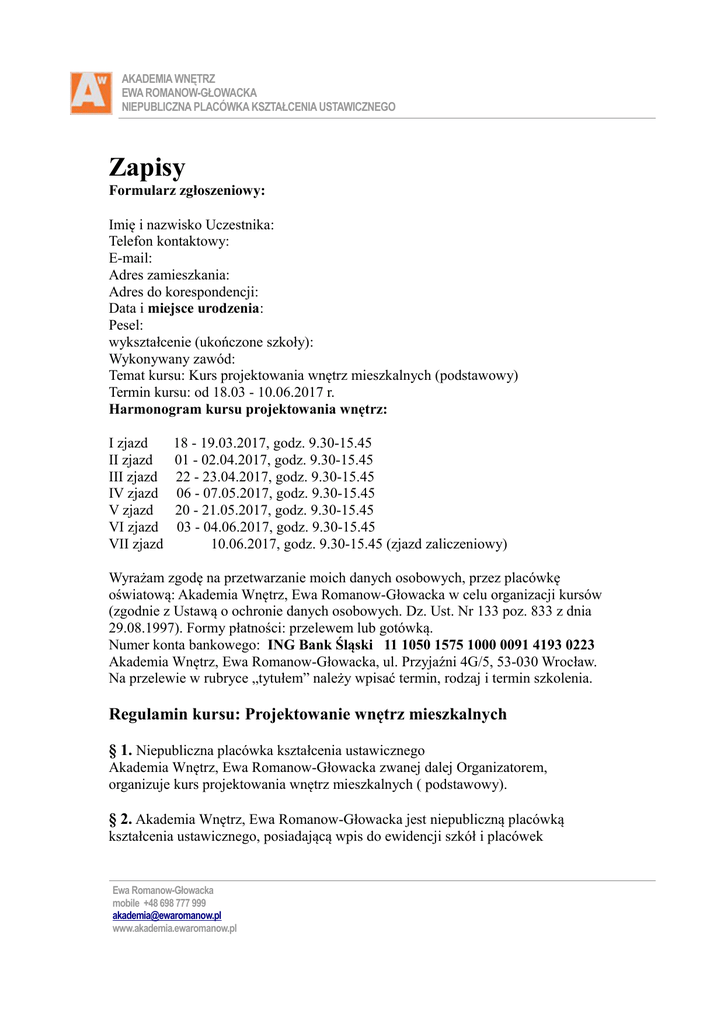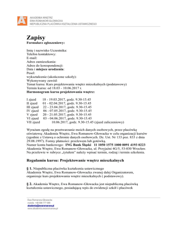 AKADEMIA WNĘTRZ EWA ROMANOW-GŁOWACKA NIEPUBLICZNA PLACÓWKA KSZTAŁCENIA USTAWICZNEGO Zapisy Formularz zgłoszeniowy: Imię i nazwisko Uczestnika: Telefon kontaktowy: E-mail: Adres zamieszkania: Adres do korespondencji: Data i miejsce urodzenia: Pesel: wykształcenie (ukończone szkoły): Wykonywany zawód: Temat kursu: Kurs projektowania wnętrz mieszkalnych (podstawowy) Termin kursu: od 18.03 - 10.06.2017 r. Harmonogram kursu projektowania wnętrz: I zjazd II zjazd III zjazd IV zjazd V zjazd VI zjazd VII zjazd 18 - 19.03.2017, godz. 9.30-15.45 01 - 02.04.2017, godz. 9.30-15.45 22 - 23.04.2017, godz. 9.30-15.45 06 - 07.05.2017, godz. 9.30-15.45 20 - 21.05.2017, godz. 9.30-15.45 03 - 04.06.2017, godz. 9.30-15.45 10.06.2017, godz. 9.30-15.45 (zjazd zaliczeniowy) Wyrażam zgodę na przetwarzanie moich danych osobowych, przez placówkę oświatową: Akademia Wnętrz, Ewa Romanow-Głowacka w celu organizacji kursów (zgodnie z Ustawą o ochronie danych osobowych. Dz. Ust. Nr 133 poz. 833 z dnia 29.08.1997). Formy płatności: przelewem lub gotówką. Numer konta bankowego: ING Bank Śląski 11 1050 1575 1000 0091 4193 0223 Akademia Wnętrz, Ewa Romanow-Głowacka, ul. Przyjaźni 4G/5, 53-030 Wrocław. Na przelewie w rubryce „tytułem” należy wpisać termin, rodzaj i termin szkolenia. Regulamin kursu: Projektowanie wnętrz mieszkalnych § 1. Niepubliczna placówka kształcenia ustawicznego Akademia Wnętrz, Ewa Romanow-Głowacka zwanej dalej Organizatorem, organizuje kurs projektowania wnętrz mieszkalnych ( podstawowy). § 2. Akademia Wnętrz, Ewa Romanow-Głowacka jest niepubliczną placówką kształcenia ustawicznego, posiadającą wpis do ewidencji szkół i placówek Ewa Romanow-Głowacka mobile +48 698 777 999 [email protected] www.akademia.ewaromanow.pl AKADEMIA WNĘTRZ EWA ROMANOW-GŁOWACKA NIEPUBLICZNA PLACÓWKA KSZTAŁCENIA USTAWICZNEGO niepublicznych nr 73/2014. Podlega nadzorowi i kontroli kuratorium Oświaty. § 3. Kurs projektowania wnętrz trwa 104 godz. lekcyjne, w formie zajęć obowiązkowych oraz dodatkowo prowadzone są warsztaty zawodowe (fakultatywne) przez partnerów wspierających placówkę. Zajęcia odbywają się w systemie zaocznym, co drugi tydzień,w sobotę i niedzielę w godzinach 9.30-15.45 w TEB Edukacja przy ulicy Wagonowej 12, Centrum Innowacji Prolearning przy ulicy Wagonowej 2 c/2 oraz w formie warsztatów w salonie Cermag, przy ulicy Strzegomskiej 38 - 40 we Wrocławiu. (siedziba szkoły, ul: Wagonowa 12, 53-609 Wrocław). Zajęcia fakultatywne odbywają w ciągu tygodnia w godzinach wieczornych. Uczestnictwo w warsztatach jest nieobowiązkowe, stanowi jedynie formę uzupełnienia zajęć weekendowych. § 4. Zapisy i płatności 1) zapisy na szkolenia dokonywane są w zakładce Zapisy. Warunkiem uczestnictwa w kursie jest wypełnienie i przesłanie formularza zgłoszeniowego na adres e-mail Organizatora, oraz dokonanie w terminie do 5 dni roboczych od wysłania zgłoszenia, wpłaty w wysokości 40 % wartości kursu, kolejne 60 % (nie mniej niż 7 dni) przed rozpoczęciem kursu na rachunek bankowy: ING Bank Śląski 11 1050 1575 1000 0091 4193 0223 Akademia Wnętrz, Ewa Romanow-Głowacka, ul. Przyjaźni 4G/5, kod: 53-030 Wrocław. Na przelewie w rubryce „tytułem” należy wpisać termin, rodzaj i termin kursu. Faktura zostanie wystawiona po wpłaceniu 100 % wartości kursu. (podstawa zwolnienia z VAT: art.113 ust.1 Ustawy o podatku od towarów i usług). 2) potwierdzenie przyjęcia zgłoszenia na podany adres e-mail zostanie przesłane w ciągu 24 godzin, natomiast samo wypełnienie formularza zgłoszeniowego, nie jest równoznaczne z przyjęciem na kurs, 3) aby uczestniczyć w zajęciach, Uczestnik zobowiązany zapoznać się z programem szkolenia, statutem oraz regulaminem placówki, 4) opłata za kurs wynosi …................(słownie...............................................................). Należność w wysokości 100 % kwoty za uczestnictwo w zajęciach, musi być uregulowana przed zajęciami w formie przelewu na konto Organizatora i jest gwarancją przyjęcia na kurs, 5) Organizator zobowiązuje się wysłać mailowo potwierdzenie przyjęcia na kurs po Ewa Romanow-Głowacka mobile +48 698 777 999 [email protected] www.akademia.ewaromanow.pl AKADEMIA WNĘTRZ EWA ROMANOW-GŁOWACKA NIEPUBLICZNA PLACÓWKA KSZTAŁCENIA USTAWICZNEGO otrzymaniu 100 % należności za uczestnictwo, 6) za niewykorzystane godziny w trakcie trwania kursu, nie zwracamy kosztów, 7) dokonanie opłaty za uczestnictwo w kursie jest jednoznaczne z akceptacją warunków regulaminu, 8) koszty związane z dojazdem, zakwaterowaniem oraz zakupem materiałów plastycznych ponosi Uczestnik, 9) Organizator zastrzega sobie prawo odwołania kursu w przypadku małej ilości osób. W takim przypadku zwróci Uczestnikowi całą wpłaconą sumę w terminie do 7 dni od zakładanej daty rozpoczęcia kursu, 10) wysłanie zgłoszenia na kurs jest równoznaczne z akceptacją powyższego regulaminu, 11) o przyjęciu słuchacza na kurs decyduje kolejność zgłoszeń. § 5. Rezygnacja z kursu 1) w przypadku rezygnacji z kursu, wpłata za kurs może być przeniesiona na kolejną edycję, pod warunkiem zgłoszenia rezygnacji w formie pisemnej (w terminie 7 dni przed rozpoczęciem kursu), 2) jeżeli Uczestnik zrezygnuje z udziału w kursie, nie później niż 14 dni roboczych przed terminem rozpoczęcia kursu, otrzyma zwrot opłaty w całości, 3) informacje o rezygnacji należy przesłać w formie pisemnej na adres Organizatora (liczy się dzień dostarczenia informacji o rezygnacji), 4) w przypadku rezygnacji z udziału w kursie na mniej niż 14 dni roboczych przed datą szkolenia i na miejsce rezygnującego nie zgłosi się nowy Uczestnik, Organizator ma prawo do naliczenia kary umownej w wysokości 50 % wniesionej opłaty, 5) w przypadku rezygnacji na trzy dni przed szkoleniem lub w dniu szkolenia Organizator naliczy karę umowną w wysokości 100% opłaty za szkolenie, 6) zwrot o
