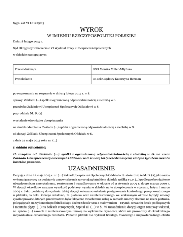 Sygn. akt VI U 1225/13 WYROK W IMIENIU RZECZYPOSPOLITEJ POLSKIEJ Dnia 18 lutego 2015 r. Sąd Okręgowy w Szczecinie VI Wydział Pracy i Ubezpieczeń Społecznych w składzie następującym: Przewodnicząca: SSO Monika Miller-Młyńska Protokolant: st. sekr. sądowy Katarzyna Herman po rozpoznaniu na rozprawie w dniu 4 lutego 2015 r. w S. sprawy Zakładu (...) spółki z ograniczoną odpowiedzialnością z siedzibą w S. przeciwko Zakładowi Ubezpieczeń Społecznych Oddziałowi w S. przy udziale M. D. (1) o ustalenie obowiązku ubezpieczenia na skutek odwołania Zakładu (...) spółki z ograniczoną odpowiedzialnością z siedzibą w S. od decyzji Zakładu Ubezpieczeń Społecznych Oddziału w S. z dnia 22 maja 2013 roku nr (...) I. oddala odwołanie; II. zasądza od Zakładu (...) spółki z ograniczoną odpowiedzialnością z siedzibą w S. na rzecz Zakładu Ubezpieczeń Społecznych Oddziału w S. kwotę 60 (sześćdziesięciu) złotych tytułem zwrotu kosztów procesu. UZASADNIENIE Decyzją z dnia 22 maja 2013 r. nr (...) Zakład Ubezpieczeń Społecznych Oddział w S. stwierdził, że M. D. (1) jako osoba wykonująca pracę na podstawie umowy zlecenia zawartej z płatnikiem składek spółką z o.o. (...) podlega obowiązkowo ubezpieczeniom emerytalnemu, rentowemu i wypadkowemu w okresie od 2 stycznia 2009 r. do 30 marca 2009 r. W decyzji określono zarazem wysokość podstawy wymiaru składek na te ubezpieczenia w styczniu, lutym i marcu 2009 r. Jako podstawę do wydania takiej decyzji wskazano ustalenia postępowania kontrolnego przeprowadzonego u płatnika, w toku którego ustalono, że płatnika oraz zainteresowanego we wskazanym okresie łączyły umowy cywilnoprawne, których przedmiotem było faktyczne świadczenie usług w ramach umowy zlecenia na rzecz płatnika, polegających na wykonaniu podbitek okapu dachu z desek wraz z malowaniem – 115 mb, zerwaniu desek podłogowych i montażu płyty (...) na belkach stropowych, Szpital ul. (...) w S.. W uzasadnieniu decyzji organ rentowy wskazał, że spółka (...) zawarła z zainteresowanym umowę na wykonanie czynności, które nie prowadziły do konkretnego indywidualnie oznaczonego rezultatu. Ponadto płatnik nie wykazał trwałego, twórczego i niepowtarzalnego efektu pracy wykonawcy, wobec czego umowa, której przedmiotem są wspomniane czynności, wyczerpuje znamiona umowy zlecenia. Z powyższą decyzją nie zgodził się Zakład (...) spółka z o.o. w S., odwołując się od niej i wnosząc o uchylenie decyzji oraz o zasądzenie od ZUS na swoją rzecz kosztów postępowania – w tym kosztów zastępstwa procesowego – według norm przepisanych. Odwołująca zarzuciła organowi rentowemu naruszenie art. 83 ust. 1 ustawy o systemie ubezpieczeń społecznych poprzez ustalenie przez organ administracji publicznej w toku postępowania administracyjnego istnienia pomiędzy ubezpieczonymi, a spółką (...) stosunku prawnego – umowy zlecenia, w sytuacji, gdy organ ten nie jest uprawniony do ustalenia charakteru umowy cywilnoprawnej; naruszenie art. 83 ust. 1 pkt 3 ustawy systemowej poprzez przedwczesne określenie podstawy wymiaru składek na ubezpieczenie społeczne. Ponadto wskazała na błąd w poczynionych przez organ rentowy ustaleniach faktycznych, poprzez uznanie, że umowy o dzieło zawarte pomiędzy skarżącą a zainteresowanymi stanowiły w istocie umowy o zlecenia, w sytuacji gdy całokształt okoliczności związanych ze stosunkiem prawnym nawiązanym pomiędzy stronami świadczy, że wolą stron tej umowy było zawarcie umowy o dzieło; naruszenie prawa materialnego tj. art. 6 ust. 1 pkt 4, art. 12 ust. 1 i art. 83 ust. 1 i 3 ustawy o systemie ubezpieczeń społecznych poprzez ich niewłaściwe zastosowanie tj. wydanie decyzji stwierdzającej, że zainteresowani podlegają obowiązkowym ubezpieczeniom emerytalnemu, rentowym i wypadkowemu z tytułu w/w umów oraz ustalającej podstawę wymiaru składek na te ubezpieczenia w oparciu o przychód przez nich uzyskiwany w sytuacji, gdy osoby te będąc zatrudnione u skarżącej na podstawie umowy o dzieło nie podlegały obowiązkowym ubezpieczeniom społecznym. Wskazując na specyfikę prowadzonej przez siebie działalności gospodarczej w zakresie świadczenia usług budowlanych skarżąca podniosła, iż nie może w ramach zawartej umowy o roboty budowlane zlecić wykonania poszczególnych elementów budowy osobom trzecim na zasadzie umowy starannego działania (umowy zlecenia, świadczenia usług), bowiem ten rodzaj umowy nie prowadzi do osiągnięcia zamierzonego w umowie z inwestorem celu i tym samym naraża spółkę na niewykonanie zobowiązania wynikającego z umowy. Skarżąca wskazała, iż wszystkie prace dotyczące poszczególnych elementów stanowiących części procesu budowlanego jakie zlecała musiały być zgodne z dokumentacją projektową, przepisami prawa budowlanego, w związku z czym nie mogły być wykonane jedynie z należytą starannością. Zdaniem skarżącej jedyną umową, która gwarantowała, aby wykonywane elementy obiektu budowlanego spełniały warunki określone dokumentacją projektową oraz przepisami prawa budowlanego była umowa o dzieło. Odwołująca wskazała, iż wszystkie elementy składowe obiektu budowlanego mają z góry określone parametry i właściwości wynikające z przepisów prawa budowlanego oraz dokumentacji projektowej, a ich osiągniecie przez strony jest pewne, z tego względu że jest określone w projekcie i objęte pozwoleniem na budowę. Wykonane w ramach robót budowlanych elementy obiektu budowlanego mają charakter samoistny, materialnie wyodrębniony, każdy z tych elementów może podlegać odbiorowi, a w przypadku stwierdzenia wad zlecający może żądać ich usunięcia, ewentualnie obniżyć należne z tego tytułu wynagrodzenie w oparciu o wartość stwierdzonych usterek. Jak wskazała skarżąca fakt czy dany rezultat został osiągnięty jest prosty do ustalenia. Wystarczy w toku odbioru s