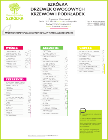 Wawrzonek Boguslaw SZKÓ£KA DRZEWEK OWOCOWYCH KRZEWÓW I PODK£ADEK Bogus³aw Wawrzonek Zasów 156 B, 39-209 Zasów, woj.podkarpackie [email protected] www.drzewka.zasow.com tel.stac. +48 14 681 35 62 tel.kom. +48 606 172 052 tel.kom. +48 725 497 150 Oferujemy nastêpuj¹cy kwalifikowany materia³ szkó³karski: WIŒNIE: JAB£ONIE: GRUSZE: GRONIASTA z Ujf. FREEDOM BONKRETA WILLIAMSA DEBRECENI z Bot. KELLERIS 16 OLIWKA ¯Ó£TA EARLY GENEVA FAWORYTKA GENERAL LECLERC £UTÓWKA KATIA KOMISÓWKA NORTHSTAR PANDY 103 ANTONÓWKA ZW. JAMES GRIEVE GRAFSZTYNEK KONFERENCJA LUKASÓWKA RED B-TA WILIAMSA DELIKATES RED FAWORYTKA LOBO KOSZTELA LIPCÓWKA i inne... NEFRIS i inne... Z£OTA RENETA CZEREŒNIE: BUTNERA CZERWONA HEDELFIÑSKA KORDIA LAPINS RIVAN SAM SCHNEIDERA PÓNA SUMMIT VAN VEGA BURLAT REGINA KARINA SYLVIA i inne... SZARA RENETA MALINOWA OBERL. SZAMPION KOKSA POM. CORTLAND WICKI MELROSE GALA IDARED RED BOSKOP GLOSTER ALWA BOYKEN FLORINA CZERW. JONAGOLD KRONSELKA i inne... rodukujê materia³ najwy¿szej jakoœci: s¹ nimi g³ównie drzewka i krzewy owocowe oraz podk³adki. S³u¿ê równie¿ fachowym i rzetelnym doradztwem, odnoœnie mojego materia³u. Jest mo¿liwoœæ okulizacji oraz szczepieñ zimowych wg. indywidualnych zamówieñ. Wiêcej informacji na naszej stronie: www.drzewka.zasow.com NEKTARYNY: ŒLIWY: MORELE: KOMETA (jap.) HARCOT HERMAN RUTH GERSTETER ERLY ORANGE GOLDRICZ CACANSKA RANA WCZESNA Z MORDEN RENKLODA ULENA KRÓLOWA WIKTORIA CACANSKA LEPOTICA SOMO HARGRAND HARLLAI i inne... HARCO i inne... KRZEWY OWOCOWE: WÊGIERKA WCZESNA PIENNE PORZECZKA (czerwona, czarna i bia³a w odmianach) WÊGIERKA D¥BROWICKA RENKLODA ALTHANA STANLEY AGREST (czerwony i bia³y w odmianach) BRZOSKWINIE: AMERS VALJEVKA VISION WÊGIERKA ZWYK£A PREZYDENT DIANA HARNAŒ INKA KRZEWY OWOCOWE: KRZACZASTE REDHAVEN PORZECZKA (czerwona, czarna i bia³a w odmianach) ROYALVEE SATURN (p³aska) HARBINGER RELIANCE i inne... EMPRESS ONEIDA OPAL BLUE FREE JEROZOLIMKA NAJBOLIA i inne... AGREST (czerwony i bia³y w odmianach) MALINY w odmianach M9, P60, M26,P14, M7, A2, M106, Colt, Pigwa S1 A³ycza, Ptasia, Antypka, Kaukaska, Rakoniewiecka, Mand¿urska Zdziarzec Bogus³aw Wawrzonek D¹brówka Wis³ocka Zasów 156 B, 39-209 Zasów, woj.podkarpackie D¹bie [email protected] www.drzewka.zasow.com tel.stac. +48 14 681 35 62 tel.kom. +48 606 172 052 tel.kom. +48 725 497 150 Mokre Szkó³ka drzewek owocowych, krzewów oraz podk³adek w Zasowie - Wawrzonek Bogus³aw Stara Jastrz¹bka Bobrowa Ró¿a Wiewiórka Wola ¯yrakowska Góra Motyczna Przy wiêkszych zakupach - rabat oraz dowóz na miejsce! Mo¿liwoœæ negocjacji cen. ¯yczymy udanych zakupów!