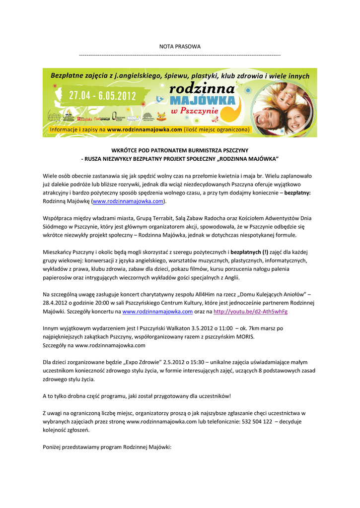 NOTA PRASOWA ------------------------------------------------------------------------------------------------------------- WKRÓTCE POD PATRONATEM BURMISTRZA PSZCZYNY - RUSZA NIEZWYKŁY BEZPŁATNY PROJEKT SPOŁECZNY „RODZINNA MAJÓWKA” Wiele osób obecnie zastanawia się jak spędzić wolny czas na przełomie kwietnia i maja br. Wielu zaplanowało już dalekie podróże lub bliższe rozrywki, jednak dla wciąż niezdecydowanych Pszczyna oferuje wyjątkowo atrakcyjny i bardzo pożyteczny sposób spędzenia wolnego czasu, a przy tym dodajmy koniecznie – bezpłatny: Rodzinną Majówkę (www.rodzinnamajowka.com). Współpraca między władzami miasta, Grupą Terrabit, Salą Zabaw Radocha oraz Kościołem Adwentystów Dnia Siódmego w Pszczynie, który jest głównym organizatorem akcji, spowodowała, że w Pszczynie odbędzie się wkrótce niezwykły projekt społeczny – Rodzinna Majówka, jednak w dotychczas niespotykanej formule. Mieszkańcy Pszczyny i okolic będą mogli skorzystać z szeregu pożytecznych i bezpłatnych (!) zajęć dla każdej grupy wiekowej: konwersacji z języka angielskiego, warsztatów muzycznych, plastycznych, informatycznych, wykładów z prawa, klubu zdrowia, zabaw dla dzieci, pokazu filmów, kursu porzucenia nałogu palenia papierosów oraz intrygujących wieczornych wykładów gości specjalnych z Anglii. Na szczególną uwagę zasługuje koncert charytatywny zespołu All4Him na rzecz „Domu Kulejących Aniołów” – 28.4.2012 o godzinie 20:00 w sali Pszczyńskiego Centrum Kultury, które jest jednocześnie partnerem Rodzinnej Majówki. Szczegóły koncertu na www.rodzinnamajowka.com oraz na http://youtu.be/d2-Ath5whFg Innym wyjątkowym wydarzeniem jest I Pszczyński Walkaton 3.5.2012 o 11:00 – ok. 7km marsz po najpiękniejszych zakątkach Pszczyny, współorganizowany razem z pszczyńskim MORIS. Szczegóły na www.rodzinnamajowka.com Dla dzieci zorganizowane będzie „Expo Zdrowie” 2.5.2012 o 15:30 – unikalne zajęcia uświadamiające małym uczestnikom konieczność zdrowego stylu życia, w formie interesujących zajęć, uczących 8 podstawowych zasad zdrowego stylu życia. A to tylko drobna część programu, jaki został przygotowany dla uczestników! Z uwagi na ograniczoną liczbę miejsc, organizatorzy proszą o jak najszybsze zgłaszanie chęci uczestnictwa w wybranych zajęciach przez stronę www.rodzinnamajowka.com lub telefonicznie: 532 504 122 – decyduje kolejność zgłoszeń. Poniżej przedstawiamy program Rodzinnej Majówki: DATA Pt, 27 kwietnia 2012 Sb, 28 kwietnia 2012 Nd, 29 kwietnia 2012 Pn, 30 kwietnia 2012 Wt, 1 maja 2012 Śr, 2 maja 2012 Cz, 3 maja 2012 11:00-14:00 15:30-17:00 18:00-19:30 20:00-21:30 Otwarcie Majówki Wykład gości z Anglii: „Istoty pozaziemskie” Wykład gości z Anglii: Koncert "Co by było, gdybyś charytatywny znał przyszłość?" All4Him Angielski z native speakerem Warsztaty muzyczne (chór) Warsztaty plastyczne: aplikacje na koszulkach Klub dzieci: pokazy straży pożarnej Wykład gości z Anglii: "Daremny opór" 16:00-17:00 Klub zdrowia: w ciągu 5 dni rzucisz palenie pomoc dla palaczy Angielski z native speakerem Warsztaty muzyczne (chór) Wykład: prawo rodzinne Klub dzieci: gry i zabawy 12:00-15:00 Klub zdrowia: masaże 15:00-16:00 Klub zdrowia: szkoła zdrowego gotowania 16:00-17:00 Klub zdrowia: w ciągu 5 dni rzucisz palenie pomoc dla palaczy Warsztaty plastyczne: decoupage na mydle Warsztaty komputerowe: budowa stron www Wykład: prawa i obowiązki pracownika Wieczór filmowy Wykład gości z Anglii: "Zjawiska paranormalne" 12:00-15:00 Wykład gości z Anglii: Klub zdrowia: masaże "Uczynić niemożliwe 15:00-16:00 możliwym" Klub zdrowia: szkoła zdrowego gotowania 16:00-17:00 Klub zdrowia: w ciągu 5 dni rzucisz palenie pomoc dla palaczy Angielski z native speakerem Warsztaty muzyczne (chór) Warsztaty plastyczne: stylizacja Klub dzieci: Expo Zdrowie dla dzieci 12:00-15:00 Wykład gości z Anglii: Klub zdrowia: masaże "Kontrola umysłu” 15:00-16:00 Klub zdrowia: szkoła zdrowego gotowania 16:00-17:00 Klub zdrowia: w ciągu 5 dni rzucisz palenie pomoc dla palaczy I Pszczyński Angielski z native speakerem Walkaton Warsztaty plastyczne: malowanie na płótnie Wykład gości z Anglii: Warsztaty komputerowe: MS Office "Wpływ otoczenia" Klub dzieci -wyjście do 12:00-15:00 Wieczór filmowy Radochy Pt, 4 maja 2012 Sb, 5 maja 2012 Nd, 6 maja 2012 Klub zdrowia: masaże 15:00-16:00 Klub zdrowia: szkoła zdrowego gotowania 16:00-17:00 Klub zdrowia: w ciągu 5 dni rzucisz palenie pomoc dla palaczy Angielski z native speakerem Wykład gości z Anglii: Warsztaty muzyczne (chór) "Pochowany żywcem" Wykład gości z Anglii: "Czy to jest tak dobre, jak się wydaje?" Wykład gości z Anglii i zakończenie Zapraszamy! ---------------------------------------------------------------------------------------------------------------------------------Bardzo prosimy o opublikowanie powyższej informacji oraz, w miarę możliwości, o ich częste odświeżanie, aby jak najwięcej osób mogło skorzystać z tych zajęć. Bylibyśmy bardzo wdzięczni również za bezpłatną możliwość publikacji przez Państwa powyższego banneru reklamującego Rodzinną Majówkę. Więcej informacji (kontakt wyłącznie dla potrzeb redakcji): Tomasz Jesionek, Koordynator Projektu Rodzinna Majówka, mail: [email protected] , Tel. 692 025 009 (po 16:00).