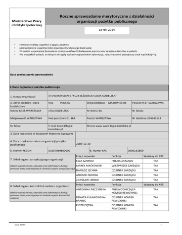 ZŽĐnjŶĞƐƉƌĂǁŽnjĚĂŶŝĞŵĞƌLJƚŽƌLJĐnjŶĞnjĚnjŝĂųĂůŶŽƑĐŝ ŽƌŐĂŶŝnjĂĐũŝƉŽǏLJƚŬƵƉƵďůŝĐnjŶĞŐŽ Ministerstwo Pracy ŝWŽůŝƚLJŬŝ^ƉŽųĞĐnjŶĞũ za rok 2014 • • • • &ŽƌŵƵůĂƌnjŶĂůĞǏLJǁLJƉĞųŶŝđǁũħnjLJŬƵƉŽůƐŬŝŵ͖ ^ƉƌĂǁŽnjĚĂǁĐĂǁLJƉĞųŶŝĂƚLJůŬŽƉƌnjĞnjŶĂĐnjŽŶĞĚůĂŶŝĞŐŽďŝĂųĞƉŽůĂ͖ tƚƌĂŬĐŝĞǁLJƉĞųŶŝĂŶŝĂĨŽƌŵƵůĂƌnjĂŝƐƚŶŝĞũĞŵŽǏůŝǁŽƑđĚŽĚĂǁĂŶŝĂǁŝĞƌƐnjLJŽƌĂnjnjĂǁŝũĂŶŝĂƚĞŬƐƚſǁǁƉŽůĂĐŚ͖ tĞǁƐnjLJƐƚŬŝĐŚƉŽůĂĐŚ͕ǁŬƚſƌLJĐŚŶŝĞďħĚČǁƉŝƐĂŶĞŽĚƉŽǁŝĞĚŶŝĞŝŶĨŽƌŵĂĐũĞ͕ŶĂůĞǏLJǁƐƚĂǁŝđƉŽũĞĚLJŶĐnjLJnjŶĂŬŵLJƑůŶŝŬĂ (--–). Data zamieszczenia sprawozdania /͘ĂŶĞŽƌŐĂŶŝnjĂĐũŝƉŽǏLJƚŬƵƉƵďůŝĐnjŶĞŐŽ 1. Nazwa organizacji ^dKtZz^E/Η<>h:/</>'/<K/>^<Η 2. Adres siedziby i dane kontaktowe Kraj Gmina M.ST.WARSZAWA Ulica KOZIELSKA Nr domu 4A Nr lokalu DŝĞũƐĐŽǁŽƑđtZ^t Kod pocztowy 01-163 Poczta WARSZAWA Nr telefonu 224240133 Nr faksu E-mail [email protected] Strona www www.legia-kozielska.pl POLSKA Województwo MAZOWIECKIE Powiat M.ST.WARSZAWA ϯ͘ĂƚĂƌĞũĞƐƚƌĂĐũŝǁ<ƌĂũŽǁLJŵZĞũĞƐƚƌnjĞ^ČĚŽǁLJŵ ϰ͘ĂƚĂƵnjLJƐŬĂŶŝĂƐƚĂƚƵƐƵŽƌŐĂŶŝnjĂĐũŝƉŽǏLJƚŬƵ publicznego 5. Numer REGON 01637059800000 ϳ͘^ŬųĂĚŽƌŐĂŶƵnjĂƌnjČĚnjĂũČĐĞŐŽŽƌŐĂŶŝnjĂĐũŝ ;EĂůĞǏLJǁƉŝƐĂđŝŵŝŽŶĂ͕ŶĂnjǁŝƐŬĂŽƌĂnjŝŶĨŽƌŵĂĐũĞŽĨƵŶŬĐũŝ ƉĞųŶŝŽŶĞũƉƌnjĞnjƉŽƐnjĐnjĞŐſůŶLJĐŚĐnjųŽŶŬſǁŽƌŐĂŶƵnjĂƌnjČĚnjĂũČĐĞŐŽͿ ϴ͘^ŬųĂĚŽƌŐĂŶƵŬŽŶƚƌŽůŝůƵďŶĂĚnjŽƌƵŽƌŐĂŶŝnjĂĐũŝ ;EĂůĞǏLJǁƉŝƐĂđŝŵŝŽŶĂ͕ŶĂnjǁŝƐŬĂŽƌĂnjŝŶĨŽƌŵĂĐũĞŽĨƵŶŬĐũŝ ƉĞųŶŝŽŶĞũƉƌnjĞnjƉŽƐnjĐnjĞŐſůŶLJĐŚĐnjųŽŶŬſǁŽƌŐĂŶƵŬŽŶƚƌŽůŝůƵď nadzoru) Druk: MPiPS 2004-12-30 6. Numer KRS 0000152850 /ŵŝħŝŶĂnjǁŝƐŬŽ Funkcja Wpisany do KRS EWA SZARSKA WZ^Zh TAK DZ<D<Kt^</ t/WZ^Zh TAK DARIUSZ JECHNA BKE<Zh TAK ANDRZEJ NOWAK BKE<Zh TAK /^BthZE BKE<Zh TAK /ŵŝħŝŶĂnjǁŝƐŬŽ Funkcja EdKE/EW/zF^< WZtKE/ KOMISJI REWIZYJNEJ TAK ZEd<hB<Kt^<Ͳ BRABEC BKE<<KD/^:/ REWIZYJNEJ TAK W/KdZ/%d< BKE<<KD/^:/ REWIZYJNEJ TAK Wpisany do KRS 1 9. Cele statutowe organizacji ;EĂůĞǏLJŽƉŝƐĂđĐĞůĞŶĂƉŽĚƐƚĂǁŝĞƐƚĂƚƵƚƵŽƌŐĂŶŝnjĂĐũŝͿ 1ͿKƌŐĂŶŝnjŽǁĂŶŝĞŝƉƌŽǁĂĚnjĞŶŝĞĚnjŝĂųĂůŶŽƑĐŝƐƉŽƌƚŽǁĞũǁĚnjŝĞĚnjŝŶŝĞ ŬƵůƚƵƌLJĨŝnjLJĐnjŶĞũŝƌĞŬƌĞĂĐũŝǁƐƉŽƌƚĂĐŚũĞǍĚnjŝĞĐŬŝĐŚ͕njǁųĂƐnjĐnjĂǁ dyscyplinie skoków przez przeszkody. 2) Wyszkolenie zawodników. 3ͿZŽnjďƵĚŽǁĂŝƵƚƌnjLJŵĂŶŝĞŶĂǁųĂƑĐŝǁLJŵƉŽnjŝŽŵŝĞŝŶĨƌĂƐƚƌƵŬƚƵƌLJŝďĂnjLJ ƚĞĐŚŶŝĐnjŶĞũŽƌĂnjƐƚĂųĞƉŽƉƌĂǁŝĂŶŝĞŝĐŚƉŽnjŝŽŵƵ͘ 4ͿWŽĚĞũŵŽǁĂŶŝĞǁƐnjĞůŬŝĐŚĚnjŝĂųĂŷŶĂƌnjĞĐnjnjĂŽƉĂƚƌnjĞŶŝĂnjĂǁŽĚŶŝŬſǁǁ ŽĚƉŽǁŝĞĚŶŝƐƉƌnjħƚŝŬŽŶŝĞ͘ 5ͿKƌŐĂŶŝnjŽǁĂŶŝĞŝƵĚnjŝĂųǁũĞǍĚnjŝĞĐŬŝĐŚnjĂǁŽĚĂĐŚŬƌĂũŽǁLJĐŚŝ ŵŝħĚnjLJŶĂƌŽĚŽǁLJĐŚ͘ 6ͿWƌŽƉĂŐŽǁĂŶŝĞƌŽnjǁŽũƵƐƉŽƌƚſǁũĞǍĚnjŝĞĐŬŝĐŚ͘ 7) Tworzenie dogodnych warunków dla krzewienia kultury fizycznej i ƐƉŽƌƚƵũĞǍĚnjŝĞĐŬŝĞŐŽǁƑƌſĚĚnjŝĞĐŝ͕ŵųŽĚnjŝĞǏLJ͕ŽƐſďŶŝĞƉĞųŶŽƐƉƌĂǁŶLJĐŚ oraz innych osób. 8Ϳ<ŽŶƚLJŶƵŽǁĂŶŝĞƚƌĂĚLJĐũŝƉŽůƐŬŝĞŐŽũĞǍĚnjŝĞĐƚǁĂƐƉŽƌƚŽǁĞŐŽ͕njǁųĂƐnjĐnjĂ wojskowego. 9ͿKĐŚƌŽŶĂŝŵĞĐĞŶĂƚŶĂĚnjǁŝČnjĂŶLJŵŝnjũĞǍĚnjŝĞĐƚǁĞŵƚƌĂĚLJĐũĂŵŝ͕ ƉĂŵŝČƚŬĂŵŝ͕njĂďLJƚŬĂŵŝŝnjĂǁŽĚĂŵŝ͘ 1͘KƌŐĂŶŝnjŽǁĂŶŝĞŝƉƌŽǁĂĚnjĞŶŝĞƐnjŬŽůĞŶŝĂǁƐƉŽƌƚĂĐŚũĞǍĚnjŝĞĐŬŝĐŚ͕ 2͘KƌŐĂŶŝnjŽǁĂŶŝĞŝƵĚnjŝĂųǁŬƌĂũŽǁLJĐŚŝŵŝħĚnjLJŶĂƌŽĚŽǁLJĐŚnjĂǁŽĚĂĐŚ ũĞǍĚnjŝĞĐŬŝĐŚŽƌĂnjŝŵƉƌĞnjĂĐŚƚŽǁĂƌnjLJƐnjČĐLJĐŚ͘ 10. Sposób realizacji celów statutowych organizacji 3. Organizowanie imprez o charakterze sportowo–rekreacyjnym. 4͘tƐƉſųƉƌĂĐħnjŽƌŐĂŶĂŵŝĂĚŵŝŶŝƐƚƌĂĐũŝƌnjČĚŽǁĞũŝƐĂŵŽƌnjČĚŽǁĞũ͕ ;EĂůĞǏLJŽƉŝƐĂđƐƉŽƐſďƌĞĂůŝnjĂĐũŝĐĞůſǁƐƚĂƚƵƚŽǁLJĐŚŽƌŐĂŶŝnjĂĐũŝŶĂ ŬƌĂũŽǁLJŵŝŝŵŝħĚnjLJŶĂƌŽĚŽǁLJŵŝŽƌŐĂŶŝnjĂĐũĂŵŝƐƉŽƌƚŽǁLJŵŝ͕ŽƌŐĂŶŝnjĂĐũĂŵŝ ƐƉŽųĞĐnjŶLJŵŝ͕ŐŽƐƉŽĚĂƌĐnjLJŵŝ͕ƉůĂĐſǁŬĂŵŝŬƵůƚƵƌĂůŶŽͲŽƑǁŝĂƚŽǁLJŵŝŽƌĂnj podstawie statutu organizacji) ƑƌŽĚŬĂŵŝŵĂƐŽǁĞŐŽƉƌnjĞŬĂnjƵ͘ 5͘ŬƚLJǁŝnjŽǁĂŶŝĞŐƌƵƉƐƉŽųĞĐnjĞŷƐƚǁĂǁŽŬſųŝĚĞŝĚĂůƐnjĞŐŽĨƵŶŬĐũŽŶŽǁĂŶŝĂ ŝƌŽnjǁŽũƵ<ůƵďƵ:ĞǍĚnjŝĞĐŬŝĞŐŽ>ĞŐŝĂ<ŽnjŝĞůƐŬĂ͕ƉƌnjĞnjƉŽnjLJƐŬŝǁĂŶŝĞƑƌŽĚŬſǁ finansowych i rzeczowych. 6. Organizowanie pokazów, konkursów i obchodów rocznic historycznych njǁŝČnjĂŶLJĐŚnjƉŽůƐŬŝŵũĞǍĚnjŝĞĐƚǁĞŵ͘ 7͘WƌŽǁĂĚnjĞŶŝĞĚnjŝĂųĂůŶŽƑĐŝŐŽƐƉŽĚĂƌĐnjĞũƐųƵǏČĐĞũƌĞĂůŝnjĂĐũŝĐĞůſǁ statutowych. //͘ŚĂƌĂŬƚĞƌLJƐƚLJŬĂĚnjŝĂųĂůŶŽƑĐŝŽƌŐĂŶŝnjĂĐũŝƉŽǏLJƚŬƵƉƵďůŝĐnjŶĞŐŽǁŽŬƌĞƐŝĞƐƉƌĂǁŽnjĚĂǁĐnjLJŵ ϭ͘KƉŝƐĚnjŝĂųĂůŶŽƑĐŝƉŽǏLJƚŬƵƉƵďůŝĐnjŶĞŐŽ ϭ͘ϭ͘KƉŝƐŐųſǁŶLJĐŚ ĚnjŝĂųĂŷƉŽĚũħƚLJĐŚ ƉƌnjĞnjŽƌŐĂŶŝnjĂĐũħ Druk: MPiPS ͲKƌŐĂŶŝnjĂĐũĂƐnjŬſųĞŬũĞǍĚnjŝĞĐŬŝĐŚĚůĂĚnjŝĞĐŝŝŵųŽĚnjŝĞǏLJƉƌŽǁĂĚnjŽŶLJĐŚǁƚƌĂŬĐŝĞƌŽŬƵƐnjŬŽůŶĞŐ