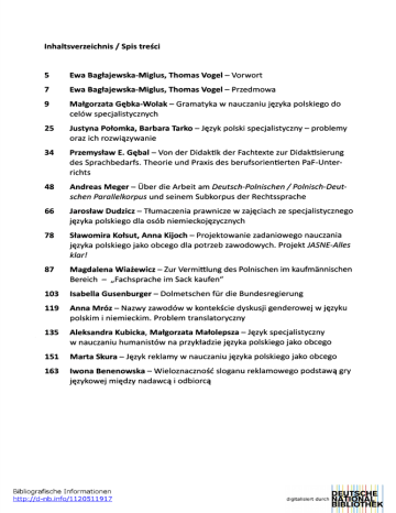 Inhaltsverzeichnis / Spis treści 5 Ewa Bagłajewska-Miglus, Thomas Vogel - Vorwort 7 Ewa Bagłajewska-Miglus, Thomas Vogel - Przedmowa 9 Małgorzata Gębka-Wolak - Gramatyka w nauczaniu języka polskiego do celów specjalistycznych 25 Justyna Połomka, Barbara Tarko - Język polski specjalistyczny - problemy oraz ich rozwiązywanie 34 Przemysław E. Gębal - Von der Didaktik der Fachtexte zur Didaktisierung des Sprachbedarfs. Theorie und Praxis des berufsorientierten PaF-Unterrichts 48 Andreas Meger - Über die Arbeit am Deutsch-Polnischen / Polnisch-Deut schen Parallelkorpus und seinem Subkorpus der Rechtssprache 66 Jarosław Dudzicz - Tłumaczenia prawnicze w zajęciach ze specjalistycznego języka polskiego dla osób niemieckojęzycznych 78 Sławomira Kołsut, Anna Kijoch - Projektowanie zadaniowego nauczania języka polskiego jako obcego dla potrzeb zawodowych. Projekt JASNE-Alles klar! 87 Magdalena Wiażewicz - Zur Vermittlung des Polnischen im kaufmännischen Bereich - „Fachsprache im Sack kaufen" 103 Isabella Gusenburger - Dolmetschen für die Bundesregierung 119 Anna Mróz - Nazwy zawodów w kontekście dyskusji genderowej w języku polskim i niemieckim. Problem translatoryczny 135 Aleksandra Kubicka, Małgorzata Małolepsza - Język specjalistyczny w nauczaniu humanistów na przykładzie języka polskiego jako obcego 151 Marta Skura - Język reklamy w nauczaniu języka polskiego jako obcego 163 Iwona Benenowska - Wieloznaczność sloganu reklamowego podstawą gry językowej między nadawcą i odbiorcą 175 Beata Morzyńska-Wrzosek - Obraz tożsamości płciowej kobiet w reklamie telewizyjnej. Wybrane zagadnienia w kontekście kształcenia kompetencji międzykulturowej 192 Joanna Kuć - Memy jako „kom pendium " wiedzy o języku i kulturze polskiej