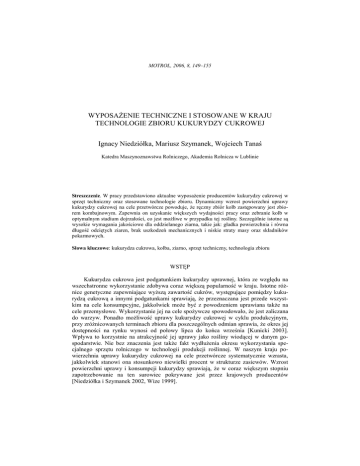 MOTROL, 2006, 8, 149–155 WYPOSAśENIE TECHNICZNE I STOSOWANE W KRAJU TECHNOLOGIE ZBIORU KUKURYDZY CUKROWEJ Ignacy Niedziółka, Mariusz Szymanek, Wojciech Tanaś Katedra Maszynoznawstwa Rolniczego, Akademia Rolnicza w Lublinie Streszczenie. W pracy przedstawiono aktualne wyposaŜenie producentów kukurydzy cukrowej w sprzęt techniczny oraz stosowane technologie zbioru. Dynamiczny wzrost powierzchni uprawy kukurydzy cukrowej na cele przetwórcze powoduje, Ŝe ręczny zbiór kolb zastępowany jest zbiorem kombajnowym. Zapewnia on uzyskanie większych wydajności pracy oraz zebranie kolb w optymalnym stadium dojrzałości, co jest moŜliwe w przypadku tej rośliny. Szczególnie istotne są wysokie wymagania jakościowe dla oddzielanego ziarna, takie jak: gładka powierzchnia i równa długość odciętych ziaren, brak uszkodzeń mechanicznych i niskie straty masy oraz składników pokarmowych. Słowa kluczowe: kukurydza cukrowa, kolba, ziarno, sprzęt techniczny, technologia zbioru WSTĘP Kukurydza cukrowa jest podgatunkiem kukurydzy uprawnej, która ze względu na wszechstronne wykorzystanie zdobywa coraz większą popularność w kraju. Istotne róŜnice genetyczne zapewniające wyŜszą zawartość cukrów, występujące pomiędzy kukurydzą cukrową a innymi podgatunkami sprawiają, Ŝe przeznaczana jest przede wszystkim na cele konsumpcyjne, jakkolwiek moŜe być z powodzeniem uprawiana takŜe na cele przemysłowe. Wykorzystanie jej na cele spoŜywcze spowodowało, Ŝe jest zaliczana do warzyw. Ponadto moŜliwość uprawy kukurydzy cukrowej w cyklu produkcyjnym, przy zróŜnicowanych terminach zbioru dla poszczególnych odmian sprawia, Ŝe okres jej dostępności na rynku wynosi od połowy lipca do końca września [Kunicki 2003]. Wpływa to korzystnie na atrakcyjność jej uprawy jako rośliny wiodącej w danym gospodarstwie. Nie bez znaczenia jest takŜe fakt wydłuŜenia okresu wykorzystania specjalnego sprzętu rolniczego w technologii produkcji roślinnej. W naszym kraju powierzchnia uprawy kukurydzy cukrowej na cele przetwórcze systematycznie wzrasta, jakkolwiek stanowi ona stosunkowo niewielki procent w strukturze zasiewów. Wzrost powierzchni uprawy i konsumpcji kukurydzy sprawiają, Ŝe w coraz większym stopniu zapotrzebowanie na ten surowiec pokrywane jest przez krajowych producentów [Niedziółka i Szymanek 2002, Wize 1999]. 150 Ignacy Niedziółka, Mariusz Szymanek, Wojciech Tanaś Celem niniejszej pracy jest analiza stosowanych w kraju środków technicznych i technologii zbioru kolb oraz ziarna kukurydzy cukrowej z przeznaczeniem na konsumpcję. KIERUNKI WYKORZYSTANIA KUKURYDZY CUKROWEJ Kukurydza cukrowa uprawiana w naszym kraju przeznaczana jest głównie do: bezpośredniej konsumpcji w postaci kolb – na tzw. rynek świeŜych owoców i warzyw, – celów przetwórczych w postaci zamroŜonych kolb lub ziarna oraz ziarna konserwowego. Przeznaczenie kolb uzaleŜnione jest od odmiany, gdyŜ nie wszystkie z nich nadają się do wszechstronnego wykorzystania. W grę wchodzą zarówno względy związane z morfologią kolb, jak i właściwościami fizycznymi i chemicznymi ziarna. Do czynników wpływających na wybór odmiany naleŜą m.in. kolor ziarna, termin dojrzewania i odporność na choroby. Wybór pomiędzy odmianami o Ŝółtych, białych czy dwukolorowych ziarnach naleŜy do konsumenta. Jednak przewagą odmian Ŝółtych moŜe być to, Ŝe są bogatym źródłem witaminy A, podczas gdy odmiany białe praktycznie jej nie mają. Kukurydzę cukrową moŜna podzielić na cztery typy: odmiany standardowe, o podwyŜszonej zawartości cukrów, supersłodkie i synergiczne. Odmiany standardowe charakteryzują się ziarnem o słodkim smaku i śmietankowym miąŜszu. U odmian o podwyŜszonej zawartości cukrów w ziarnie i o ziarnie bardzo słodkim zachodzi powolniejsza konwersja cukrów w skrobię, przy jednoczesnym zachowaniu słodkiego smaku przez dłuŜszy okres. Ponadto ziarna bardzo słodkie mają delikatniejszą budowę i zawierają niewielką ilość rozpuszczalnych w wodzie polisacharydów, nadających śmietankową konsystencję ziarnom innych odmian. Natomiast odmiany synergiczne charakteryzują się kolbami, które w 1/4 mają ziarna bardzo słodkie, a w pozostałych 3/4 ziarna standardowe [Brecht 1998, Proctor 1994]. – TERMIN ZBIORU KOLB KUKURYDZY CUKROWEJ Do zbioru kolb kukurydzy cukrowej przystępuje się zwykle po 20 dniach po pojawieniu się pierwszych znamion na kolbie oraz na podstawie konsystencji miąŜszu ziarna. Ze względu jednak na przeznaczenie kolb, termin zbioru bywa zróŜnicowany. Kolby przeznaczane do bezpośredniej konsumpcji i na mroŜonki zbiera się najczęściej w stadium dojrzałości mlecznej. W tym okresie wilgotność ziarna o wodnistej konsystencji miąŜszu zawiera się w przedziale od 74 do 78% [Niedziółka i Szymanek 2002]. Z kolei zbioru ziarna przeznaczonego do konserwowania dokonuje się w nieco późniejszym okresie, przypadającym na stadium dojrzałości późnomlecznej. Takie ziarno charakteryzuje się mniejszą wilgotnością, wynoszącą 69-74%, oraz śmietankową konsystencją miąŜszu i wyŜszym udziałem skrobi niŜ cukrów prostych. Większa mączystość wpływa korzystnie na ograniczenie strat ilościowych ziarna w procesie jego odcinania od rdzeni kolb. Natomiast mniejsza zawartość cukrów w ziarnie kukurydzy z przeznaczeniem na konserwy nie jest tak istotna jak na bezpośrednie spoŜycie, gdyŜ jest on dodawany do zalewy [Kunicki 2003]. WYPOSAśENIE TECHNICZNE I STOSOWANE W KRAJU TECHNOLOGIE ZBIORU... 151 METODY ZBIORU KOLB KUKURYDZY CUKROWEJ Zbiór kukurydzy cukrowej wykopnuje się: a) ręcznie, co polega na zrywaniu kolb do pojemników (skrzynek, koszy), które dostarczane są na środki transportowe znajdujące się na obrzeŜach pola, b) lub mechanicznie, podczas którego: – kolby zrywane są przez zespoły robocze kombajnów i ładowane na środki transportowe, natomiast ziarno odcinane jest u produ