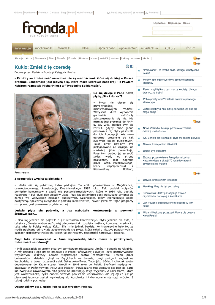 Główna Modlitewnik Fronda.tv Ciekawe Blogi Forum Klub Fronda.pl Poleć przyjaciołom Kontakt Reklama Logowanie Aborcja Akcja Ekonomia Film Filozofia Fronda Historia Islam Kościół Kultura Lektury duchowe Rejestracja Hasło Media RSS RSS Kukiz: Zmielić tę czeredę Dodane przez: Redakcja Fronda.pl Kategoria: Polska "Pornoland" - to trzeba znać. Uwaga, drastyczne treści! - Patriotyzm i tożsamość narodowa nie są wartościami, które się dzisiaj w Polsce promuje. Solidarność jest jedyną siłą, która może uzdrowić nasz kraj – z Pawłem Kukizem rozmawia Michał Miłosz w "Tygodniku Solidarność". Mocny apel egzorcystów w sprawie koncertu Madonny Co się dzieje z Pana nową płytą „Siła i Honor”? – Płyta nie cieszy się przychylnością mainstreamowych mediów. Wszystkie duże wytwórnie gremialnie odmówiły zainteresowania się nią. Nie mam żadnej pretensji do RMFu, czy Z-ki. Bardzo bym się zdziwił, gdyby choć jedna piosenka z tej płyty pasowała do ich koncepcji. Ale mam ogromne pretensje do tak zwanych stacji publicznych. Takie płyty powinny być pielęgnowane ze względu na wartości, jakie prezentują. Poza tym trudno jej zarzucić jakieś wady od strony muzycznej. Jest nagrana przez Rafała Paczkowskiego, który współpracował z Kieślowskim, Holland, Penis, czyli tylko o tym marzą kobiety. Uwaga, drastyczne treści! Polka-prostytutka? Historia narodzin pewnego stereotypu... Jeżeli celebryta nosi nitkę, to wiedz, że coś się złego dzieje RSS Nowa Zelandia: biskupi przeciwko zmianie definicji małżeństwa Ks. Bartołd dla Fronda.pl: Było mi bardzo przykro Darwin, kreacjonizm i Kościół Dajcie żyć tradsom! Zobacz przemówienie Prezydenta Lecha Kaczyńskiego z okazji 70 rocznicy agresji sowieckiej na Polskę Preisnerem. RSS Z czego więc wynika ta blokada ? Darwin, kreacjonizm i Kościół – Media nie są publiczne, tylko partyjne. To efekt porozumienia w Magdalence, usankcjonowanego konstytucją Kwaśniewskiego 1997 roku. Taki podział wpływów pomiędzy komunistów a część elit postsolidarnościowych, które w 1989 roku zostały rozegrane – byli głupi albo weszli w układ. Przy każdej zmianie opcji politycznej zmienia się zarząd we wszystkich mediach publicznych. Dziennikarz, który reprezentuje opcję polityczną, społeczną niezgodną z polityką kierownictwa, nawet jeżeli ma fajne programy muzyczne, jest przesuwany gdzie indziej. Ledwie płyta się środowiskach... pojawiła, a już wzbudziła kontrowersje w pewnych Hawking: Bóg nie był potrzebny Terlikowski: „GW” już szykuje swoich czytelników na wojnę z katolikami Jan Paweł II błogosławionym jeszcze w tym roku? Ulicami Krakowa przeszedł Marsz dla Jezusa Króla Polski – Ona się jeszcze nie pojawiła a już wzbudziła kontrowersje. Płyty jeszcze nie było, a teksty z „Gazety Wyborczej” o niej odebrałem tak: to płyta złośliwa, ironiczna, wredna i o taką właśnie Polskę walczy Kukiz. Dla mnie jednak bardziej kontrowersyjne było to, że media publiczne odmawiają zaopiekowania się płytą, która mówi o niezbyt popularnych w czasach globalizmu treściach, takich jak patriotyzm, tożsamość narodowa i historia. Skąd taka stanowczość w Pana tożsamości narodowej? wypowiedzi, kiedy mowa o patriotyzmie, – Mój pradziadek ze strony ojca był burmistrzem miasteczka Uhnów – obecnie na Ukrainie. A mój dziadek i jego bracia pracowali w Policji Państwowej i Dwójce, czyli kontrwywiadzie wojskowym. Wszyscy oprócz wojskowego zostali zamordowani. Trzech przez bolszewików: dziadek zginął na Brygidkach we Lwowie, drugi policjant zaginął na Wschodzie, a trzeci przeszedł szlak Ostaszków–Twer. Tato jako 10-letni chłopak został deportowany do Kazachstanu. Wrócił w 1946 roku do Polski. Skończył medycynę i pracował w Państwowym Instytucie Higieny. Powiedziano mu: zapisuje się pan do partii lub związków zawodowych, albo jedzie na prowincję. Więc wyjechał. Z kolei mama, która jest warszawianką, tylko cudem przeżyła powstanie warszawskie, ale jej ojciec już po pierwszej łapance został wywieziony do Auschwitz i tylko ubranie stamtąd wróciło. Z takiej rodziny pochodzę. Osiągnęliśmy etap, gdzie Polska jest wrogiem Polaka? www.fronda.pl/news/czytaj/tytul/kukiz:_zmielic_te_czerede_24031 1/4 – Tego bym nie powiedział. Polska nie jest dla obywateli, ale dla pewnej grupy, pewnych kast, które pretendują do miana elit. Dla Platformy od początku państwo było interesem. Obsadzają stanowiska nie według klucza fachowości, tylko wierności, czy na podstawie atrybutów posiadanych przez ministrę. Proszę mi pokazać drugie państwo, gdzie kobieta uczy się jak rządzić po objęciu stanowiska, jak ministra sportu – Mucha. Ostatnie wybory pokazały także, że w naszym kraju, przy takim układzie nie zmieni się nic. Nieważne, czy przyjdzie ta partia czy inna. Możesz tylko liczyć na dobrą wolę szefa partii. Przyjmijmy nawet hipotetycznie, że to byłby Jarosław Kaczyński. Musi patrzeć na wszelkie zależności, wynikające z poustawiania partii wewnątrz i związanych z tym kompromisów. Jeżeli przestanie działać w interesie klanu, to klan się go pozbędzie. Dramatem PiS jest to, że w katastrofie smoleńskiej zginęła elita tej partii. Smoleńsk wstrząsnął Panem? – Tak. Smoleńsk wstrząsnął mną w sposób nieprawdopodobny. Państwo polskie spadło w ruskie błoto i tam leży do tej pory. Były dziesiątki możliwości nieoddawania śledztwa Rosjanom, a więc podmiotowi, który nie okazuje dobrej woli, żeby wyjaśnić, co się stało 70 lat temu w Katyniu. Wynikało to albo z głupoty, albo przerażenia sytuacją, uniemożliwiającego logiczne myślenie, albo ze zdrady. Każda z tych opcji dyskwalifikuje Tuska jako szefa rządu. PO przyciągnęła ludzi obietnicą reformy państwa... – Tak. Platformę poparło 750 tys. obywateli, podpisując się pod postulatami 4 razy tak: zmiana ordynacji wybor