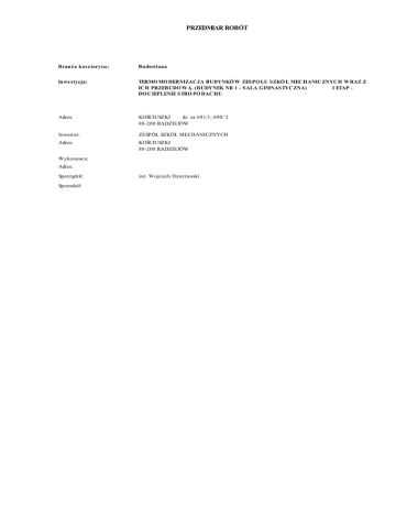 PRZEDMIAR ROBÓT Bran ż a kosz torysu : Budowlana Inwe stycja: TERMO MO DERNIZAC JA BUDYNKÓ W ZES PO ŁU SZKÓ Ł MEC HANIC ZNYC H W RAZ Z IC H PRZEBUDO W Ą. (BUDYNEK NR 1 - S ALA GIMNAS TYC ZNA) I ETAP DO C IEPLENIE S TRO PO DAC HU Adres: KOŚCIUSZKI dz. nr 691/1, 690/ 2 88-200 RADZIEJÓW Inwestor: ZESPÓŁ SZKÓŁ MECHANICZNYCH Adres: KOŚCIUSZKI 88-200 RADZIEJÓW Wykonawca: Adres: Sporządził: Sprawdził: inż. Wojciech Dzierżawski Lp Kod O pis, lok ali z acja i wylicz e n ia Jm. Ilości składowe Raz e m 1 2 3 4 5 6 1 DO C IEPLENIE S TRO PO DAC HU 1.1 KNR 4-01 0535-0300 1.2 KNR 4-01 0535-0800 1.3 KNR 4-01 0701-0200 1.4 KNR 4-03 1138-0300 1.5 KNR 4-03 1140-0500 1.6 KNR 4-04 1101-0200 1.7 KNR 2-02 0122-0100 1.8 KNR 4-01 0727-0300 1.9 KNR 2-02 0410-0100 1.10 NNRNKB 202U 05410200 1.11 KNR 2-02 0609-0100 1.12 KNR-W 202 0504-020 0 1.13 KNR-W 202 0519-040 0 1.14 KNR 4-01 1212-2500 1.15 KNR 4-01 1212-3701 1.16 KSNR 5 0601-0201 Rozebranie rynien z blachy nadającej się do użytku m 61,4 m Rozebranie obróbek blacharskich murów ogniowych, okapów, kołnierzy gzymsów itp.z blachy nie nadającej się do użytku m2 83,1 m2 Odbicie tynków wewnętrznych z zaprawy cementowowapiennej o powierzchni do 5 m2 na ścianach,filarach,pilastrach m2 44 m2 Demontaż wsporników odstępowych instalacji odgromowej na dachu płaskim o podłożu z papy na betonie szt. 195 szt. Demontaż przewodów uziemiających i odgromowych na dachu płaskim. Płaskownik lub pręt 61,400 61,400 83,100 83,100 44,000 44,000 195,000 195,000 m 195 m Wywiezienie gruzu z terenu rozbiórki przy ręcznym załadowaniu i wyładowaniu. T ransport gruzu samochodem ciężarowym skrzyniowym na odległość 1 km m3 2,5 m3 Kominy wolno stojące wieloprzewodowe,o przekroju 1/2 x 1/2 cegły na 1 m3 komina. m3 0,7 m3 Uzupełnienie tynków zewnętrznych cementowych kat.II ścian,loggii,balkonów,podłoże z cegły,pustaków ceramicznych,gazo-i pianobetonów,w jednym miejscu do 5 m2 m2 44 m2 Deskowanie połaci dachowych z tarcicy nasyconej. Analogia wykonanie przedłużenia okapu z płyty OSB wodoodpornej gr. 25mm. Krotność = 2 m2 24,56 m2 Obróbki blacharskie z blachy powlekanej o szerokości w rozwinięciu ponad 25 cm (Orgbud W-wa) m2 83,1 m2 Izolacje cieplne i przeciwdźwiękowe,z płyt styropianowych na lepiku,poziome na wierzchu konstrukcji. - Analogia izolacja stropodachu z płyt PW / styropapa/ gr. 12 cm m2 878 m2 Dwuwarstwowe pokrycie dachów papą termozgrzewalną m2 878 m2 Rynny dachowe półokrągłe o średnicy 15 cm z blachy stalowej ocynkowanej o grubości 0,60 mm - materiał z odzysku. m 61,4 m Dwukrotne malowanie rynien i rur spustowych farbą olejną nawierzchniową ogólnego stosowania m 61,4 m Dwukrotne malowanie rur wodociągowych i gazowych o średnicy ponad 200 do 300 mm farbą ftalową nawierzchniową. Analogia - malowanie wywietrzników dachowych i wentylatorów m 5 m Montaż zwodów instalacji odgromowej z prętów stalowych ocynkowanych,przewodów nienaprężanych,poziomych mocowanych na wspornikach klejonych m 195,000 195,000 2,500 2,500 0,700 0,700 44,000 44,000 24,560 24,560 83,100 83,100 878,000 878,000 878,000 878,000 61,400 61,400 61,400 61,400 5,000 5,000 195,000 Lp Kod 1 2 O pis, lok ali z acja i wylicz e n ia 3 195 1.17 KNNR 5 1304-0300 1.18 KNNR 5 1304-0400 Jm. 4 m Badania i pomiary instalacji piorunochronnej. Instalacja odgromowa, pomiar pierwszy szt. 1 szt. Badania i pomiary instalacji piorunochronnej. Instalacja odgromowa za każdy następny pomiar szt. 7 szt. Ilości składowe Raz e m 5 6 195,000 1,000 1,000 7,000 7,000