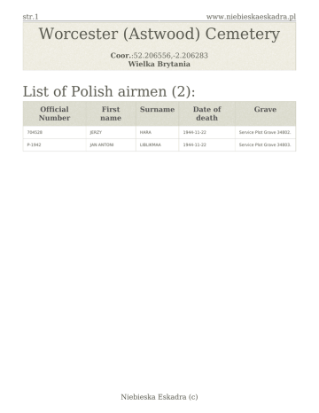 str.1 www.niebieskaeskadra.pl Worcester (Astwood) Cemetery Coor.:52.206556,-2.206283 Wielka Brytania List of Polish airmen (2): Official Number First name Surname Date of death Grave 704528 JERZY HARA 1944-11-22 Service Plot Grave 34802. P-1942 JAN ANTONI LIBLIKMAA 1944-11-22 Service Plot Grave 34803. Niebieska Eskadra (c)