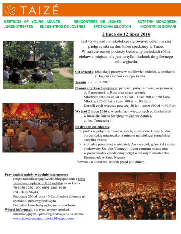 MEETINGS OF YOUNG ADULTS RENCONTRES DE JEUNES JUGENDTREFFEN ENCUENTROS DE JÓVENES SPOTKANIA MŁODYCH BCTPEЧИ MOΛOДEЖИ INCONTRI DI GIOVANI 2 lipca do 12 lipca 2016 Jest to wyjazd na rekolekcje i głównym celem naszej pielgrzymki są dni, które spędzimy w Taize. W trakcie naszej podróży będziemy zwiedzali różne ciekawe miejsca, ale jest to tylko dodatek do głównego celu wyjazdu. Cel wyjazdu: rekolekcje przeżyte w modlitwie i radości, w spotkaniu z Bogiem i ludźmi z całego świata. Termin: 2 - 12.07.2016 Planowany koszt obejmuje: przejazd, pobyt w Taize, wejściówkę do Europapark w Rust oraz ubezpieczenie: Młodzież szkolna do lat 15-19 lat - koszt 500 zł + 90 Euro Młodzież 20-30 lat - koszt 500 zł + 100 Euro Dorośli czyli wszyscy powyżej 30 lat - koszt 500 zł +190 Euro Wyjazd 2 lipca 2016 r. w godzinach wieczornych po Eucharystii w kościele Ducha Świętego w Zabrzu-Zandce, ul. ks. Tomeczka 1 Po drodze zwiedzamy: > podczas pobytu w Taize w sobotę miasteczko Cluny (cudne burgundzkie miasteczko z ruinami największej romańskiej bazyliki świata) > w drodze powrotnej w niedzielę Ars (kościół, gdzie żył i został pochowany Św. Jan Vianney) i Lyon centrum miasta oraz w poniedziałek całodzienny pobyt w wesołym miasteczku Europapark w Rust, Niemcy Powrót do domu we wtorek przed południem. Przy zapisie należy wypełnić internetowo (http://taizediecezjagliwicka.blogspot.com ) kartę zapisową i wpłacić 300 zł zadatku na nr konta 70 1050 1230 1000 0091 1263 1040 ING Bank Śląski. Pozostałe 200 zł oraz 10 Euro będzie zbierane na spotkaniu przedwyjazdowym. Pozostałe Euro będą wpłacane w autobusie. Więcej informacji (w tym terminy spotkań informacyjnych - przedwyjazdowych) na stronie www.taizediecezjagliwicka.blogspot.com