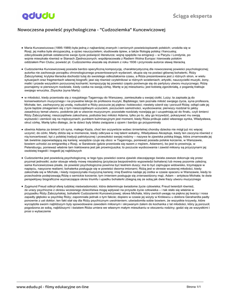 Ściąga eksperta Nowoczesna powieść psychologiczna - "Cudzoziemka" Kuncewiczowej Maria Kuncewiczowa (1895-1989) była jedną z najbardziej znanych i cenionych powieściopisarek polskich; urodziła się w Rosji, jej matka była skrzypaczką, a ojciec nauczycielem; studiowała śpiew, a także filologię polską i francuską; zdecydowała jednak ostatecznie swoje życie poświęcić literaturze; wojnę spędziła na emigracji – w Paryżu i Londynie, po wojnie mieszkała również w Stanach Zjednoczonych; współpracowała z Radiem Wolna Europa i kierowała polskim oddziałem Pen Clubu; powieść pt. Cudzoziemka ukazała się drukiem z roku 1936 i przyniosła autorce sławę literacką Cudzoziemka Kuncewiczowej posiada bardzo specyficzną kompozycję, charakterystyczną dla nowoczesnej powieści psychologicznej; autorka nie zachowuje porządku chronologicznego prezentowanych wydarzeń, skupia się na postaci głównej bohaterki, Róży Żabczyńskiej; krytyka literacka dochodzi tutaj do swoistego odkształcenia czasu, a Róża prezentowana jest z różnych stron, w wielu sytuacjach oraz fragmentach własnej biografii; jawi się również czytelnikowi w różnych wcieleniach; artystki, nauczycielki muzyki, żony, matki i przede wszystkim porzuconej kochanki; kompozycję tej powieści często porównuje się do partytury utworu muzycznego; Różę poznajemy w pierwszym rozdziale, kiedy czeka na swoją córkę, Martę w jej mieszkaniu; jest kobietą zgorzkniałą, z pogardą traktuje swojego wnuczka, Zbyszka (syna Marty) w młodości, kiedy przeniosła się z rosyjskiego Taganrogu do Warszawy, zamieszkała u swojej ciotki, Luizy; ta zapisała ją do konserwatorium muzycznego i na prywatne lekcje do profesora muzyki, Bądskiego; tam poznała miłość swojego życia, syna profesora, Michała; ten, zachwycony jej urodą, rozbudził w Róży poczucie jej piękna i kobiecości; niestety ożenił się i porzucił Różę; odtąd całe jej życie będzie zmaganiem się z tym nieszczęśliwym uczuciem, poczuciem samotności, wyobcowania; pierwszy rozdział to jakby zasadniczy temat utworu, podobnie jak w utworze muzycznym; pozostałe rozdziały rozwijają go i uzupełniają aż do finału, czyli śmierci Róży Żabczyńskiej; nieszczęśliwie zakochana, poślubia bez miłości Adama, tylko po to, aby go krzywdzić, pokazywać mu swoją wyższość i zemścić się na mężczyznach; punktem kulminacyjnym jest moment, kiedy Róża próbuje zabić własnego synka, Władysława, otruć córkę, Martę tylko dlatego, że te dzieci były blisko związane z ojcem i bardzo go przypominały obwinia Adama za śmierć ich syna, małego Kazia, choć ten oczywiście wobec śmiertelnej choroby dziecka nie mógł już nic więcej uczynić; do córki, Marty zbliża się w momencie, kiedy odkrywa w niej talent wokalny, Władysława Akceptuje, kiedy ten zaczyna również z nią koncertować; kpi z polskiej tradycji patriotycznej i przeszłości swojej rodziny – nazywa te zjawiska polską blagą, która zmarnowała jej tak świetnie zapowiadającą się karierę; wszędzie czuje się obco: w Taganrogu, ponieważ posiada polskie korzenie, w Warszawie, bowiem uchodzi za emigrantkę z Rosji, w Saratowie (gdzie przeniosła się razem z mężem, Adamem), bo jest to prowincja, w Petersburgu, ponieważ właśnie tam traktowana jest jak prowincjuszka; to poczucie wyobcowania i zawód miłosny są przyczynami jej osobistej tragedii i tragedii jej najbliższych Cudzoziemka jest powieścią psychologiczną; w tego typu powieści ocena zjawisk otaczającego świata zawsze dokonuje się przez pryzmat jednostki; autor stosuje wtedy mowę niezależną (przytacza bezpośrednio wypowiedzi bohatera) lub mowę pozornie zależną; sama Kuncewiczowa pisała, że powieść psychologiczna powinna być teatrem duszy; ma to być zajmujące widowisko, trzymające w napięciu, nasycone realiami; bohaterka posługuje się w powieści dwoma imionami; Różą jest w okresie wczesnej młodości, kiedy zakochała się w Michale, i kiedy rozpoczynała muzyczną karierę; imię Ewelina nadaje jej ciotka w czasie spaceru w Warszawie, kiedy to przechodnie podejrzewają Różę o semickie korzenie; tym imieniem posługuje się znienawidzony mąż, Adam – antyteza Michała; te dwie perspektywy biograficzne wyznaczające okres triumfu i upadku bohaterki zbiegną się ze sobą jak dwie frazy utworu muzycznego Zygmund Freud odkrył sferę ludzkiej nieświadomości, która determinuje świadome życie człowieka; Freud twierdził również, że urazy psychiczne z okresu wczesnego dzieciństwa mogą wpływać na przyszłe życie człowieka – i tak stało się właśnie w przypadku Róży Żabczyńskiej, bohaterki Cudzoziemki Kuncewiczowej; słowa Michała, który zwrócił uwagę na piękno jej twarzy i nosa zapadły głęboko w psychikę Róży; zapomniała jednak o tym fakcie; dopiero w czasie jej wizyty w Królewcu u doktora Gerahardta padły ponownie z ust doktor; ten fakt stał się dla Róży psychicznym uwolnieniem; uświadomiła sobie bowiem, że wszystkie krzywdy, które wyrządziła swoim najbliższym były spowodowane zawodem miłosnym i skrywanym żalem do kochanka z lat młodości, który ją porzucił; pogodzona ze sobą, najbliższymi i światem Róża umiera we własnym małym mieszkaniu w otoczeniu rodziny; godzi się ze wszystkimi i prosi o wybaczenie www.edudu.pl - filmy edukacyjne on-line Powered by TCPDF (www.tcpdf.org) Strona 1/1