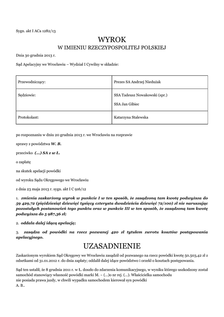Sygn. akt I ACa 1282/13 WYROK W IMIENIU RZECZYPOSPOLITEJ POLSKIEJ Dnia 30 grudnia 2013 r. Sąd Apelacyjny we Wrocławiu – Wydział I Cywilny w składzie: Przewodniczący: Prezes SA Andrzej Niedużak Sędziowie: SSA Tadeusz Nowakowski (spr.) SSA Jan Gibiec Protokolant: Katarzyna Stalewska po rozpoznaniu w dniu 20 grudnia 2013 r. we Wrocławiu na rozprawie sprawy z powództwa W. B. przeciwko (...) SA z w Ł. o zapłatę na skutek apelacji powódki od wyroku Sądu Okręgowego we Wrocławiu z dnia 23 maja 2013 r. sygn. akt I C 916/12 1. zmienia zaskarżony wyrok w punkcie I w ten sposób, że zasądzoną tam kwotę podwyższa do 59 429,72 (pięćdziesiąt dziewięć tysięcy czterysta dwadzieścia dziewięć 72/100) zł nie naruszając pozostałych postanowień tego punktu oraz w punkcie III w ten sposób, że zasądzoną tam kwotę podwyższa do 5 987,36 zł; 2. oddala dalej idącą apelację; 3. zasądza od powódki na rzecz pozwanej 420 zł tytułem zwrotu kosztów postępowania apelacyjnego. UZASADNIENIE Zaskarżonym wyrokiem Sąd Okręgowy we Wrocławiu zasądził od pozwanego na rzecz powódki kwotę 50.503,42 zł z odsetkami od 31.01.2012 r. do dnia zapłaty; oddalił dalej idące powództwo i orzekł o kosztach postępowania. Sąd ten ustalił, że 8 grudnia 2011 r. w Ł. doszło do zdarzenia komunikacyjnego, w wyniku którego uszkodzony został samochód stanowiący własność powódki marki M. − (...)o nr rej. (...). Właścicielka samochodu nie posiada prawa jazdy, w chwili wypadku samochodem kierował syn powódki A. B.. Pozwana (...) S.A. zobowiązany był do naprawienia szkody wyrządzonej powódce z tytułu umowy ubezpieczenia odpowiedzialności cywilnej sprawcy kolizji. Dnia 31 stycznia 2012 r. pozwany wydał decyzję o wypłacie należnego odszkodowania na rzecz powódki w wysokości 91.419,89 zł w tym 88.884,89 zł to koszty naprawy pojazdu. W tym też dniu pozwany wypłacił powódce 91.419,89 zł. Powódka jest właścicielem zakładu blacharskiego i wulkanizacyjnego oraz myjni samochodowej. Prowadzi działalność gospodarczą pod firmą (...). Uszkodzony M. jest jej jedynym samochodem i nie był wciągnięty do ewidencji środków trwałych (...). Samochód ten wyprodukowany w 2007 r. był kupiony przez powódkę w 2009 r., został przywieziony z Niemiec i od początku zakupu użytkowany przez A. B.. Po kolizji syn powódki wynajął M. (...), którego używał do obsługi zakładu matki, a także w celu podwożenia matki na wizyty lekarskie. Uszkodzony M. został w całości naprawiony w zakładzie należącym do powódki. Naprawa trwała 20 dni przy wykorzystaniu części oryginalnych zakupionych w salonie (...) w Niemczech. Powódka jest matką dwójki dzieci. Jej córka mieszka niedaleko, jednakże to syn A. mieszka z matką i opiekuje się nią. Dnia 1 marca 2012 r. powódka wezwała pozwanego do zapłaty 77.256,98 zł brutto tytułem dalszego odszkodowania, opierając się na opinii rzeczoznawcy M. M. co do kosztów naprawy oraz poniesionych przez nią wydatków na auto zastępcze w kwocie 24.600 zł brutto. Według dalszych ustaleń Sądu Okręgowego łączny koszt naprawy samochodu powódki, z zastosowaniem części nowych, oryginalnych z logo M. wynosi 140.900,61 zł brutto, a z zastosowaniem części zamiennych nieoryginalnych o oznaczeniu klasy (...) wynosi 139.388,31 zł brutto. Części te są tego samego producenta jak w przypadku części oryginalny, jedynie nie posiadają logo producenta samochodu. Ich dystrybucja odbywa się poza siecią magazynową producenta danej marki samochodu. Przy tak ustalonym stanie faktycznym Sąd pierwszej instancji uznał, że powództwo w znacznej mierze należało uwzględnić. Jednakże wysokość szkody w zakresie wydatków koniecznych na naprawę samochodu, powinna być wyliczona z zastosowaniem części zamiennych nieoryginalnych o oznaczeniu klasy Q, czyli do kwoty 139.388,31 zł brutto. W ocenie tego Sądu zastosowanie w naprawie tychże zamienników nie zmniejsza jakości szacowanych przez biegłego koniecznych napraw, nie ujmuje estetyce pojazdu istniejącej przed wypadkiem. W tej części Sąd Okręgowy zgodził się z wywodami opinii uzupełniającej biegłego K. M.. Odpowiedzialność pozwanego ogranicza się jedynie do szkody rzeczywiście poniesionej przez poszkodowaną (art. 361 § 1 k.c.). Za niezasadne uznał Sąd Okręgowy żądanie powódki, co do kosztów poniesionych w związku z transportem zastępczym (24.600 zł). Zdaniem tego Sądu o powyższym zadecydował określony w art. 6 k.c. rozkład ciężaru dowodu. Powołał w związku z tym szereg orzeczeń Sądu Najwyższego i uznał, że powódka nie wykazała zasadności poniesionych przez nią kosztów transportu zastępczego. Nie udowodniła żadnym dokumentem faktu dowozu na wizyty lekarskie. Nie wskazała żadnych konkretnych okoliczności faktycznych, aby M. (...) był użytkowany dla potrzeb prowadzonej przez nią działalności gospodarczej, nie przedstawiła ewidencji przebiegu przejazdu tegoż samochodu. Jako niewiarygodne uznał Sąd Okręgowy zeznania na te okoliczności świadka A. B.. Wyrok ten co do punktu II i III zaskarżyła powódka. W apelacji zarzuciła: - naruszenie przepisów prawa materialnego, a to art. 363 § 1 k.c. przez jego błędną wykładnię i uznanie, że do naprawy uszkodzonego samochodu powódki mogą być zastosowane części zamiennego nieoryginalne; art. 361 § 1 k.c. w zw. z art. 805 k.c. w zw. z art. 6 k.c. przez ich niewłaściwe zastosowane i uznanie, że powódka nie wykazała zasadności poniesionych przez nią kosztów najmu pojazdu zastępczego, pozostającego w normalnym związku przyczynowym z wypadkiem komunikacyjnym i stanowiącym stratę w rozumieniu art. 363 § 2 k.c., - naruszenie przepisów postępowania, a to art. 233 § 1 k.p.c., art. 316 k.p.c. i art. 328 § 2 k.p.c. przez brak wszechstronnego rozważenia materiału dowodowego, brak dostatecznego uzasadnienia selekcji i oceny dowodów, na k