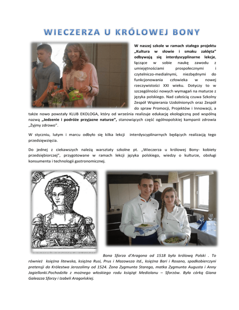 W naszej szkole w ramach stałego projektu „Kultura w słowie i smaku zaklęta” odbywają się interdyscyplinarne lekcje, łączące w sobie naukę zawodu z umiejętnościami prospołecznymi i czytelniczo-medialnymi, niezbędnymi do funkcjonowania człowieka w nowej rzeczywistości XXI wieku. Dotyczy to w szczególności nowych wymagań na maturze z języka polskiego. Nad całością czuwa Szkolny Zespół Wspierania Uzdolnionych oraz Zespół do spraw Promocji, Projektów i Innowacji, a także nowo powstały KLUB EKOLOGA, który od września realizuje edukację ekologiczną pod wspólną nazwą „Jedzenie i podróże przyjazne naturze”, stanowiących część ogólnopolskiej kampanii zdrowia „Żyjmy zdrowo”. W styczniu, lutym i marcu odbyło się kilka lekcji przedsięwzięcia. interdyscyplinarnych będących realizacją tego Do jednej z ciekawszych należą warsztaty szkolne pt. „Wieczerza u królowej Bony- kobiety przedsiębiorczej”, przygotowane w ramach lekcji języka polskiego, wiedzy o kulturze, obsługi konsumenta i technologii gastronomicznej. Bona Sforza d’Aragona od 1518 była królową Polski . To również księżna litewska, księżna Rusi, Prus i Mazowsza itd., księżna Bari i Rosano, spadkobierczyni pretensji do Królestwa Jerozolimy od 1524. Żona Zygmunta Starego, matka Zygmunta Augusta i Anny Jagiellonki.Pochodziła z możnego włoskiego rodu książąt Mediolanu – Sforzów. Była córką Giana Galeazza Sforzy i Izabeli Aragońskiej. W młodości Bona zdobyła staranne wykształcenie. Jej nauczycielem był Crisostomo Colonna, członek Akademii Pontana, a nad jej wychowaniem czuwał również Antonio Galateo. Bona poznała dzięki nim dzieła Wergiliusza, Cycerona i Ojców Kościoła[1], nauczyła się wypowiadać w uczony sposób, posiadła również wiedzę z zakresu historii, prawa, administracji i teologii. Była osobą gospodarną, oszczędną, a jednocześnie potrafiącą wywierać wpływ na ludzi. Wykazywała przy tym ambicję we wszystkich swoich działaniach. Opinie współczesnych o królowej były podzielone. Jedni zwracali uwagę na jej zasługi, drudzy zarzucali jej intryganctwo, chciwość, przekupstwo, oskarżając ją nawet o trucicielstwo… Obdarzona była nieprzeciętną inteligencją, była dumna i bezwzględna wobec możnych, broniła biednych i słabych przed uciskiem. Była skryta, skłonna do obrażania się, łatwo ulegała chorobliwym wybuchom gniewu. Ale…przywiozła nam zdrowe jedzenie i kucharzy-artystów! Nauczyła, jak robić pesto i delektować się biesiadą… Była mecenasem kulturalnym młodzieży polskiej, wysyłając chętnych na studia zagraniczne (było to tym bardziej cenne, że Akademia Krakowska przeżywała wówczas regres). Dzięki niej również na polskie stoły trafiło wiele nieznanych wcześniej warzyw, tzw. włoszczyzna: pomidory, kalafior, karczochy, fasola szparagowa, brokuły, kapusta, marchew, sałata czy szpinak. Również dzięki niej w Polsce pojawiły się makarony włoskie i przyprawy korzenne, które królowa uwielbiała. Wraz z przybyciem Bony wzrosło też spożycie wina, które stopniowo wypierało miody pitne. Jako mecenas kultury i sztuki, z darem przedsiębiorczości, , zrobiła jednak wiele dobrego dla Polski. Zagospodarowała wielkie połacie nieużytków, zaludniała pustki, budowała mosty, młyny, tartaki. Rozbudowywała miasta nadane jej jako „Oprawa Polskich Królowych”. Budowała twierdze warowne, np. Bar. Rozbudowała miasta Mazowsza, gdzie osiadła pod koniec życia. Królowa Bona często mawiała: „U was dukaty leżą na gościńcach, schylić się jeno, ażeby je zebrać. Nikt nie chce? Tym lepiej dla mnie”.(Wikipedia). Składniki na pesto królowej Bony: - duży pęczek bazylii (z jednej doniczki) - 3 łyżki orzeszków pinii (można je zastąpić dowolnymi orzechami) - 3 łyżki startego parmezanu (lub inny twardy ser) - ok. 4 łyżek oliwy z oliwek - 2 ząbki czosnku - sól, pieprz. Przygotowanie: Listki bazylii (razem z cienkimi łodygami) umyć i osuszyć. Orzeszki uprażyć na rozgrzanej, suchej patelni. Parmezan zetrzeć na tarce o drobnych oczkach. Czosnek obrać. Bazylię zmiksować, dodać orzeszki, parmezan i oliwę, wszystko razem zmiksować. Jeżeli masa jest zbyt gęsta, dodać oliwę z oliwek i ponownie zmiksować do pożądanej konsystencji. Pesto doprawić solą, pieprzem, dodać zmiażdżony czosnek. Dokładnie wymieszać. Podczas miksowania produktu- niezbędny uśmiech i dobry humor! Dodatki: Sałatka królowej Bony, deser owocowy- kisiel ze świeżych owoców, kompot z czarnej porzeczki. To był smaczny i zdrowy posiłek w wyjątkowo przyjaznej i ekologicznej atmosferze! KLUB EKOLOGA