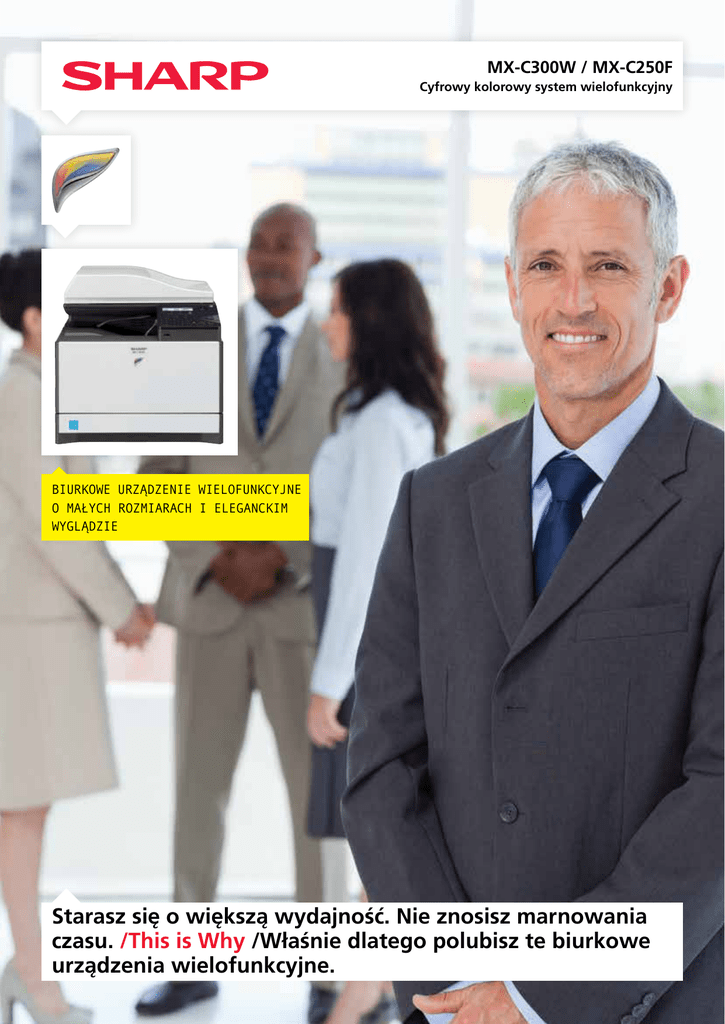 MX-C300W / MX-C250F Cyfrowy kolorowy system wielofunkcyjny BIURKOWE URZĄDZENIE WIELOFUNKCYJNE O MAŁYCH ROZMIARACH I ELEGANCKIM WYGLĄDZIE Starasz się o większą wydajność. Nie znosisz marnowania czasu. /This is Why /Właśnie dlatego polubisz te biurkowe urządzenia wielofunkcyjne. Małe rozmiary i wydajność Wydajność, małe wymiary i przystępność. /This is Why /Właśnie dlatego te urządzenia wielofunkcyjne są dla Ciebie odpowiednie. Im większa skuteczność, tym więcej pracy do wykonania. Ale jakoś nigdy nie wydaje się, że jest za dużo czasu, pieniędzy, pracowników lub wolnej przestrzeni. Dlatego, jeśli poszukujesz nowej drukarki wielofunkcyjnej (urządzenia wielofunkcyjnego), powinieneś przyjrzeć się bliżej modelowi MX-C300W lub MX-C250F firmy Sharp. Oba modele umożliwiają drukowanie i kopiowanie z prędkościami 30 lub 25 strona na minutę (str./min). I to niezależnie od tego czy przetwarzasz czarno-białe, czy kolorowe dokumenty. Odznaczają się wydajnością przydatną dla małych grup roboczych, a więcej niż wystarczająco dużą do osobistego użytku. Urządzenie można dopasować do wybranego miejsca, pracuje w oczekiwany sposób Te kolorowe urządzenia to doskonały wybór, jeśli w biurze nie ma zbyt wiele wolnej przestrzeni. Te urządzenia wielofunkcyjne odznaczają się nie tylko zadziwiająco małymi rozmiarami, ale również możliwością rozszerzenia pojemności papieru do 800 kartek bez konieczności poświęcania dodatkowej powierzchni biurka. Oba modele zostały wyposażone w praktyczny port USB, umożliwiający bezpośrednie drukowanie i skanowanie z pamięci USB. Jeśli wybierzesz model MX-C300W, możesz podłączyć go do bezprzewodowej sieci i bezprzewodowo drukować ze swojego smartfona lub tabletu. Ale prędkości drukowania to tylko jedna strona równania wydajności. Właśnie dlatego zaprojektowaliśmy te urządzenia wielofunkcyjne, abyś mógł automatycznie drukować i kopiować na obu stronach kartki, oszczędzając czas i uzyskując dodatkowe korzyści w postaci mniejszego zużycia papieru. 50-kartkowy podajnik dokumentów (35-kartkowy, jeśli wybierzesz model MX-C250F) umożliwia zeskanowanie do 9 kolorowych stron na minutę z rozdzielczością 600 x 600 dpi. Wystarczy, że włożysz dokumenty do podajnika i pozwolisz urządzeniu wielofunkcyjnemu wykonać swoją pracę, a w tym czasie możesz zająć się innym zadaniem. Port USB dostępny od przodu Wybór podajników papieru 2 Bezpieczeństwo i energooszczędność Zasoby są drogocenne /This is Why /Właśnie dlatego pomagamy je jak najlepiej wykorzystać. Urządzenia MX-C300W i MX-C250F wyróżniają się małymi Bezpieczeństwo w standardzie rozmiarami i eleganckim wyglądem. Oba modele są Jeśli pracujesz we wspólnym biurze, możesz potrzebować kontroli wykorzystywania urządzenia wielofunkcyjnego. A na pewno nie chcesz, aby poufne dokumenty były ogólnie dostępne. wyposażone w czytelny panel sterowania z zaprogramowanymi przyciskami funkcyjnymi, a ich dwuelementowy system utrwalania zapewnia jakość, która robi wrażenie. Inne użyteczne funkcje obejmują faks (PC-faks i przekazywanie wewnętrzne faksów pocztą e-mail do właściwych odbiorców) oraz kopiowanie kart identyfikacyjnych. Kopiowanie kart identyfikacyjnych ułatwia kopiowanie obu stron karty (np. identyfikacyjnej lub kredytowej) na jednej stronie kartki. Jest to wygodna funkcja, która pozwala obniżyć koszty. Identyfikacja użytkownika umożliwia ograniczenie dostępu do urządzenia wielofunkcyjnego wyłącznie upoważnionym użytkownikom, którzy mogą „odblokować” urządzenie dokonując identyfikacji poprzez wprowadzenie osobistego 5-cyfrowego kodu. W celu zapewnienia jeszcze większego bezpieczeństwa firma Sharp wykorzystuje technologię IPsec do szyfrowania danych, zapewniając że Twój system nie komunikuje się z nieupoważnionymi użytkownikami. Energooszczędność Nikt nie chce marnotrawić energii. Istnieją jeszcze inne powody, dla których warto umieścić odznaczone certyfikatem Energy Star modele MX-C300W i MX-C250F na początku listy zakupów. Po pierwsze ich niskie zużycie energii i krótkie czasy rozgrzewania przynoszą realne oszczędności. Urządzenia są wyposażone również w specjalny tryb oszczędzania toneru, który zmniejsza ilość używanego toneru do drukowania obrazów i grafiki bez obniżania jakości drukowanego tekstu. A nawet wyłączają się automatycznie po upływie określonego czasu bezczynności. 5-liniowy panel sterowania z zaprogramowanymi przyciskami funkcyjnymi Opcjonalna szuflada o pojemności 500 kartek 3 Dane techniczne Dane ogólne Maksymalna prędkość urządzenia (stron/kopii na minutę) Tryb kolorowy/cz.-b. A4 MX-C300W 30 MX-C250F 25 Czas nagrzewania*1 (sekundy) 29 Pamięć (MB) 512 Źródło zasilania 220-240 V~, 50/60 Hz Format papieru (min. - maks.) Pobór mocy w kW (maks.) 1,84 (200-240 V) Gramatura papieru (g/m2) Szuflada Podajnik boczny Szuflada opcjonalna A6R – A4R Wymiary w mm (szer. x gł. x wys.) MX-C300W 429 x 509 x 421 MX-C250F 429 x 509 x 398 60 – 105 55 – 220 60 – 105 Ciężar (kg) MX-C300W MX-C250F Pojemność papieru (standardowa - maksymalna) Liczba kartek 300 – 800 Szuflady 1–2 29 28 Kopiarka Skaner sieciowy Format skanowanego oryginału (maks.) A4 Metoda skanowania Push scan (poprzez panel sterowania) Pull scan (aplikacja zgodna ze standardem TWAIN) Czas uzyskania pierwszej kopii*2 (sekundy) Tryb kolorowy/cz.-b. 15 Rozdzielczość (dpi) Push scan Pull scan 100, 150, 200, 300, 400, 600 75, 100, 150, 200, 300, 400, 600 50 - 9600 zgodnie z ustawieniem użytkownika Formaty plików TIFF, PDF, JPEG (tylko w kolorze) Kopiowanie w trybie ciągłym (maks. liczba kopii) 999 Rozdzielczość (dpi) Skanowanie Drukowanie 600 x 600, 600 x 300 (standardowo) 600 x 600 Gradacja odcieni 256 Odbiorcy zeskanowanych dokumentów Skanowanie do e-mail, serwera FTP, folderu sieciowego (SMB), pamięci USB, na pulpit Oprogramowan