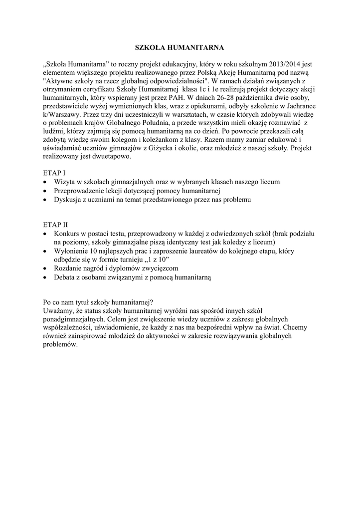 SZKOŁA HUMANITARNA „Szkoła Humanitarna” to roczny projekt edukacyjny, który w roku szkolnym 2013/2014 jest elementem większego projektu realizowanego przez Polską Akcję Humanitarną pod nazwą "Aktywne szkoły na rzecz globalnej odpowiedzialności". W ramach działań związanych z otrzymaniem certyfikatu Szkoły Humanitarnej klasa 1c i 1e realizują projekt dotyczący akcji humanitarnych, który wspierany jest przez PAH. W dniach 26-28 października dwie osoby, przedstawiciele wyżej wymienionych klas, wraz z opiekunami, odbyły szkolenie w Jachrance k/Warszawy. Przez trzy dni uczestniczyli w warsztatach, w czasie których zdobywali wiedzę o problemach krajów Globalnego Południa, a przede wszystkim mieli okazję rozmawiać z ludźmi, którzy zajmują się pomocą humanitarną na co dzień. Po powrocie przekazali całą zdobytą wiedzę swoim kolegom i koleżankom z klasy. Razem mamy zamiar edukować i uświadamiać uczniów gimnazjów z Giżycka i okolic, oraz młodzież z naszej szkoły. Projekt realizowany jest dwuetapowo. ETAP I Wizyta w szkołach gimnazjalnych oraz w wybranych klasach naszego liceum Przeprowadzenie lekcji dotyczącej pomocy humanitarnej Dyskusja z uczniami na temat przedstawionego przez nas problemu ETAP II Konkurs w postaci testu, przeprowadzony w każdej z odwiedzonych szkół (brak podziału na poziomy, szkoły gimnazjalne piszą identyczny test jak koledzy z liceum) Wyłonienie 10 najlepszych prac i zaproszenie laureatów do kolejnego etapu, który odbędzie się w formie turnieju „1 z 10” Rozdanie nagród i dyplomów zwycięzcom Debata z osobami związanymi z pomocą humanitarną Po co nam tytuł szkoły humanitarnej? Uważamy, że status szkoły humanitarnej wyróżni nas spośród innych szkół ponadgimnazjalnych. Celem jest zwiększenie wiedzy uczniów z zakresu globalnych współzależności, uświadomienie, że każdy z nas ma bezpośredni wpływ na świat. Chcemy również zainspirować młodzież do aktywności w zakresie rozwiązywania globalnych problemów.