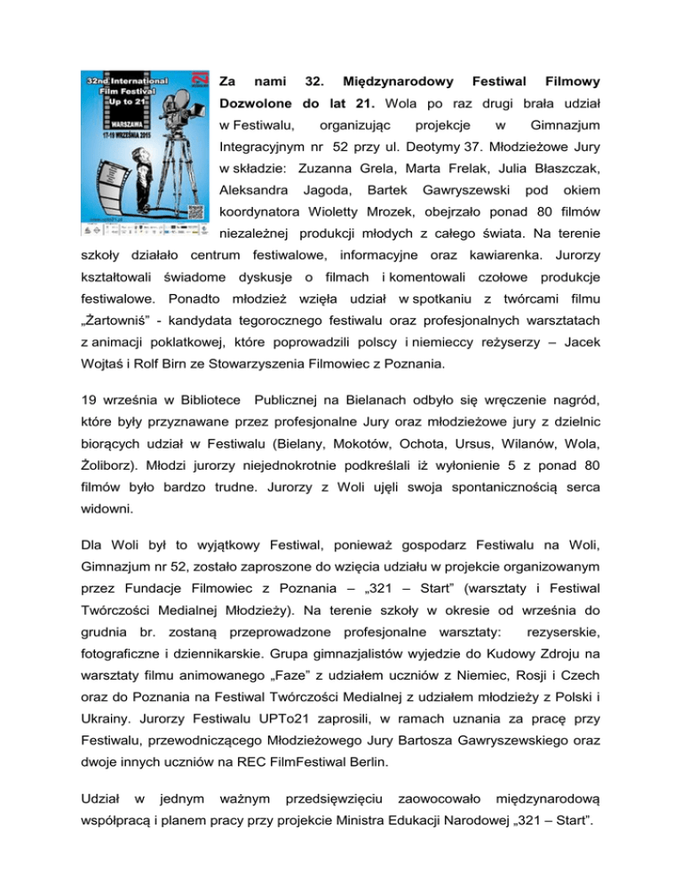 Za nami 32. Międzynarodowy Festiwal Filmowy Dozwolone do lat 21. Wola po raz drugi brała udział w Festiwalu, organizując projekcje w Gimnazjum Integracyjnym nr 52 przy ul. Deotymy 37. Młodzieżowe Jury w składzie: Zuzanna Grela, Marta Frelak, Julia Błaszczak, Aleksandra Jagoda, Bartek Gawryszewski pod okiem koordynatora Wioletty Mrozek, obejrzało ponad 80 filmów niezależnej produkcji młodych z całego świata. Na terenie szkoły działało centrum festiwalowe, informacyjne oraz kawiarenka. Jurorzy kształtowali świadome dyskusje o filmach i komentowali czołowe produkcje festiwalowe. Ponadto młodzież wzięła udział w spotkaniu z twórcami filmu „Żartowniś” - kandydata tegorocznego festiwalu oraz profesjonalnych warsztatach z animacji poklatkowej, które poprowadzili polscy i niemieccy reżyserzy – Jacek Wojtaś i Rolf Birn ze Stowarzyszenia Filmowiec z Poznania. 19 września w Bibliotece Publicznej na Bielanach odbyło się wręczenie nagród, które były przyznawane przez profesjonalne Jury oraz młodzieżowe jury z dzielnic biorących udział w Festiwalu (Bielany, Mokotów, Ochota, Ursus, Wilanów, Wola, Żoliborz). Młodzi jurorzy niejednokrotnie podkreślali iż wyłonienie 5 z ponad 80 filmów było bardzo trudne. Jurorzy z Woli ujęli swoja spontanicznością serca widowni. Dla Woli był to wyjątkowy Festiwal, ponieważ gospodarz Festiwalu na Woli, Gimnazjum nr 52, zostało zaproszone do wzięcia udziału w projekcie organizowanym przez Fundacje Filmowiec z Poznania – „321 – Start” (warsztaty i Festiwal Twórczości Medialnej Młodzieży). Na terenie szkoły w okresie od września do grudnia br. zostaną przeprowadzone profesjonalne warsztaty: rezyserskie, fotograficzne i dziennikarskie. Grupa gimnazjalistów wyjedzie do Kudowy Zdroju na warsztaty filmu animowanego „Faze” z udziałem uczniów z Niemiec, Rosji i Czech oraz do Poznania na Festiwal Twórczości Medialnej z udziałem młodzieży z Polski i Ukrainy. Jurorzy Festiwalu UPTo21 zaprosili, w ramach uznania za pracę przy Festiwalu, przewodniczącego Młodzieżowego Jury Bartosza Gawryszewskiego oraz dwoje innych uczniów na REC FilmFestiwal Berlin. Udział w jednym ważnym przedsięwzięciu zaowocowało międzynarodową współpracą i planem pracy przy projekcie Ministra Edukacji Narodowej „321 – Start”.