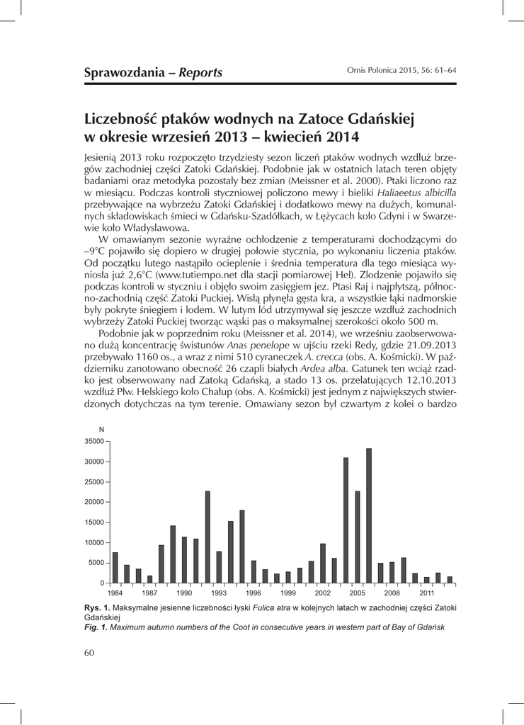 Sprawozdania – Reports Ornis Polonica 2015, 56: 61–64 Liczebność ptaków wodnych na Zatoce Gdańskiej w okresie wrzesień 2013 – kwiecień 2014 Jesienią 2013 roku rozpoczęto trzydziesty sezon liczeń ptaków wodnych wzdłuż brzegów zachodniej części Zatoki Gdańskiej. Podobnie jak w ostatnich latach teren objęty badaniami oraz metodyka pozostały bez zmian (Meissner et al. 2000). Ptaki liczono raz w miesiącu. Podczas kontroli styczniowej policzono mewy i bieliki Haliaeetus albicilla przebywające na wybrzeżu Zatoki Gdańskiej i dodatkowo mewy na dużych, komunalnych składowiskach śmieci w Gdańsku-Szadółkach, w Łężycach koło Gdyni i w Swarzewie koło Władysławowa. W omawianym sezonie wyraźne ochłodzenie z temperaturami dochodzącymi do –9°C pojawiło się dopiero w drugiej połowie stycznia, po wykonaniu liczenia ptaków. Od początku lutego nastąpiło ocieplenie i średnia temperatura dla tego miesiąca wyniosła już 2,6°C (www.tutiempo.net dla stacji pomiarowej Hel). Zlodzenie pojawiło się podczas kontroli w styczniu i objęło swoim zasięgiem jez. Ptasi Raj i najpłytszą, północno-zachodnią część Zatoki Puckiej. Wisłą płynęła gęsta kra, a wszystkie łąki nadmorskie były pokryte śniegiem i lodem. W lutym lód utrzymywał się jeszcze wzdłuż zachodnich wybrzeży Zatoki Puckiej tworząc wąski pas o maksymalnej szerokości około 500 m. Podobnie jak w poprzednim roku (Meissner et al. 2014), we wrześniu zaobserwowano dużą koncentrację świstunów Anas penelope w ujściu rzeki Redy, gdzie 21.09.2013 przebywało 1160 os., a wraz z nimi 510 cyraneczek A. crecca (obs. A. Kośmicki). W październiku zanotowano obecność 26 czapli białych Ardea alba. Gatunek ten wciąż rzadko jest obserwowany nad Zatoką Gdańską, a stado 13 os. przelatujących 12.10.2013 wzdłuż Płw. Helskiego koło Chałup (obs. A. Kośmicki) jest jednym z największych stwierdzonych dotychczas na tym terenie. Omawiany sezon był czwartym z kolei o bardzo N 35000 30000 25000 20000 15000 10000 5000 0 1984 1987 1990 1993 1996 1999 2002 2005 2008 2011 Rys. 1. Maksymalne jesienne liczebności łyski Fulica atra w kolejnych latach w zachodniej części Zatoki Gdańskiej Fig. 1. Maximum autumn numbers of the Coot in consecutive years in western part of Bay of Gdańsk 60 Tabela 1. Liczebność ptaków wodnych na Zatoce Gdańskiej od września 2013 do kwietnia 2014 Table 1. Numbers of waterbirds on the Bay of Gdańsk between September 2013 and April 2014. (1) – species, (2) – total Gatunek (1) 20.–22. 12.–13. 16.–17. 14.–15. 09.13 10.13 11.13 12.13 Cygnus olor 324 950 1441 2912 Cygnus columbianus 10 4 Cygnus cygnus 1 32 123 183 Anser fabalis 14 7 Anser albifrons 47 8 100 Anser anser 142 295 222 649 Branta canadensis Branta leucopsis 1 Branta bernicla 3 Tadorna tadorna 2 2 Anas penelope 1713 982 226 62 Anas strepera 48 46 13 Anas crecca 896 93 11 Anas platyrhynchos 849 2758 2048 3450 Anas acuta 33 61 Anas querquedula 5 Anas clypeata 90 56 1 Aythya ferina 25 6 2 8 Aythya fuligula 860 4335 4071 16683 Aythya marila 31 314 2565 2408 Somateria mollissima 5 48 9 37 Clangula hyemalis 347 2026 5643 Melanitta nigra 14 194 83 1582 Melanitta fusca 133 193 1249 Bucephala clangula 174 898 3416 8568 Mergellus albellus 7 4 86 Mergus serrator 56 70 247 Mergus merganser 400 190 349 3483 Gavia stellata 7 3 Gavia arctica 1 52 4 Tachybaptus ruficollis 28 33 1 Podiceps cristatus 790 1135 738 660 Podiceps grisegena 2 1 Podiceps nigricollis 1 Podiceps auritus 4 47 41 42 Phalacrocorax carbo 8717 9441 971 4128 Ardea cinerea 62 76 72 75 Ardea alba 26 Fulica atra 1592 1115 967 1959 Alca torda 1 Razem (2) 16805 23753 19737 54228 18.–19. 21.–23. 22.–23. 11.–13. 01.14 02.14 03.14 04.14 3295 8734 1629 1267 3 201 553 2 1 11 46 20 1 8 2540 5 10957 1578 166 6482 82 1456 12314 214 239 4619 28 29 107 18 8 65 16 2873 1 49 331 5 2 383 18 111 19923 289 313 15467 292 4469 14105 94 174 1735 1 11 4 2936 2275 270 6216 1314 4854 1168 22 483 143 2 640 2 2 630 276 6 6553 25 1225 52677 5 4 2 80 181 58 125 332 25 6 90 2051 75 9 5298 205 243 274 10 67 113 1 2 1 222 5 26 2 1343 74 23 1342 40 5 3363 60 302 71952 314 24155 24 14004 61 N 14000 12000 10000 8000 6000 4000 2000 0 2003 2004 2005 2006 2007 2008 2009 2010 2011 2012 2013 2014 Rys. 2. Zmiany liczebności mew srebrzystych Larus argentatus przebywających w styczniu na komunalnych wysypiskach śmieci w Łężycach (czarne słupki) i Szadółkach (szare słupki) Fig. 2. Changes in numbers of Herring Gulls wintering in January at the refuse dumps in Łężyce (black bars) and Szadółki (grey bars) niskich liczebnościach łyski Fulica atra. Gatunek ten pojawia się na Zatoce Gdańskiej najliczniej w okresie migracji jesiennej i niekiedy jego liczebność przekracza 30 tysięcy osobników. Na przestrzeni 30 lat badań obserwuje się jednak wyraźne wahania liczby łysek, gdy po kilku latach wysokich liczebności następuje trwający przez kolejnych kilka lat okres, w którym liczba ptaków jesienią jest wyraźnie niższa (rys. 1). W dniu 17.11.2013 zaobserwowano 52 nury czarnoszyje Gavia arctica (tab. 1) przelatujące wzdłuż Wyspy Sobieszewskej (obs. A. Janczyszyn). Dodatnie temperatury w grudniu i w styczniu spowodowały, że na badanym terenie pozostały gatunki, które rzadko tutaj zimują: świstuny, cyraneczki i jedna krakwa A. strepera (tab. 1). W styczniu w ujściu przekopu Wisły zaobserwowano też jednego ostrygojada Haematopus ostralegus (obs. C. Wójcik), a wzdłuż całego kontrolowanego odcinka wybrzeża przebywało 8 bielików. W lutym, po krótkotrwałym ochłodzeniu nastąpił wyraźny wzrost liczebności łabędzi niemych Cygnus olor, czernic Aytha fuligula oraz świstunów (tab. 1). Mogło to się wiązać z wcześniejszym niż Tabela 2. Liczebność poszczególnych gatunków mew stwierdzonych w styczniu 2014 nad Zatoką Gdańską i na trzech wysypiskach śmieci położonych w pobliżu wybrzeża Table 2. Numbers of gull specie