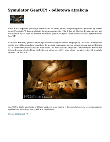 Symulator GearUP! - odlotowa atrakcja Wielu z Was zapewne podróżuje samolotami. To także jeden z wygodniejszych sposobów, by dostać się do Poznania. W końcu lotnisko Ławica znajduje się tylko 8 km od Starego Rynku. Ale czy nie marzyliście, by zasiąść za sterami samolotu pasażerskiego? Teraz możecie dzięki symulatorowi GearUP! Na ulicy Kwiatowej, jakieś 5 minut spaceru od Starego Browaru znajduje się GearUP! To miejsce to przede wszystkim symulator samolotu. Po wejściu zobaczycie wiernie odwzorowaną kabinę Boeinga 737 z blisko 600 przełącznikami oraz około 250 wskaźnikami, zegarami i kontrolkami. Pod okiem doświadczonego instruktora zdobędziecie pierwsze szlify, jako piloci i dowiecie się, jak wygląda samolot „od kuchni”. GearUP! to także kawiarnia, w której wypijecie małą czarną w fotelach lotniczych, wśród pamiątek i wydawnictw związanych oczywiście z samolotami. Więcej informacji >>