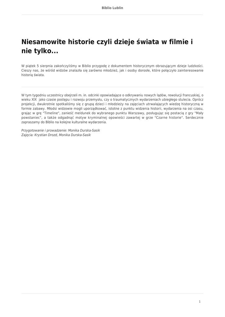 Biblio Lublin Niesamowite historie czyli dzieje świata w filmie i nie tylko... W piątek 5 sierpnia zakończyliśmy w Biblio przygodę z dokumentem historycznym obrazującym dzieje ludzkości. Cieszy nas, że wśród widzów znalazła się zarówno młodzież, jak i osoby dorosłe, które połączyło zainteresowanie historią świata. W tym tygodniu uczestnicy obejrzeli m. in. odcinki opowiadające o odkrywaniu nowych lądów, rewolucji francuskiej, o wieku XIX jako czasie postępu i rozwoju przemysłu, czy o traumatycznych wydarzeniach ubiegłego stulecia. Oprócz projekcji, dwukrotnie spotkaliśmy się z grupą dzieci i młodzieży na zajęciach utrwalających wiedzę historyczną w formie zabawy. Młodsi widzowie mogli uporządkować, istotne z punktu widzenia historii, wydarzenia na osi czasu, grając w grę "Timeline", zanieść meldunek do wybranego punktu Warszawy, posługując się postacią z gry "Mały powstaniec", a także odgadnąć motyw kryminalnej opowieści zawartej w grze "Czarne historie". Serdecznie zapraszamy do Biblio na kolejne kulturalne wydarzenia. Przygotowanie i prowadzenie: Monika Durska-Sasik Zajęcia: Krystian Drozd, Monika Durska-Sasik 1